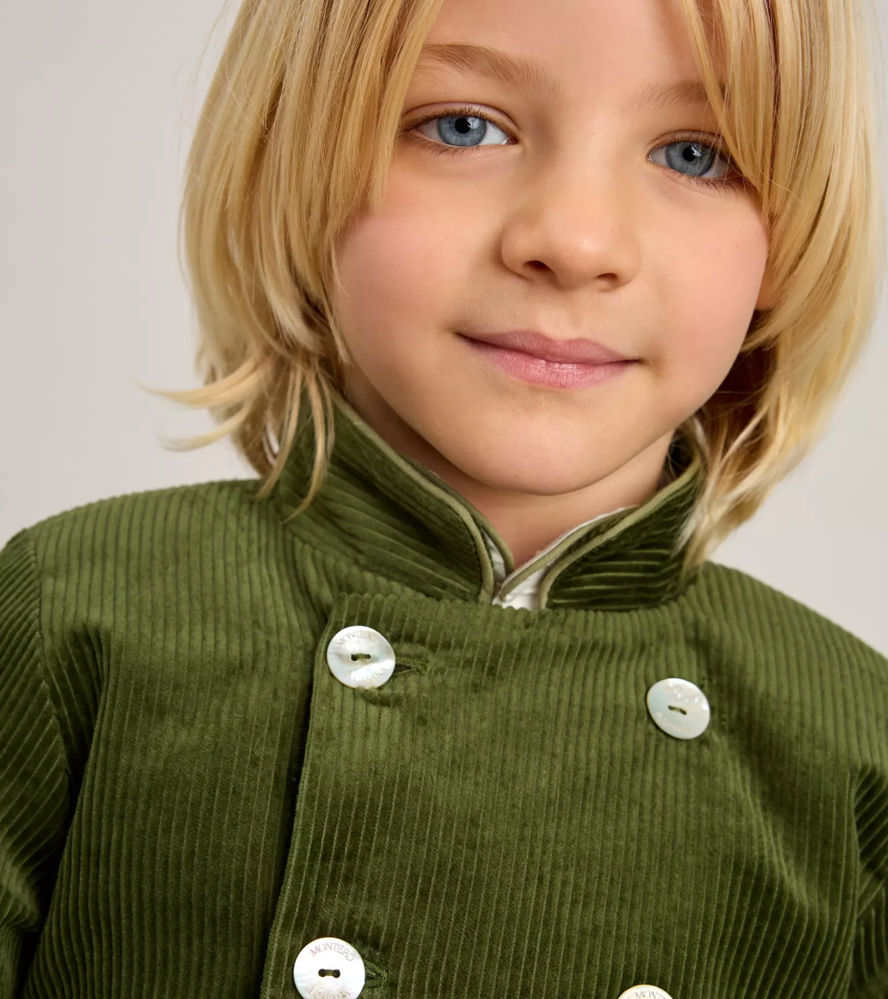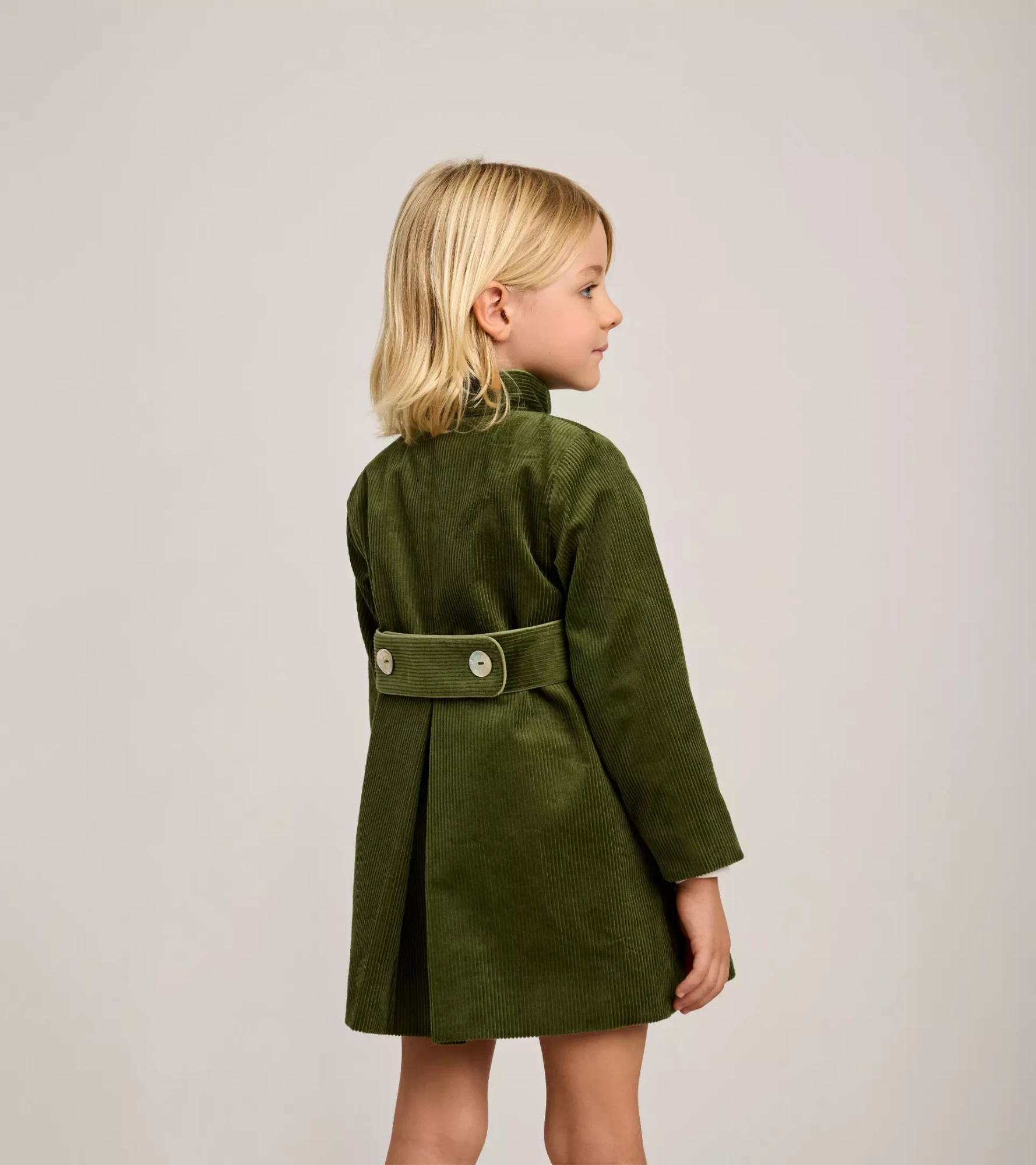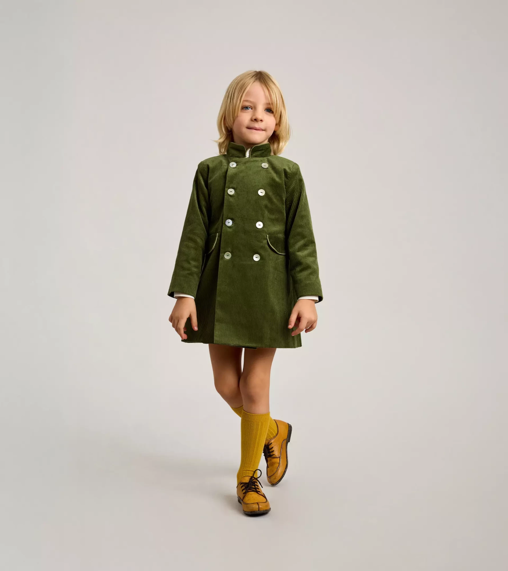 Abrigo clásico de niño, en tejido de pana suave color verde kaki. Doble abotonadura. Cuello de tirilla. Cinturón en la parte trasera y bolsillos de adornos en el delantero.