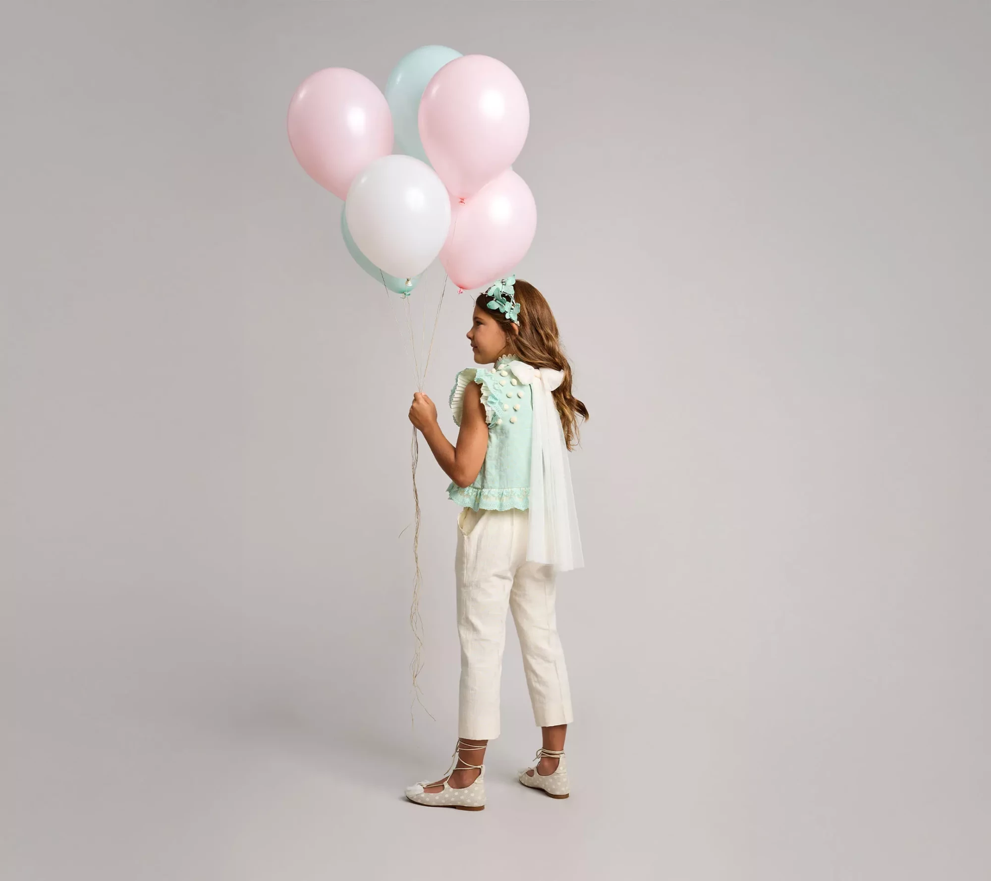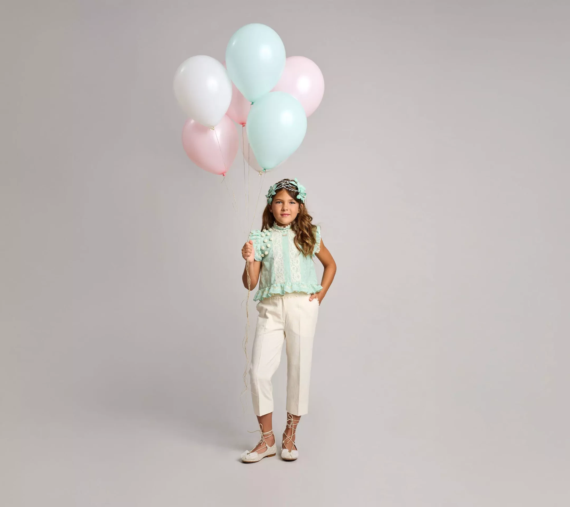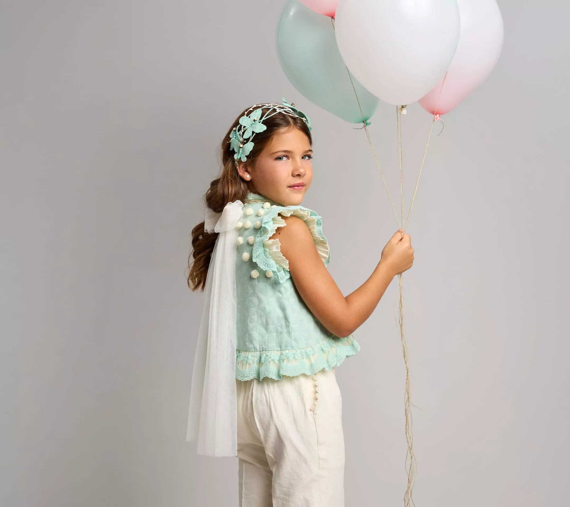 Camisa suelta en tejido jacquard, abierta en espalda, mangas a la sisa y con adornos de madroños cosidos manualmente, acabada en un lazo en la espalda.