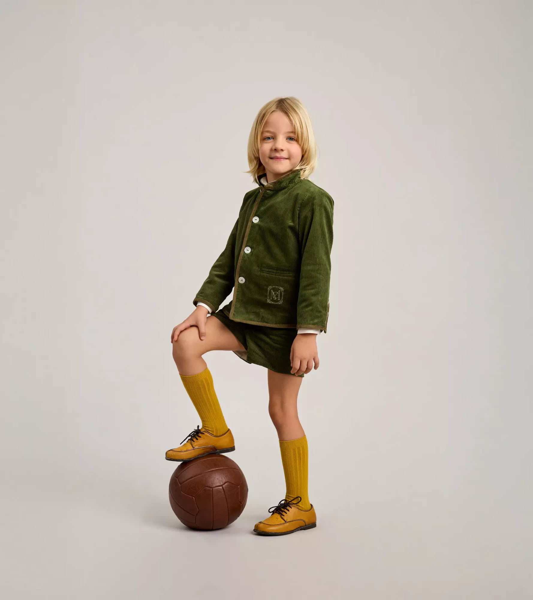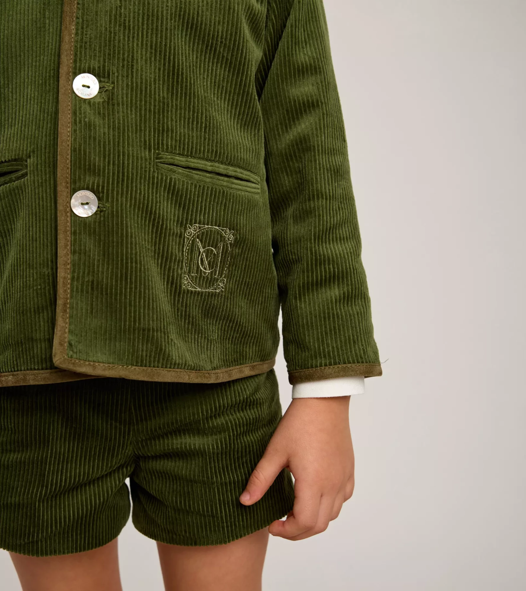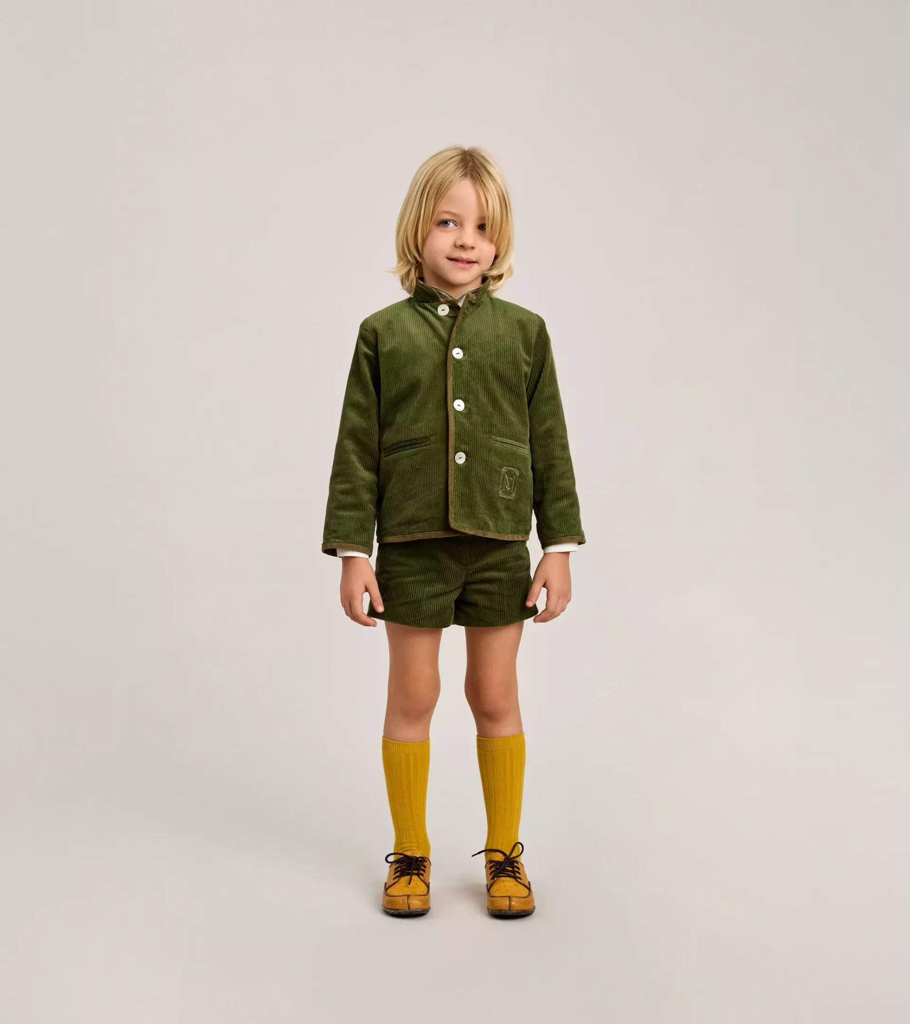 Chaqueta de niño, en tejido de pana suave de color verde. Corte recto, manga sastre, cuello mao y bolsillos de vivo en el delantero. Viveada en antelina al tono. Botones con el nombre de la marca y logo bordado en el delantero izquierdo debajo del bolsillo.