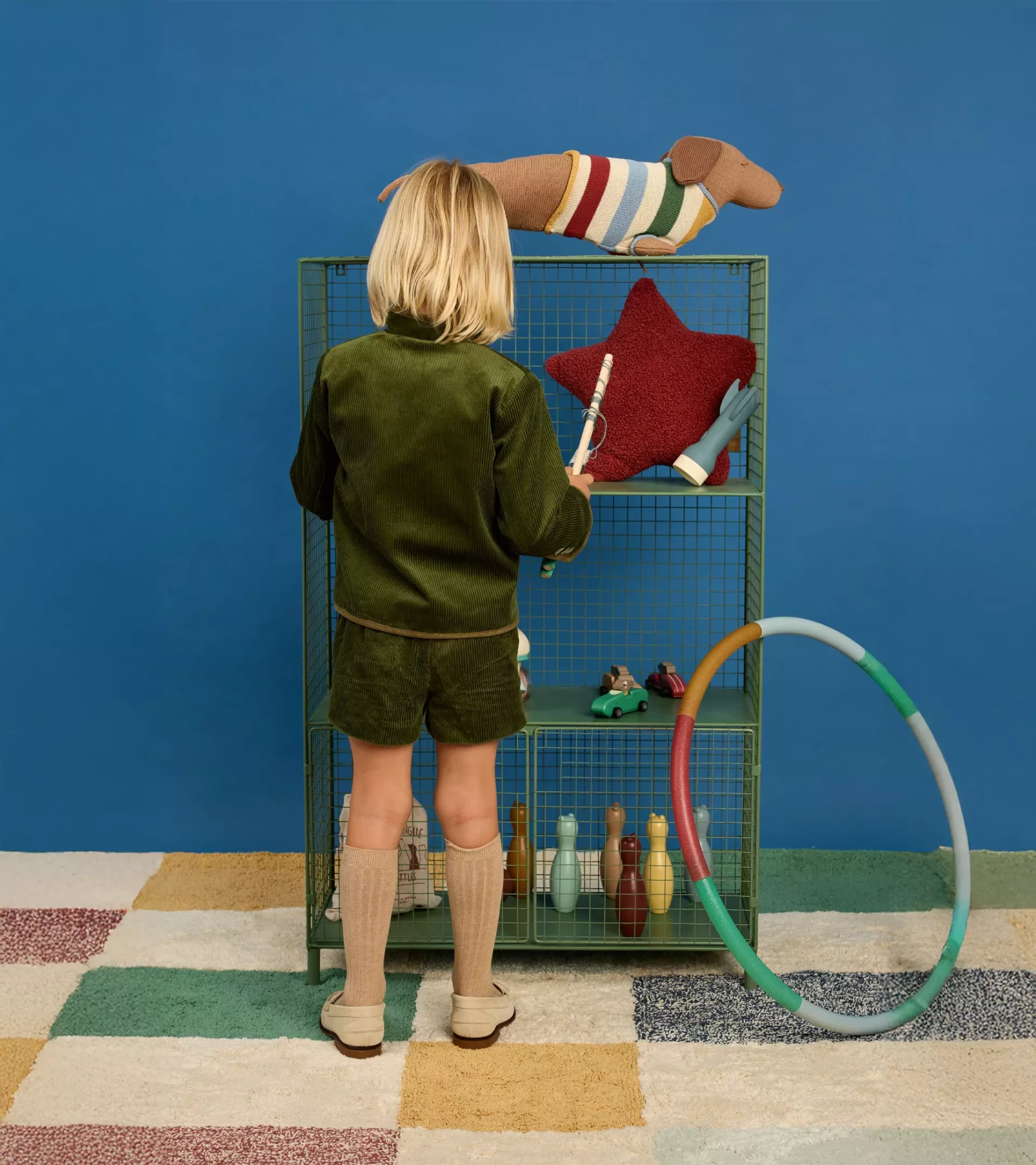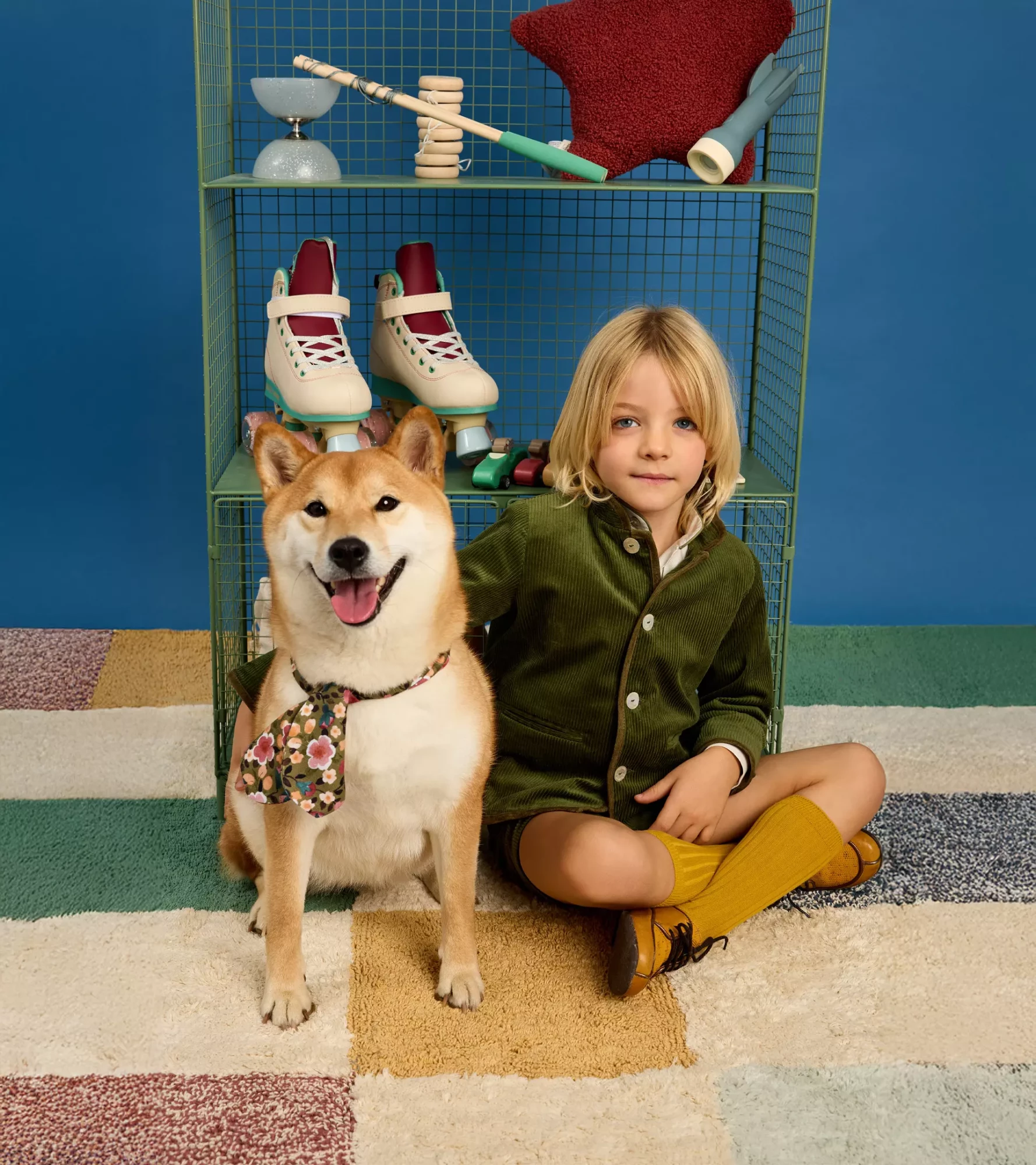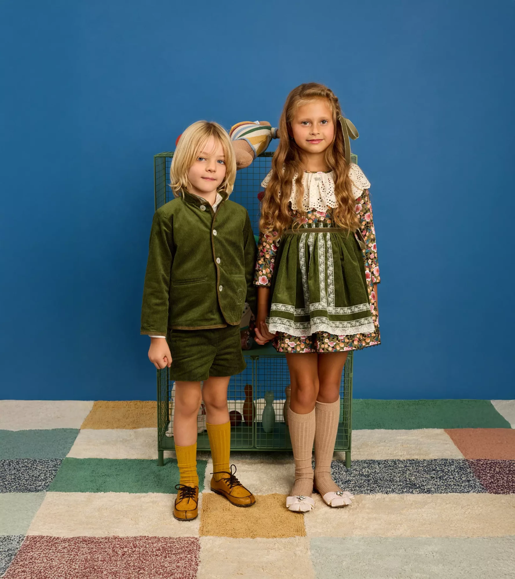 Chaqueta de niño, en tejido de pana suave de color verde. Corte recto, manga sastre, cuello mao y bolsillos de vivo en el delantero. Viveada en antelina al tono. Botones con el nombre de la marca y logo bordado en el delantero izquierdo debajo del bolsillo.