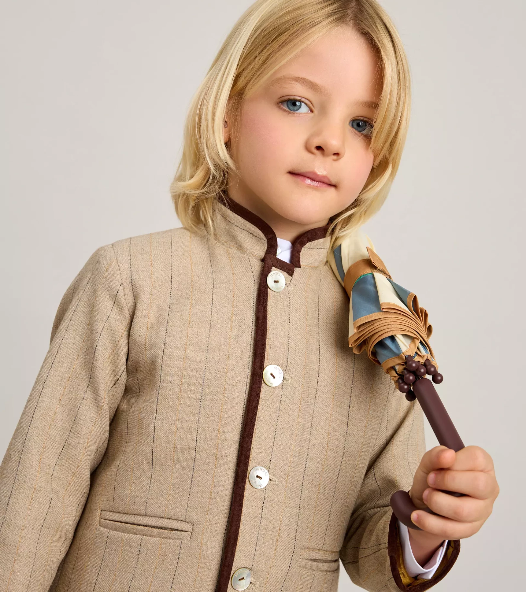 Chaqueta de niño, en tejido de espiga y rayas , en color topo y vivos de antelina en color marrón. Chaqueta de corte recto, con bolsillos de vivos en el delantero y bordado de logo de la marca debajo del bolsillo izquierdo. Manga sastre, con botones y vivo de antelina marrón. Cuello de tirilla.