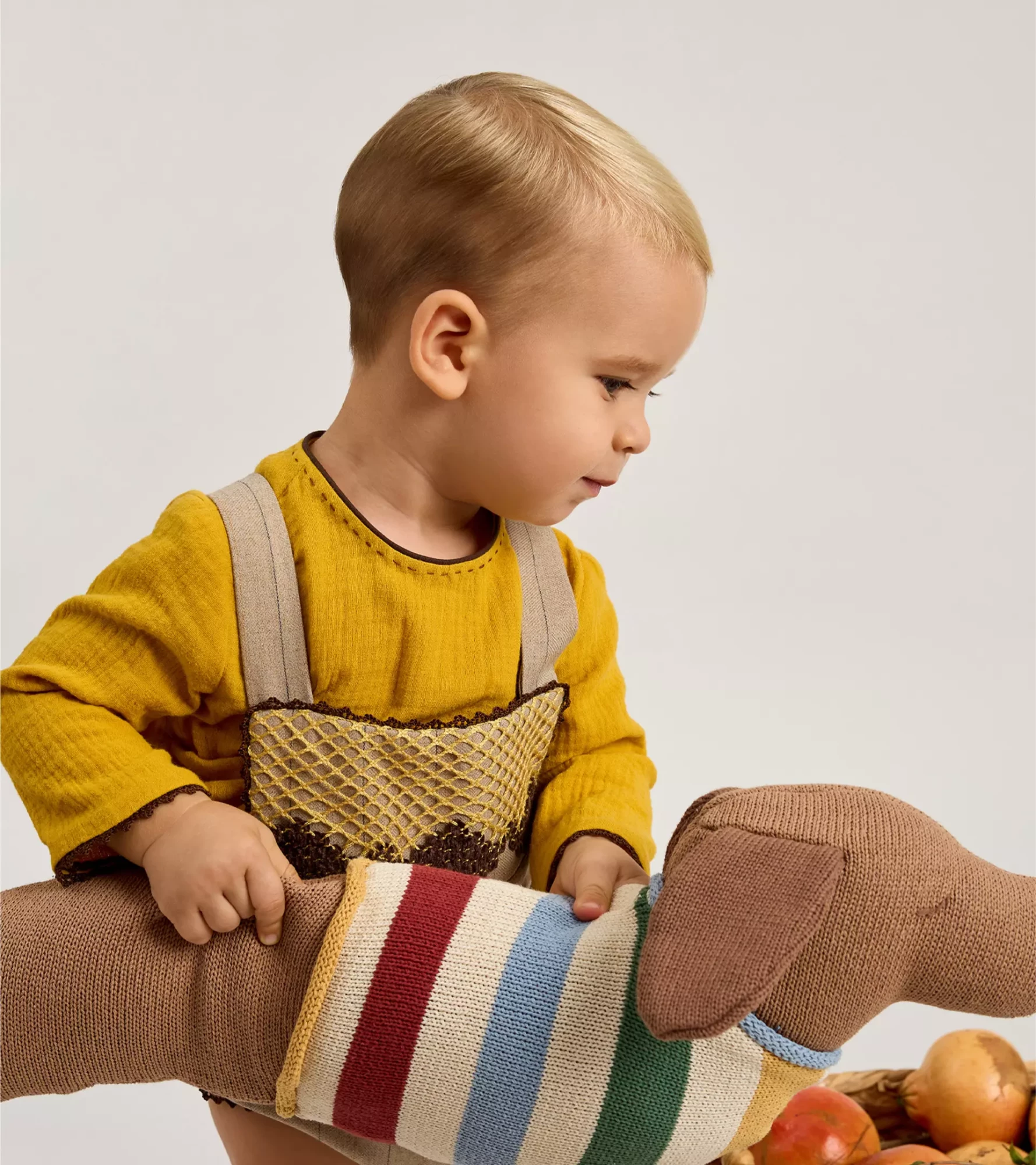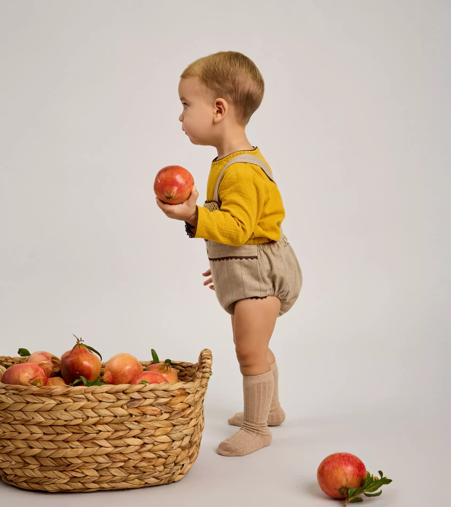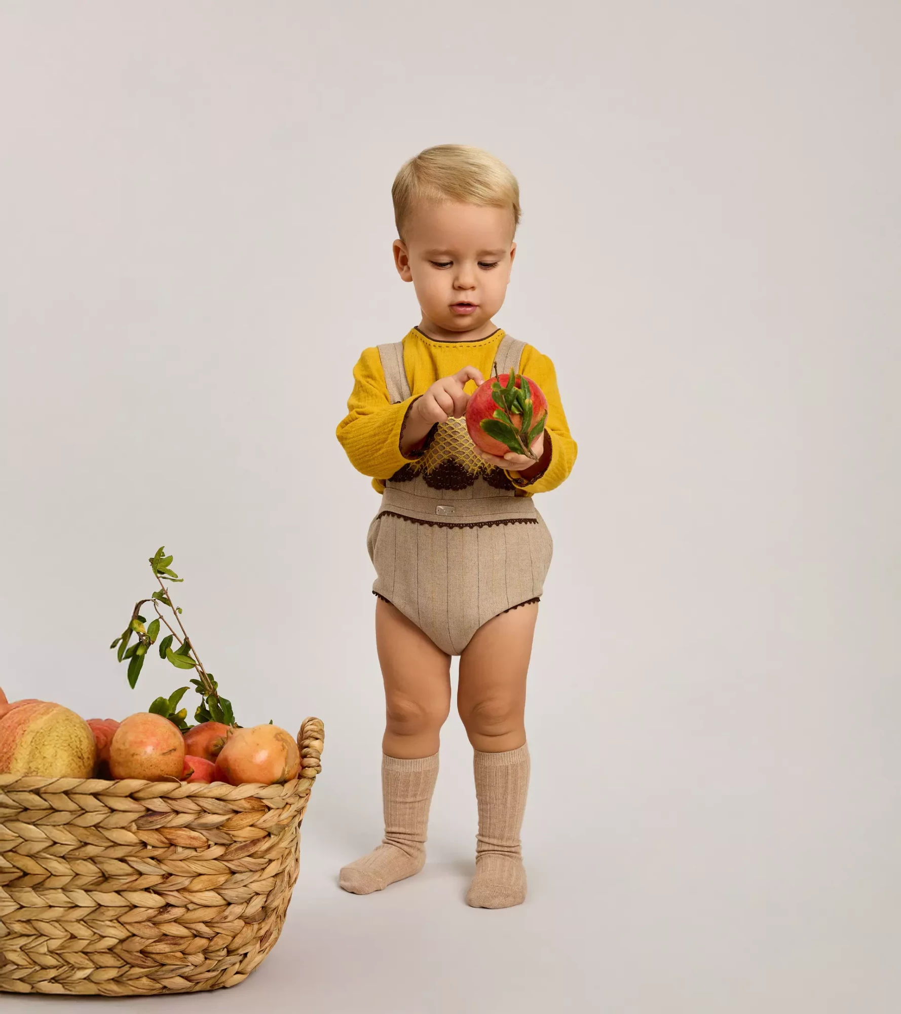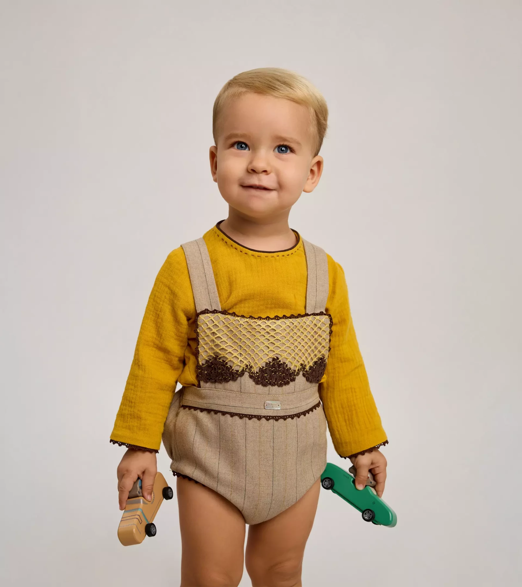 Conjunto de niño de dos piezas, en espiga y rayas en color topo la ranita de peto y tirantes y en algodón orgánico mostaza la camisa. Peto adornado en lana y guipur marrón. Camisa abotonada en la espalda, vivo marrón en el escote y mangas largas.