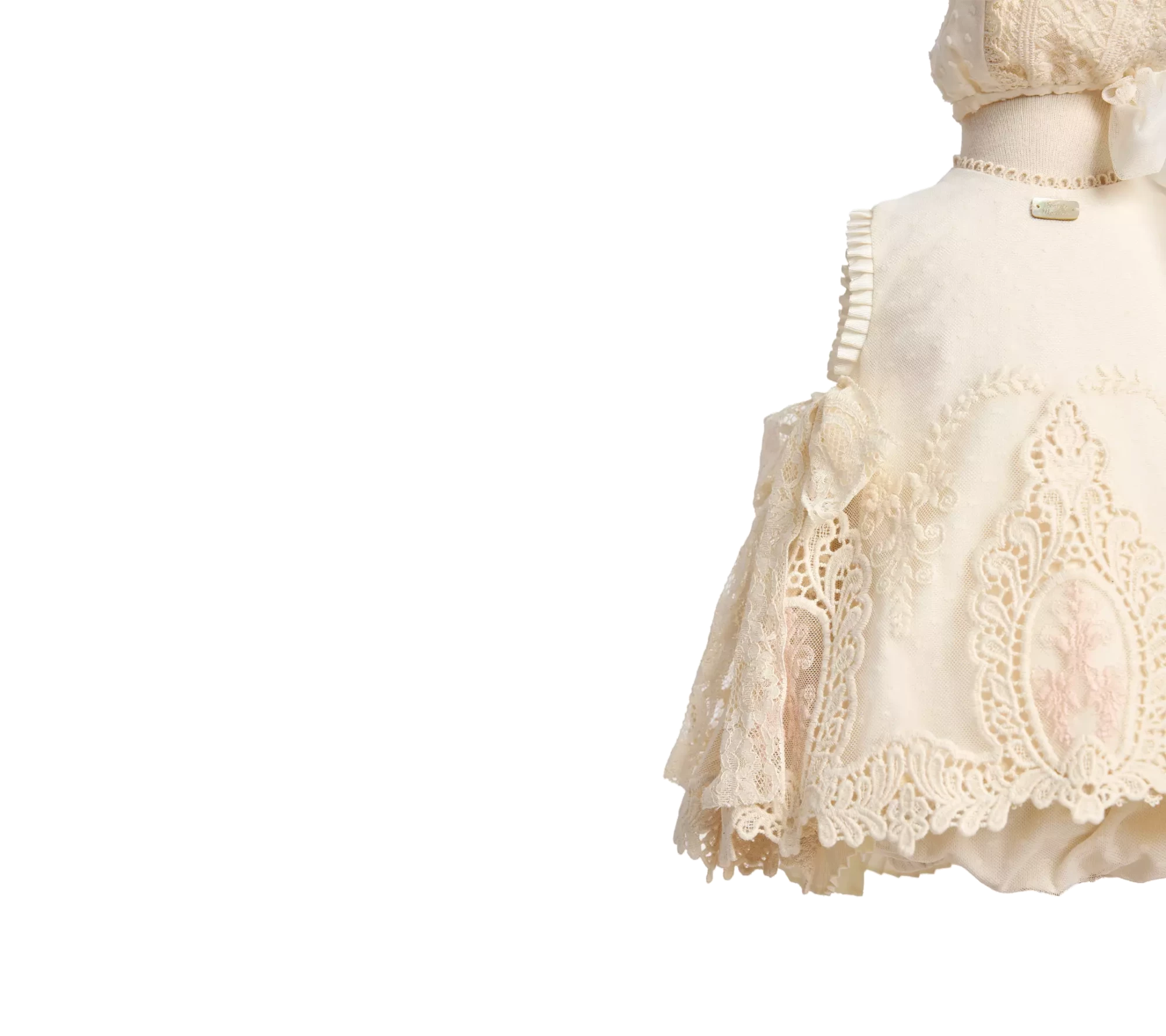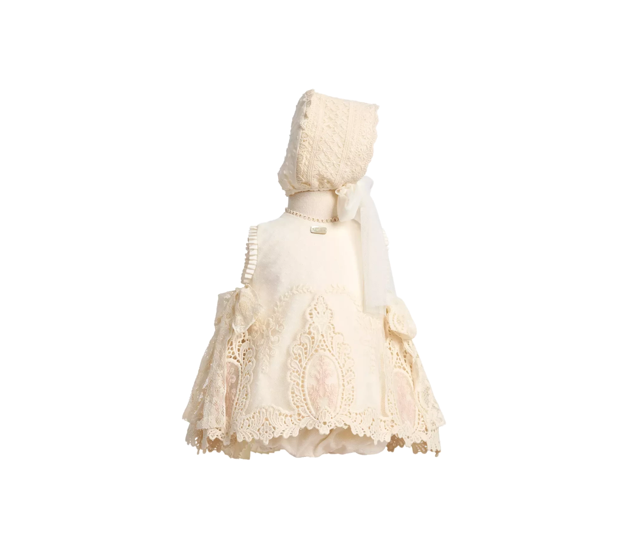 Conjunto de tres piezas en tejido de plumeti de algodón y tul bordado con aplicaciones de guipur, de una sola costura el vestido, abierto en la espalda, con mangas a la sisa y escote redondo. Vestido, braga y capota.