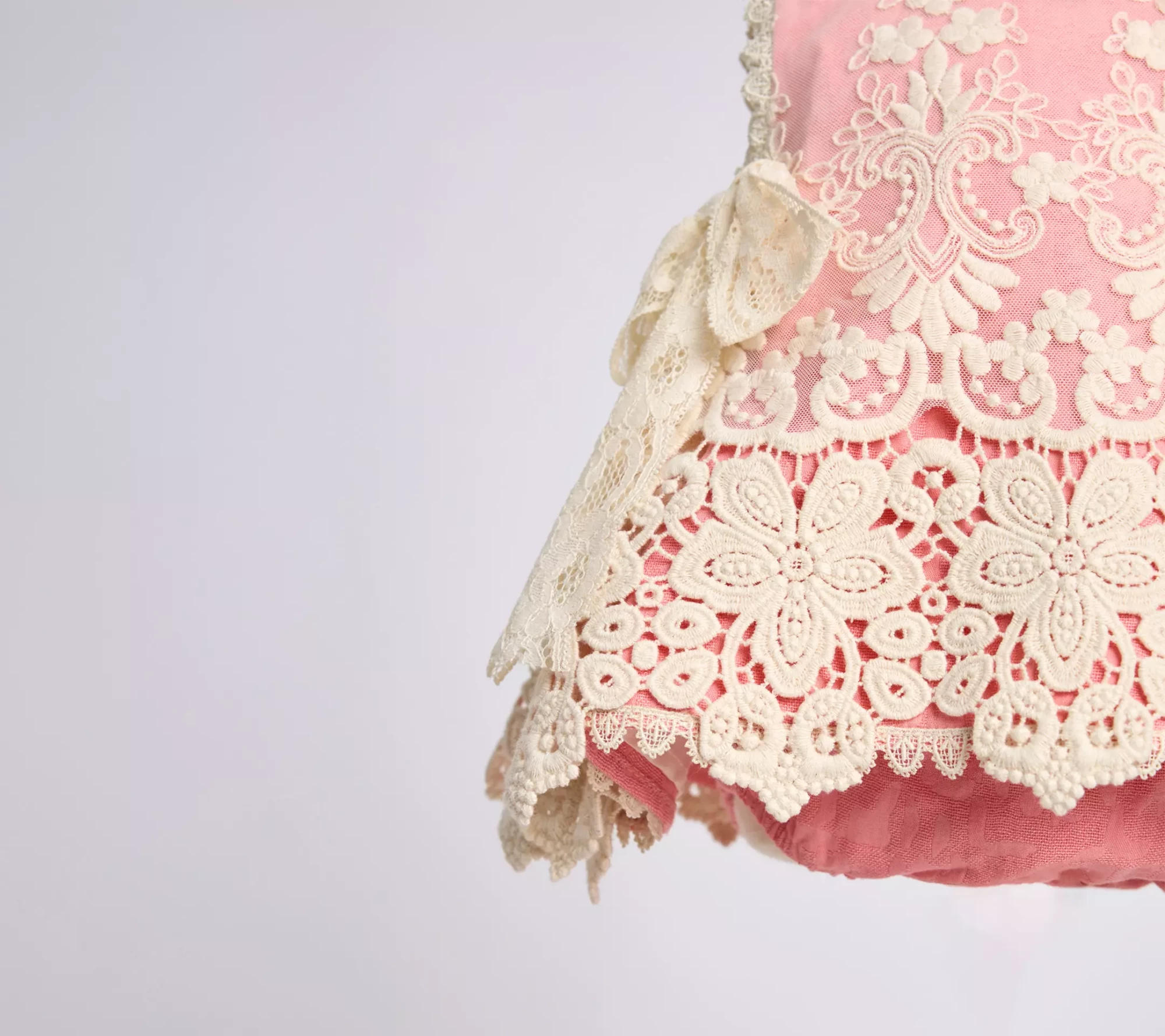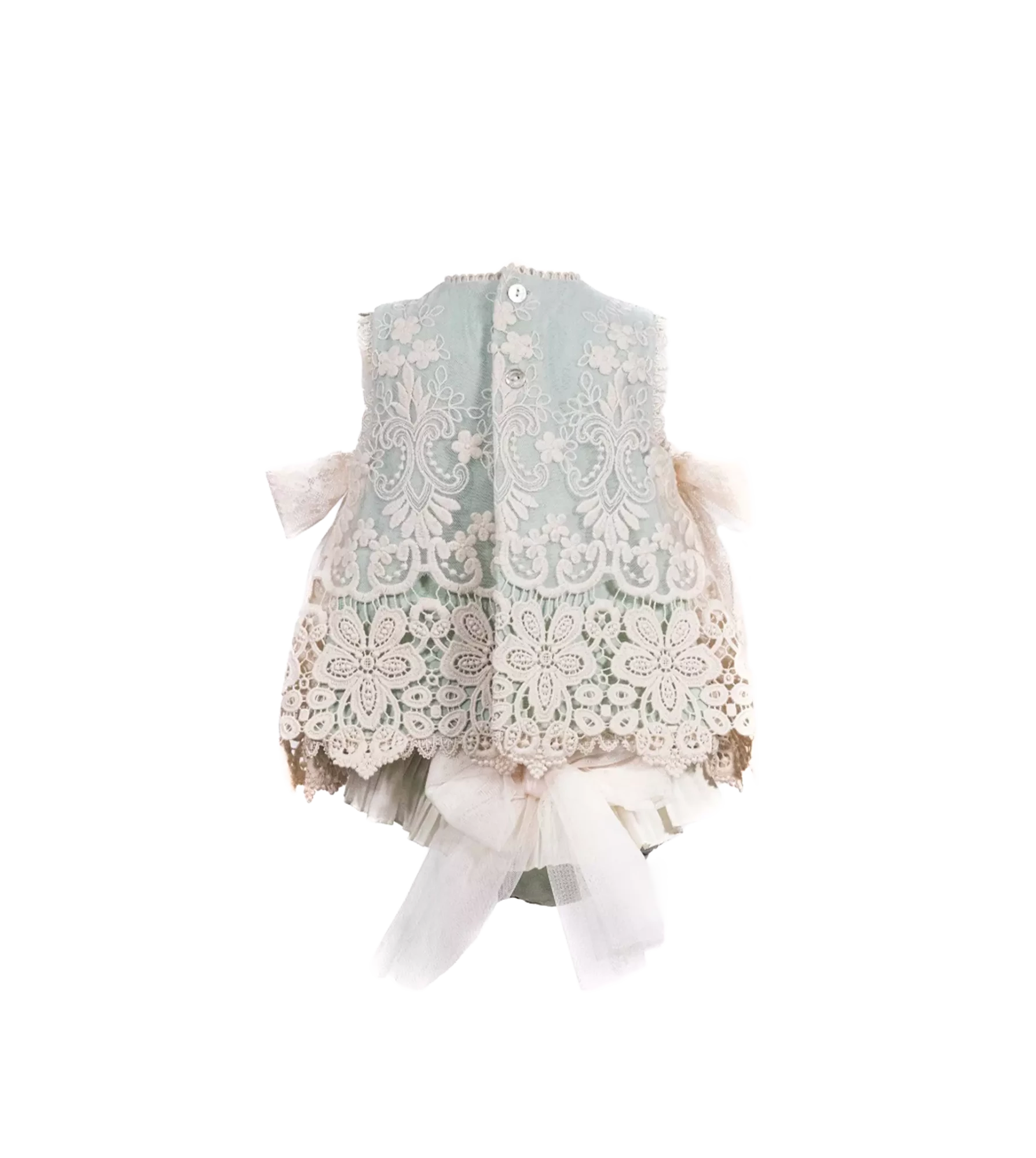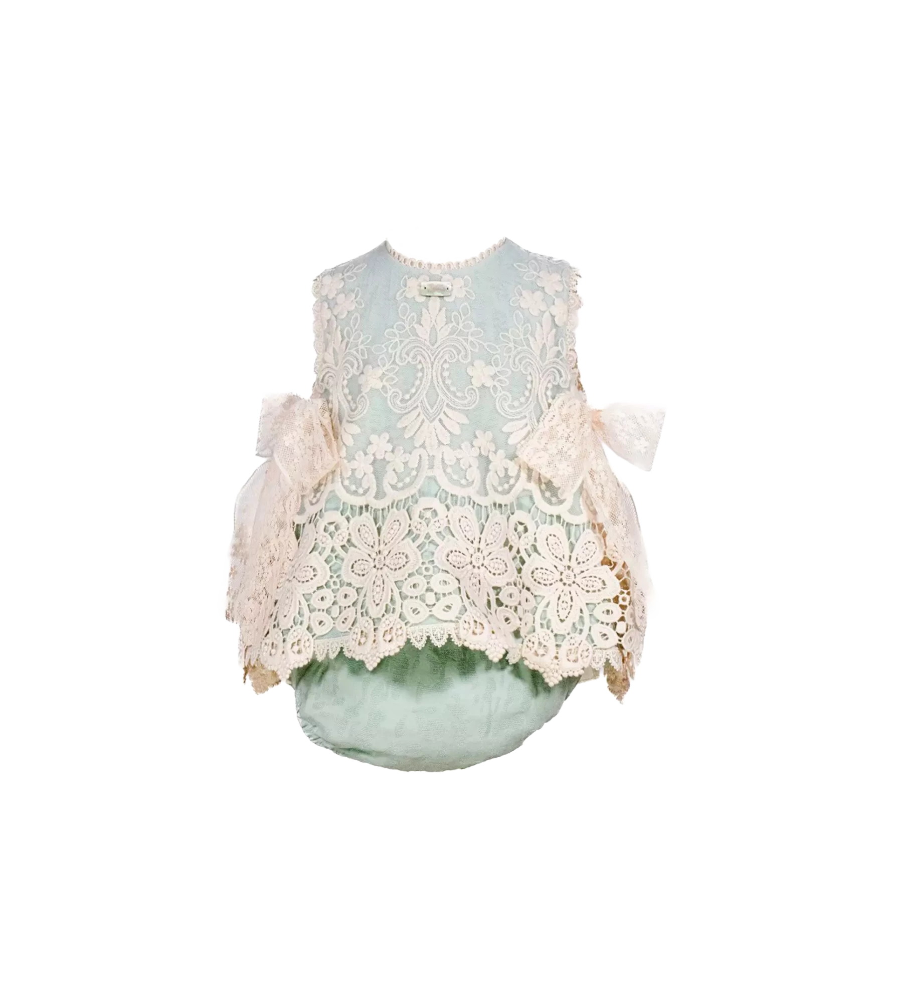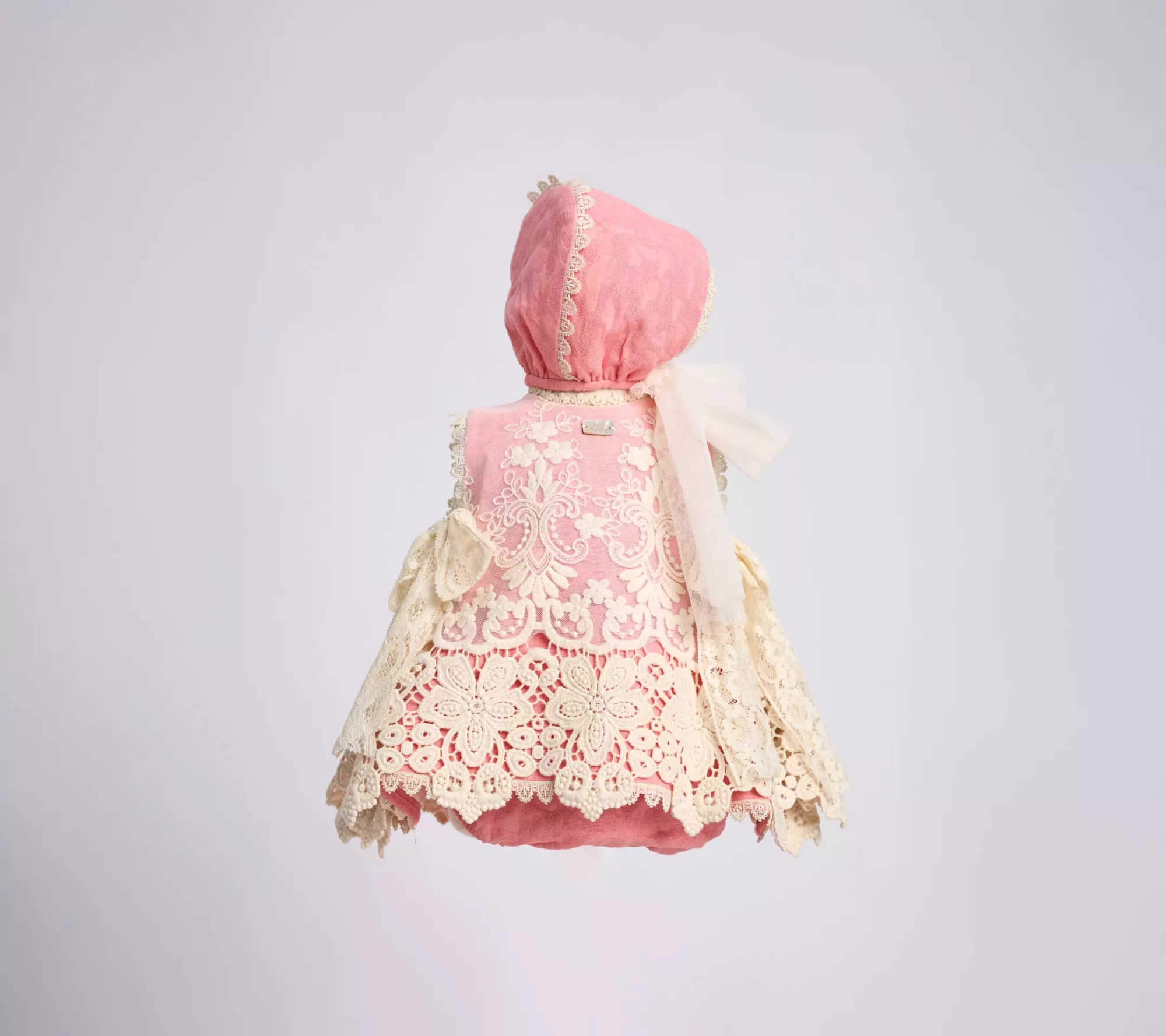 Conjunto de tres piezas en tejido de jacquard y tul bordado con guipur, con apertura en la espalda y mangas a la sisa. Vestido, braga y capota.