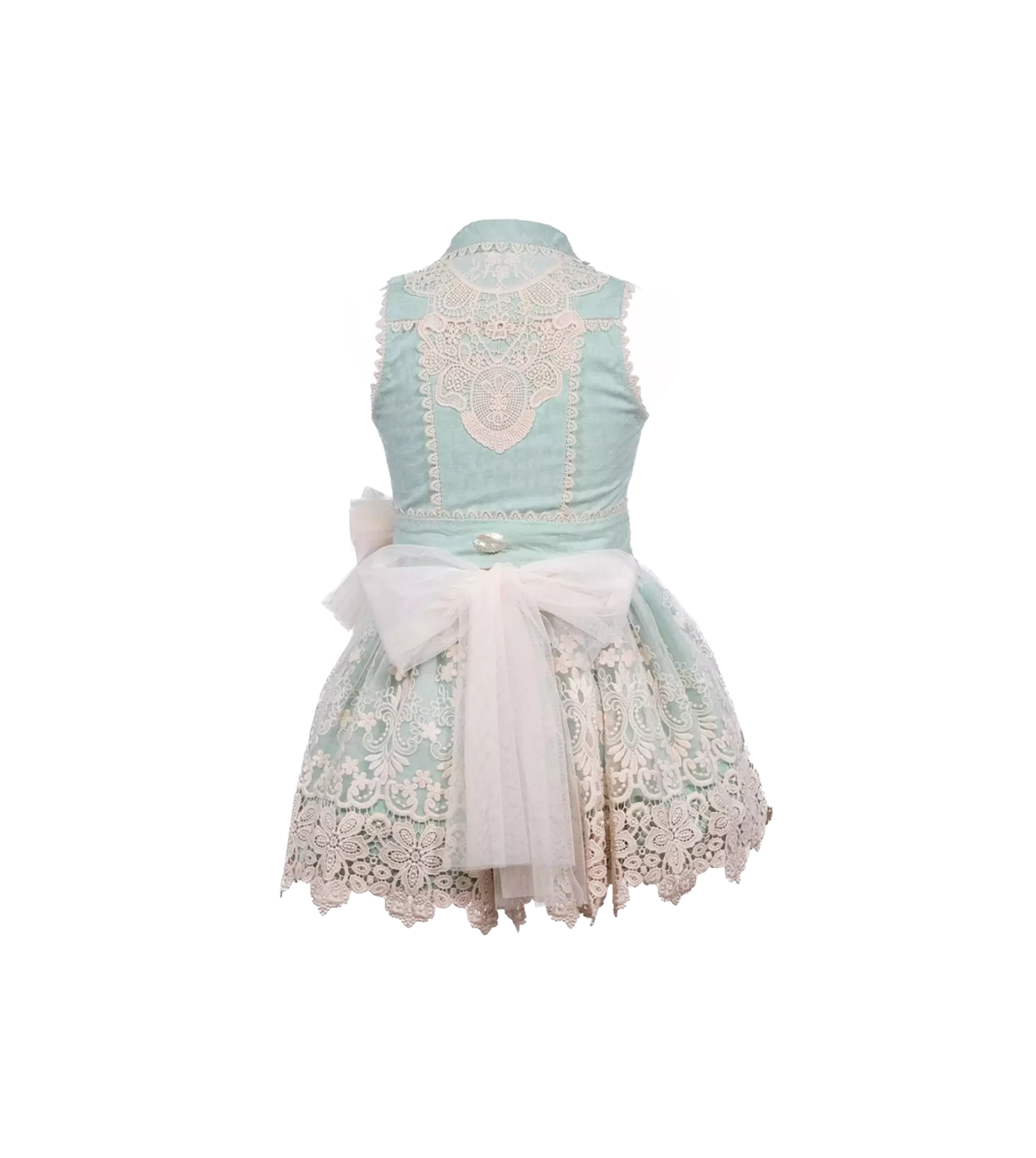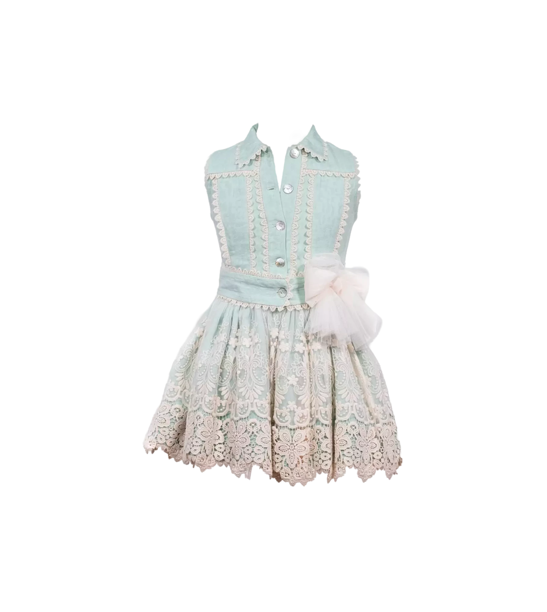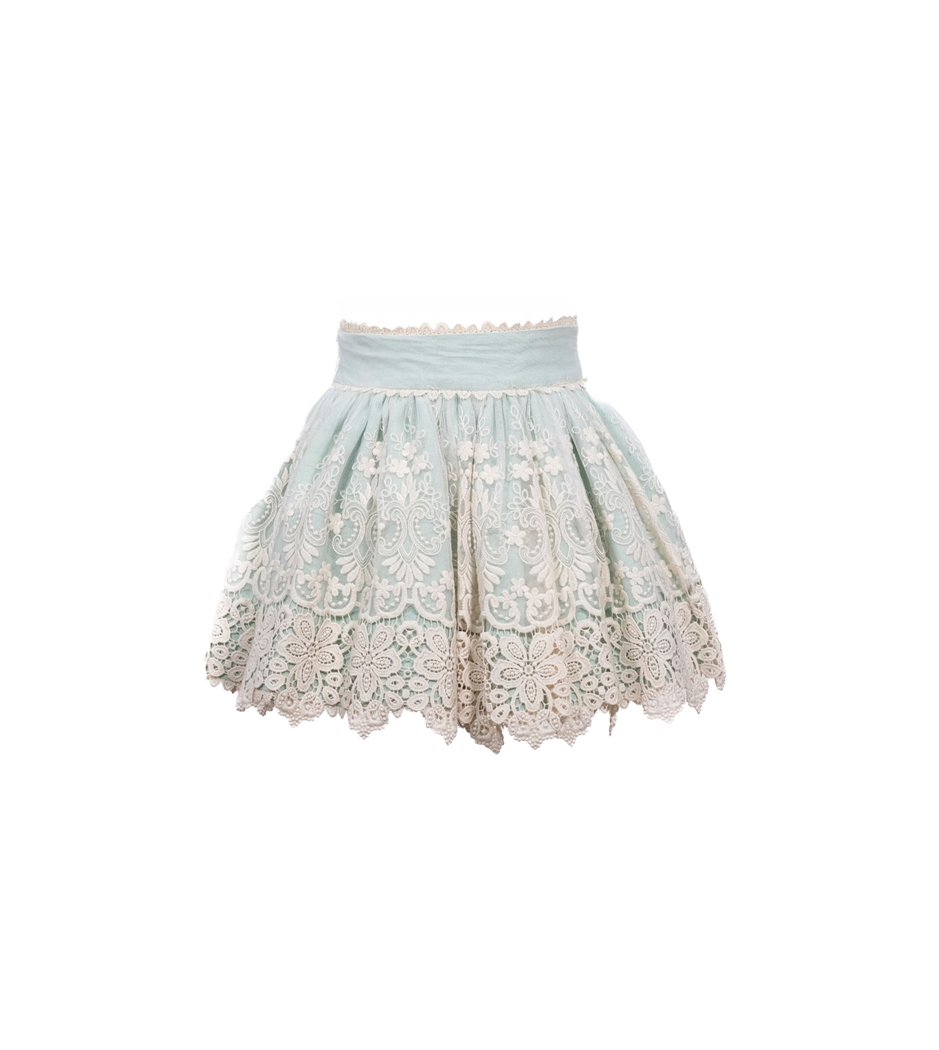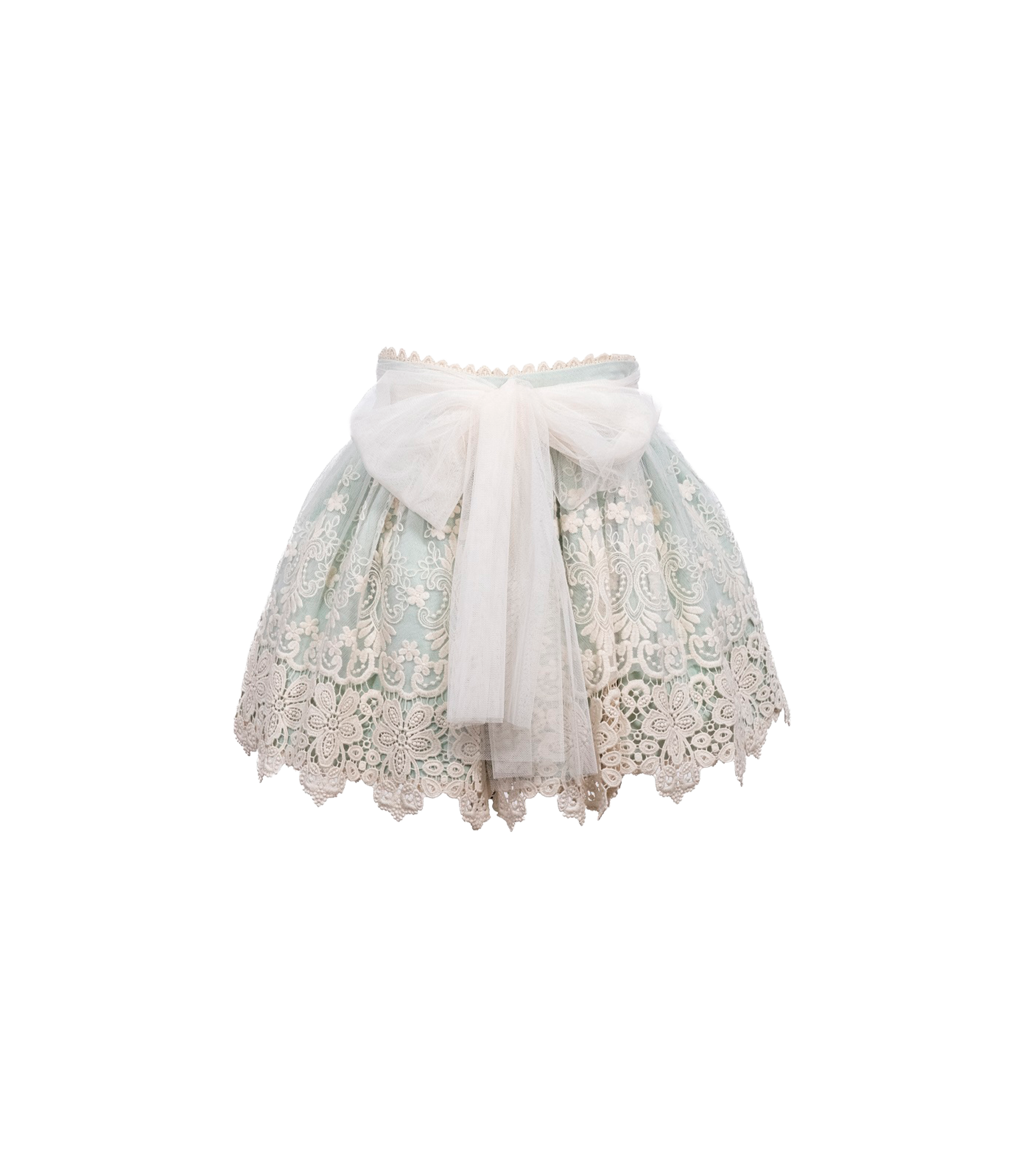 Falda en tejido jacquard y tul bordado con guipur, cintura con forma, cremallera lateral y lazo de tul en la espalda.