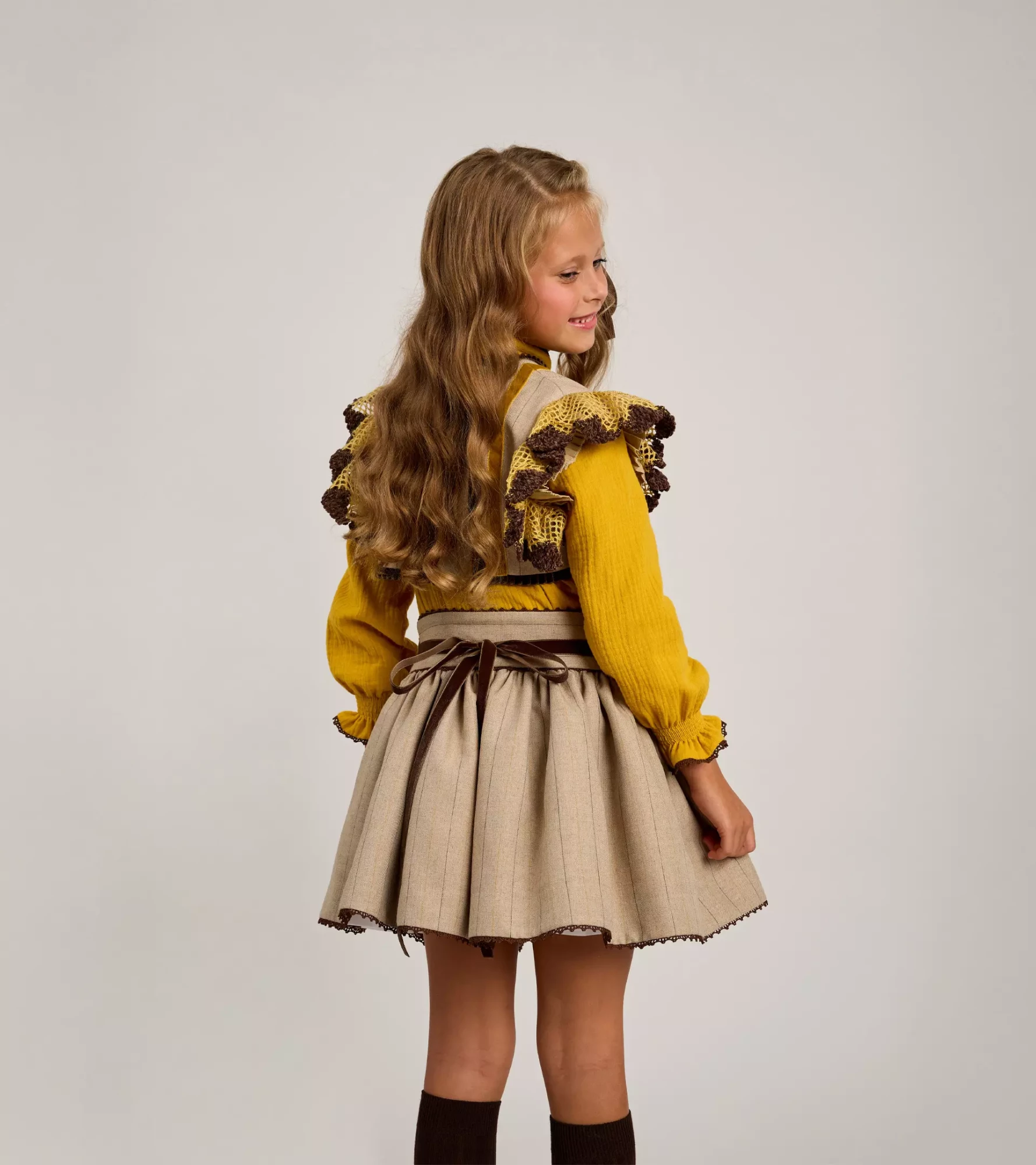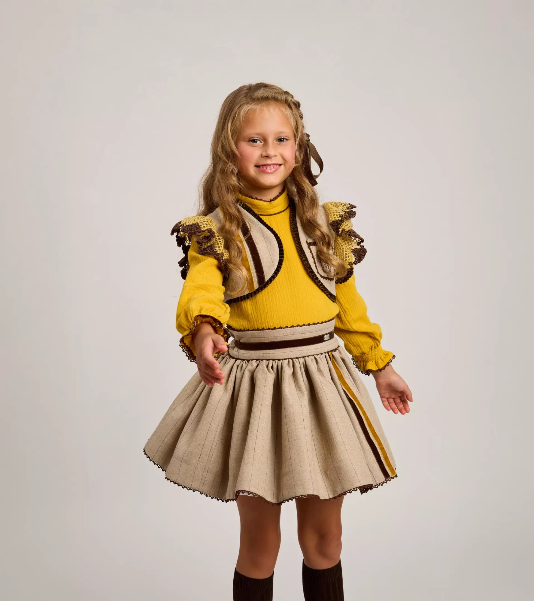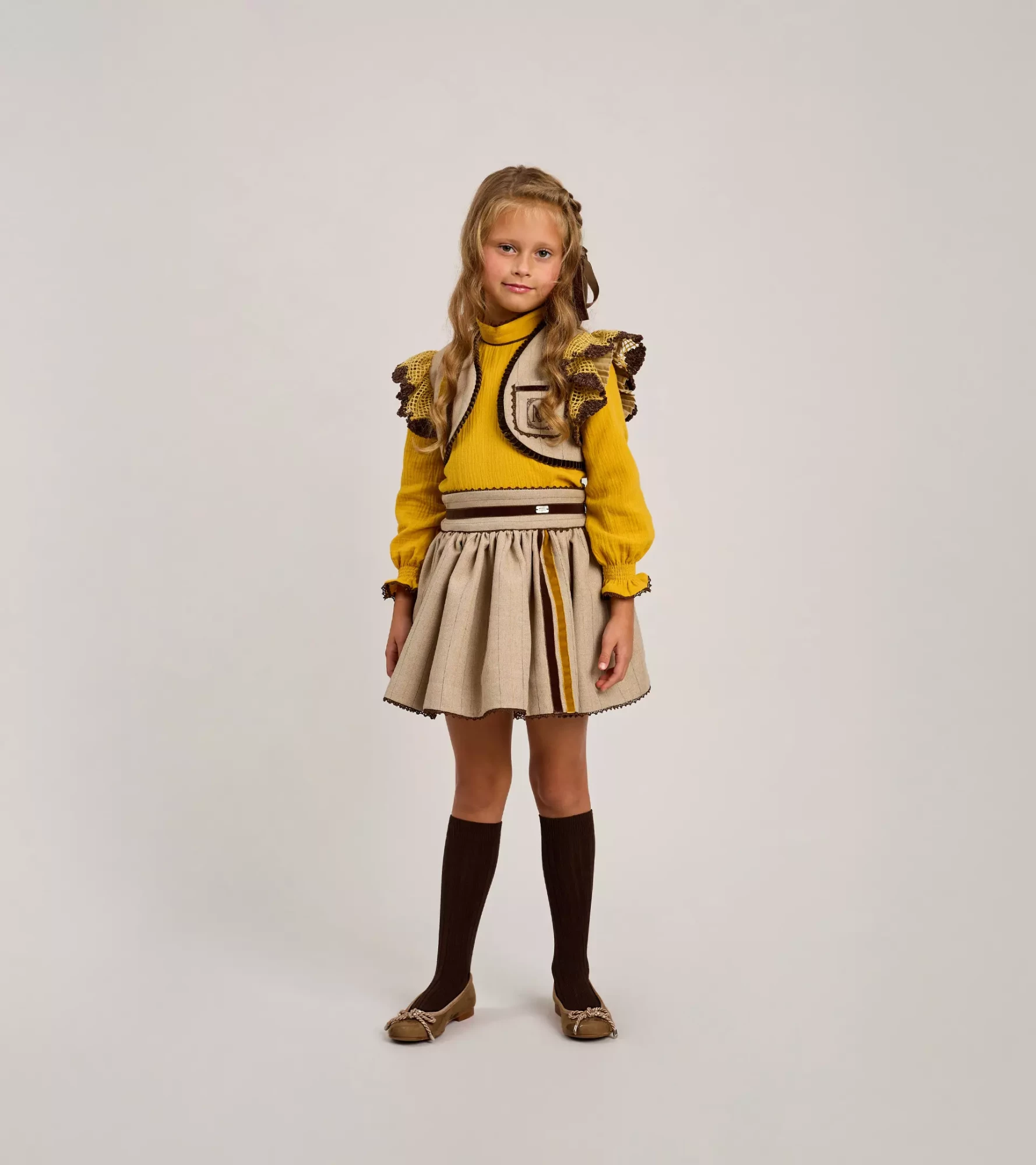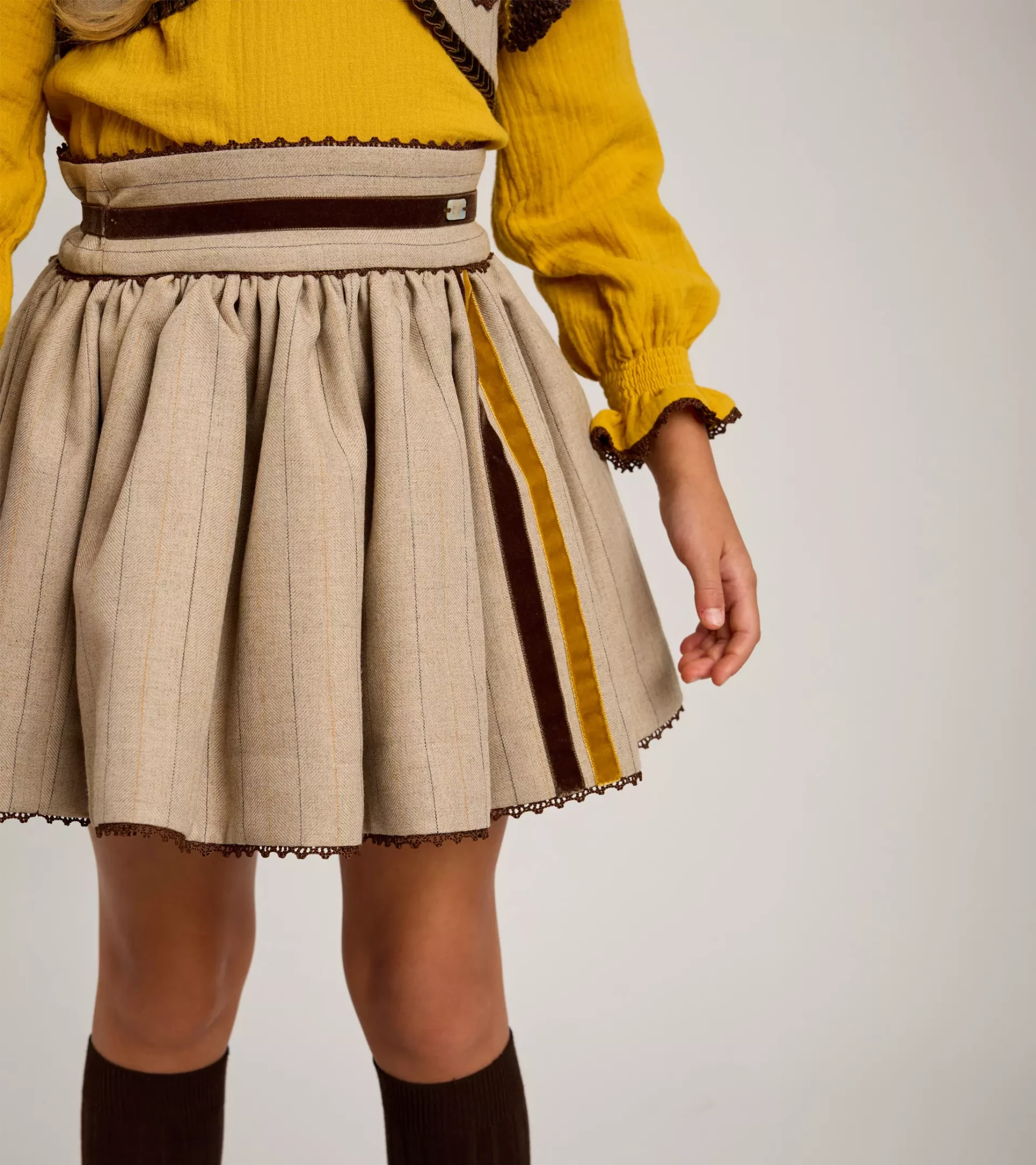 Falda de niña con vuelo, en tejido de espiga y rayas en color topo, muy suave. Adornada en el lado izquierdo del delantero con dos cintas de terciopelo en color mostaza y marrón. Museta adornada con cinta de terciopelo marrón, terminando en un lazo en la espalda. Tiene cremallera en el lateral.