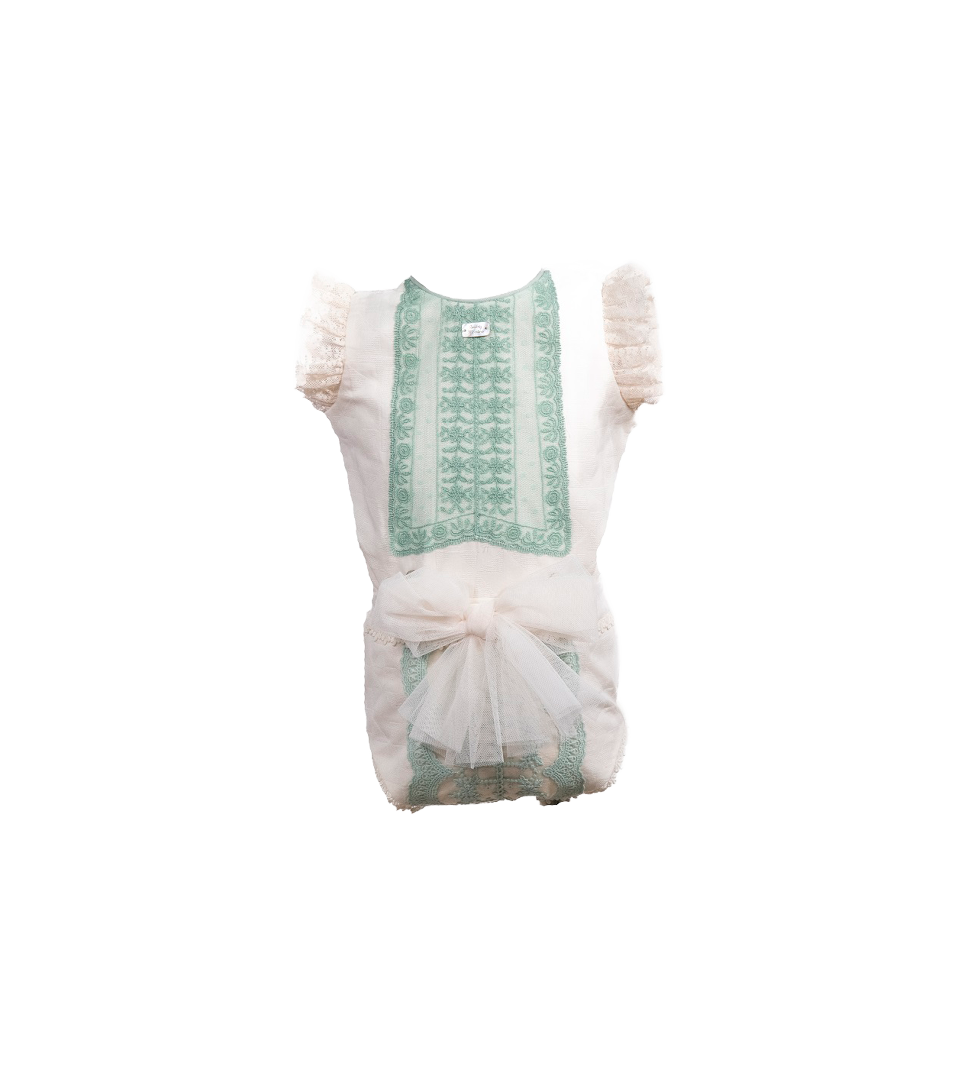 Conjunto de camisa y ranita en tejido jacquard, con aplicación en el delantero de la camisa , mangas a la sisa y lazo de adorno en el delantero de la ranita.