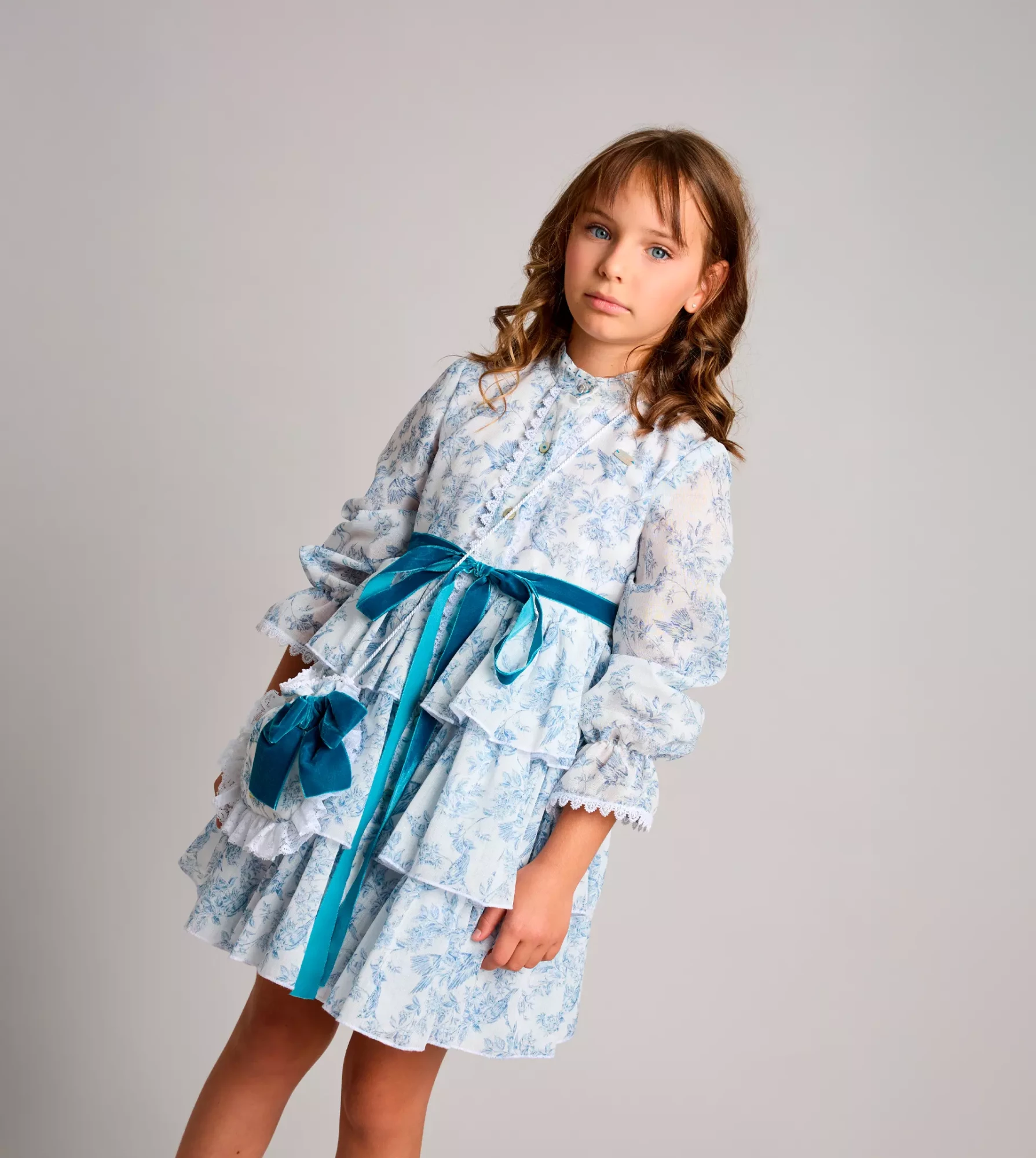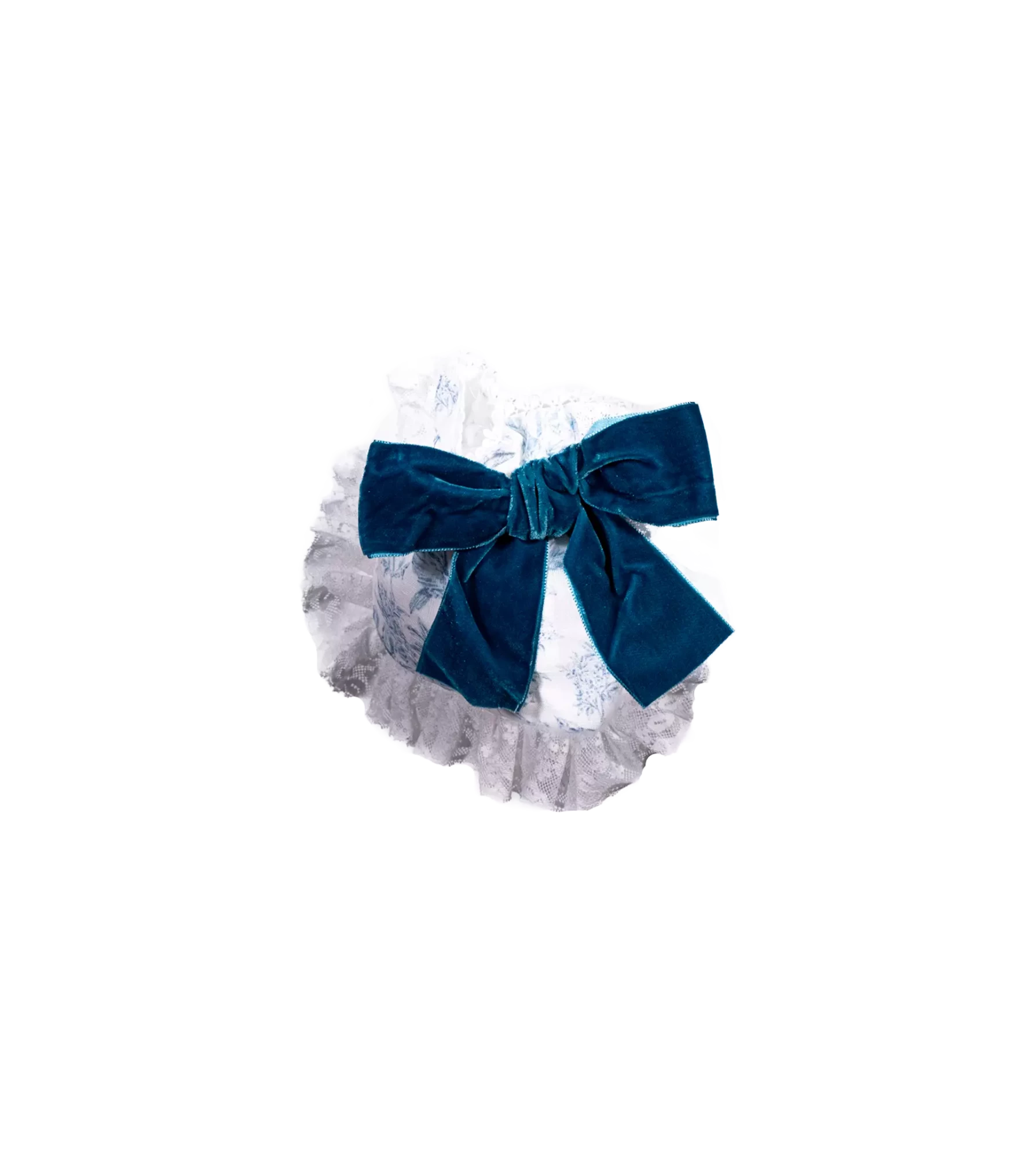 Bolso en tejido de hilo estampado, con volante de encaje y cordón para colgar.
