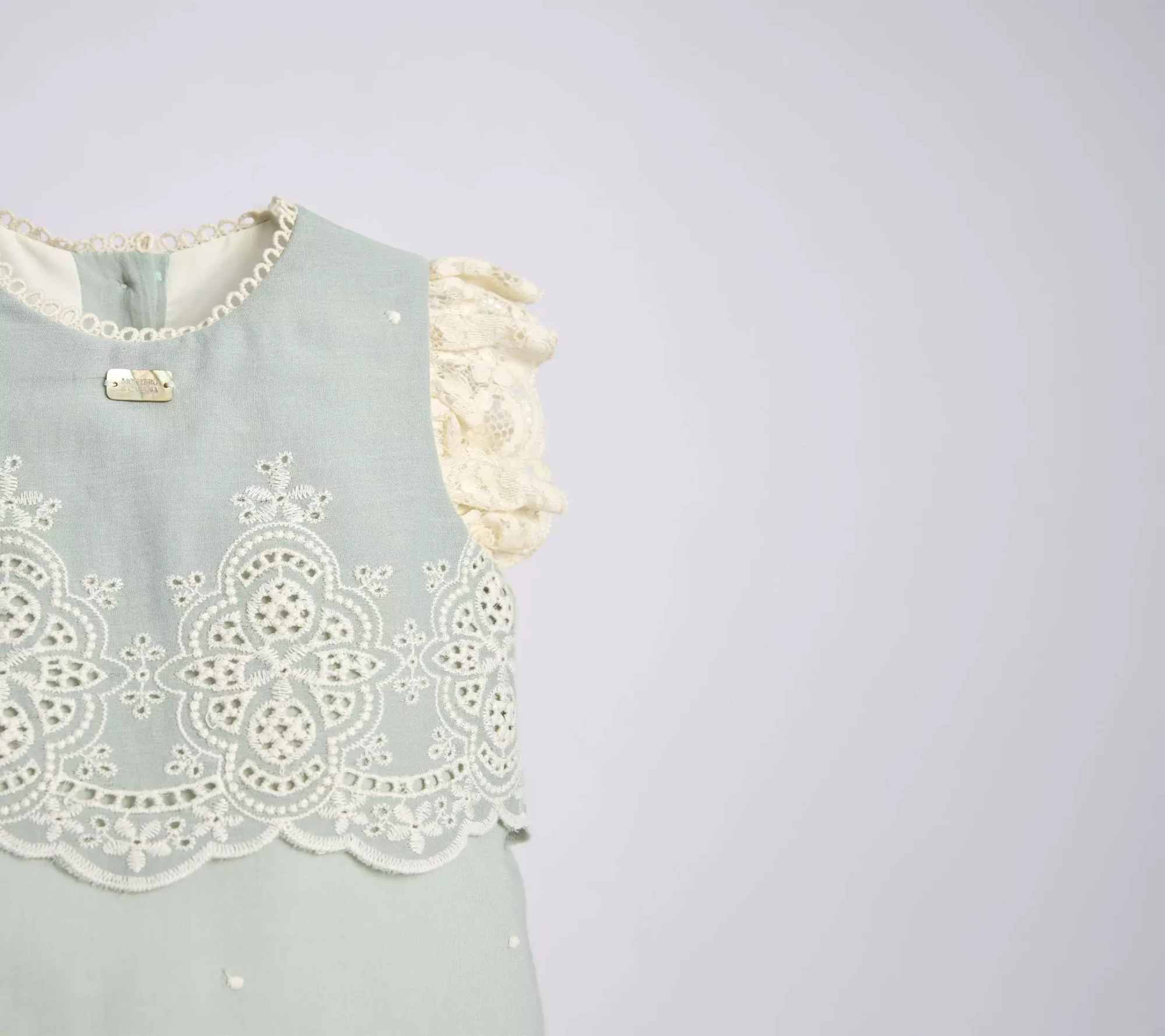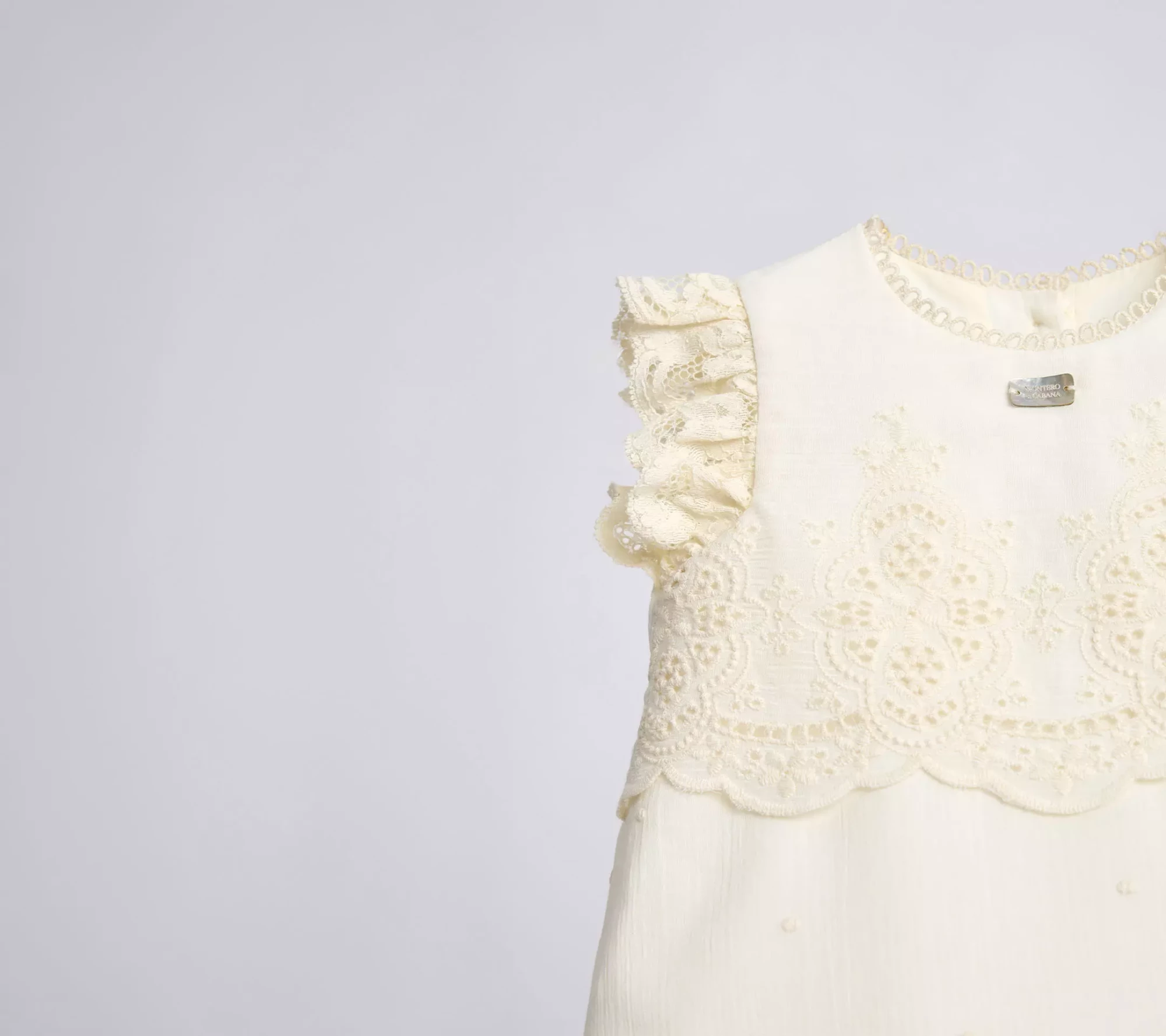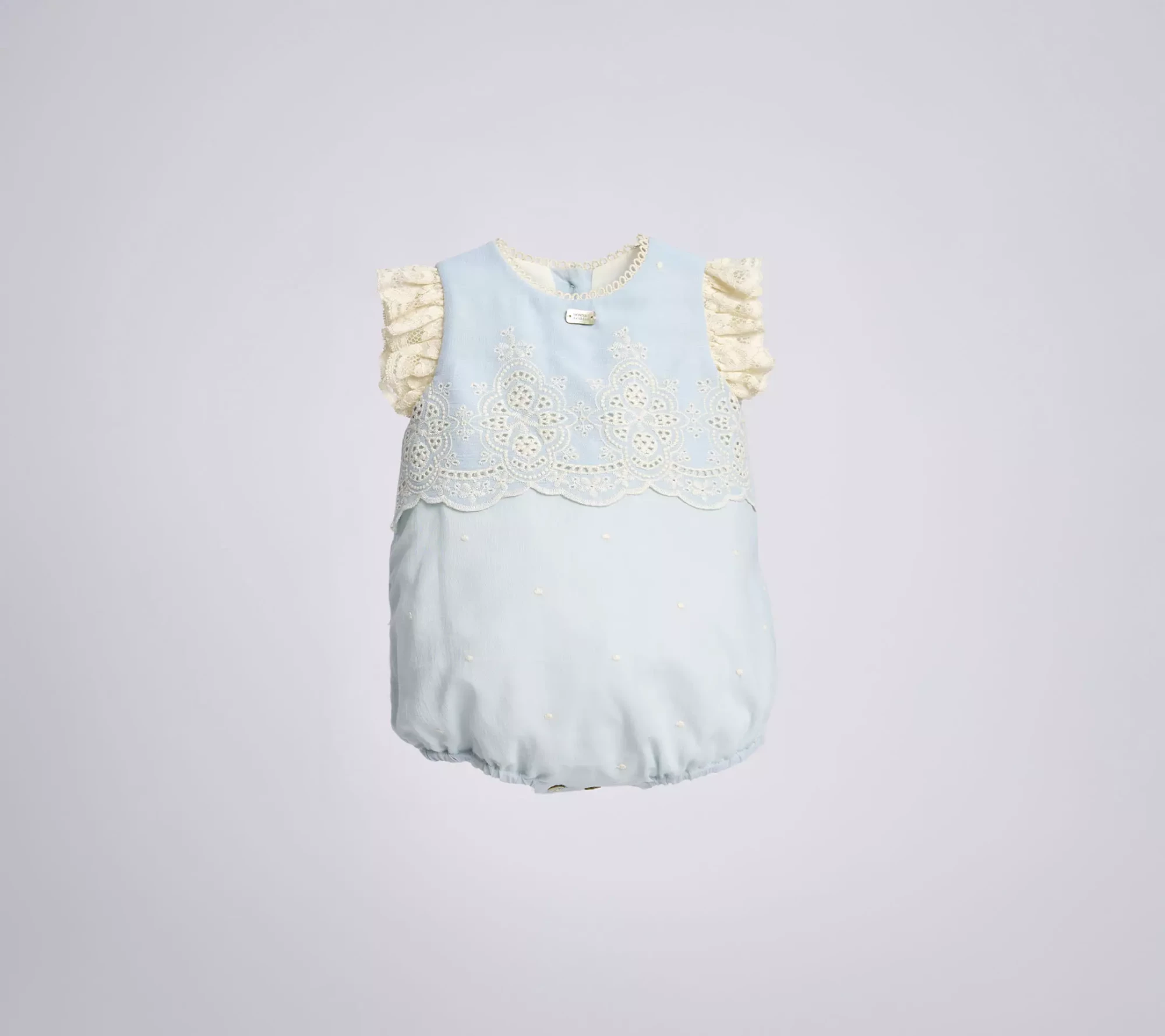 Pelele en manga de sisa, terminado en volante de tul bordado y delantero con galones de tul bordado.