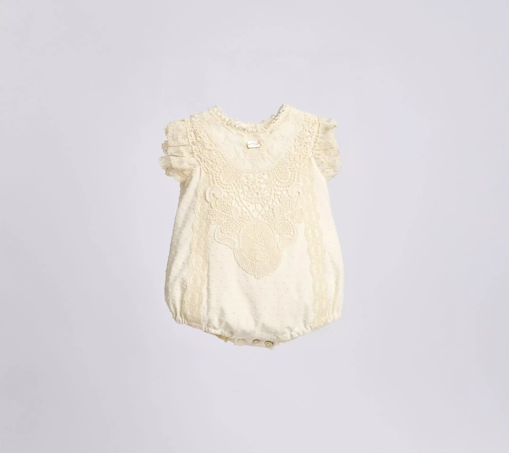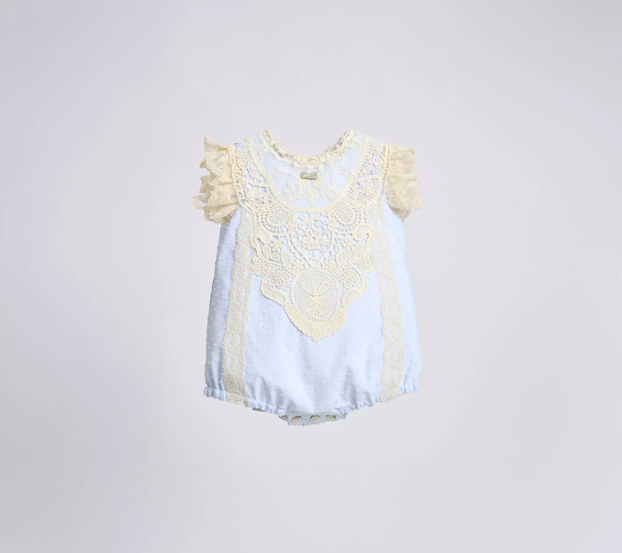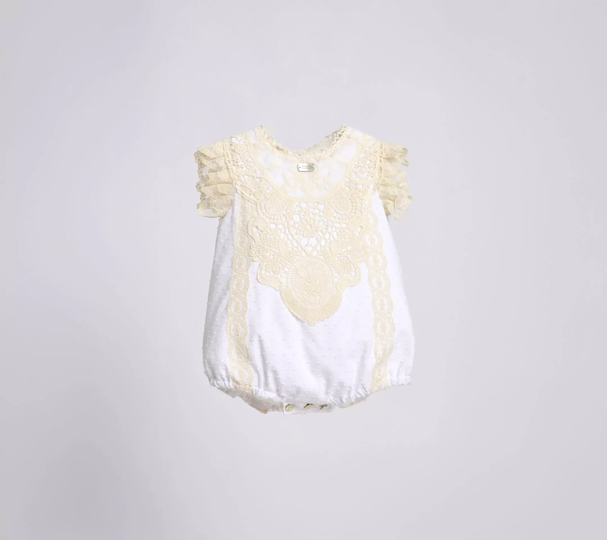 Pelele en manga de sisa, en plumeti de algodón, con aplicación delantera, terminado en volante de tul bordado y galón de tul bordado en espalda.