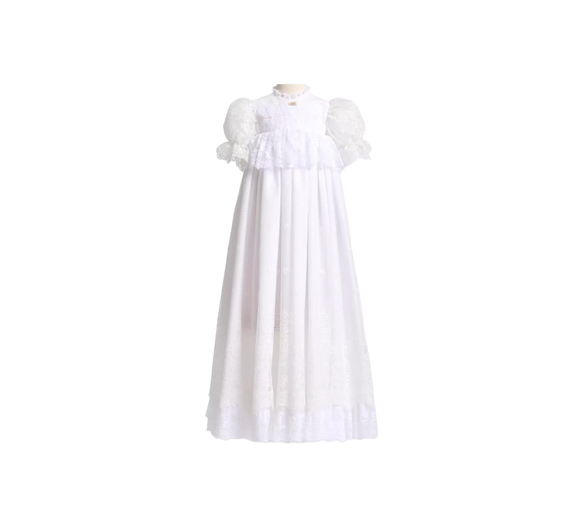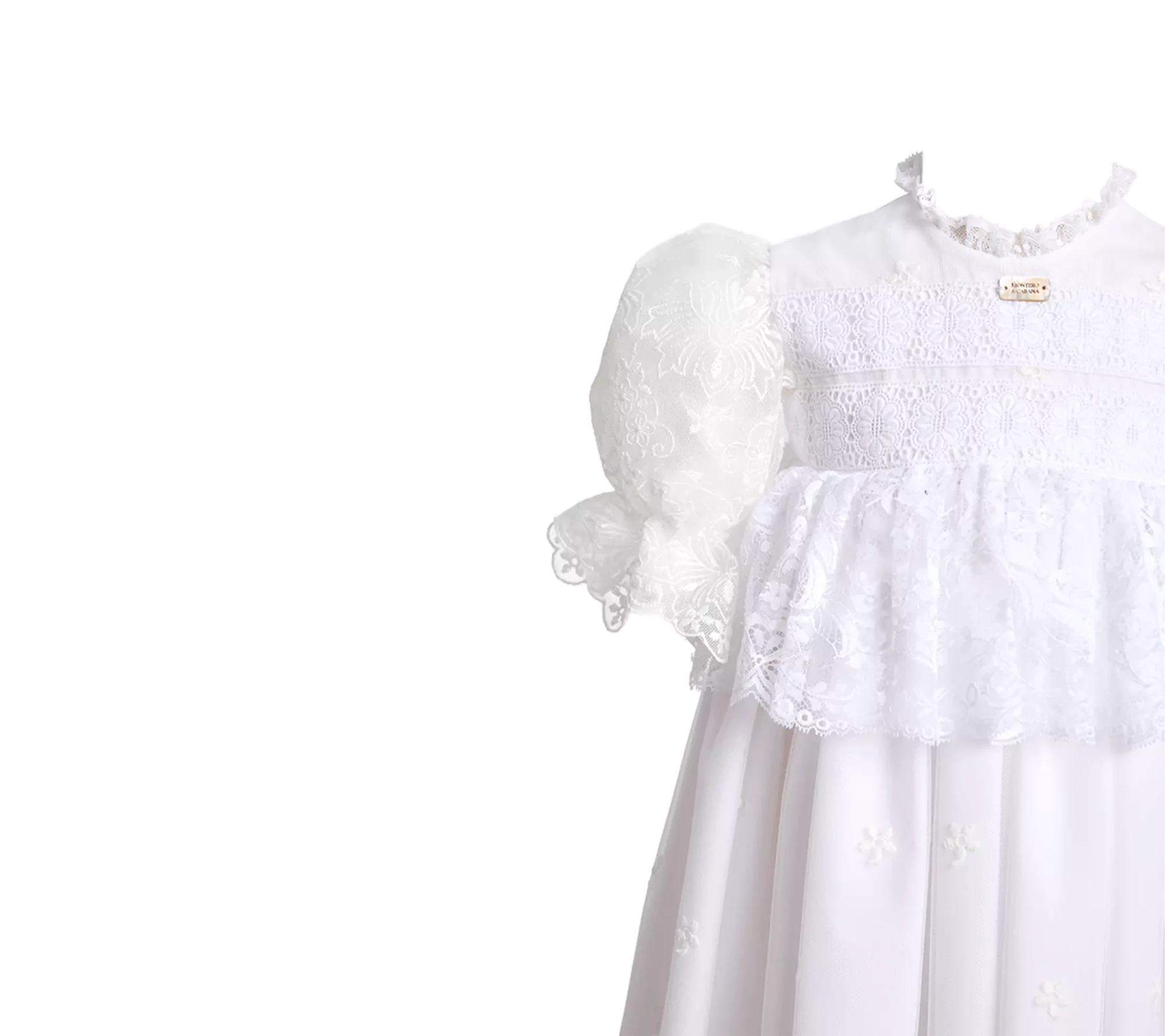 Fabricado en tul bordado blanco con blonda de alençon y tiras bordadas al tono.