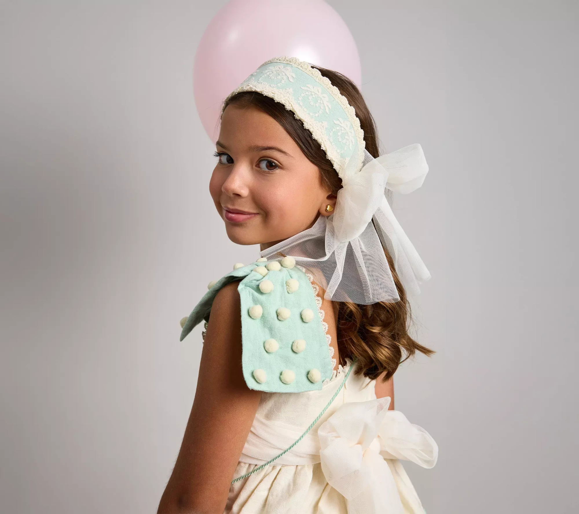 Tiara en tejido de jacquard, adornada en tul bordado , con adornos de lazo de tul y goma ajustable.