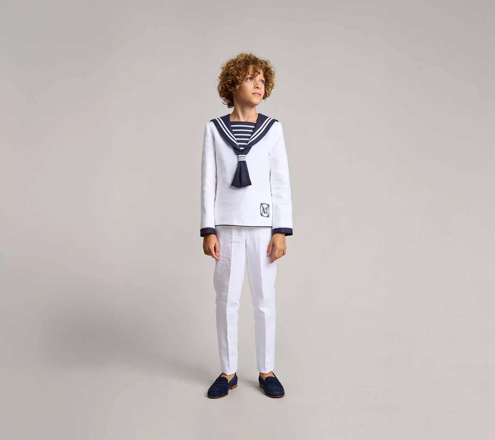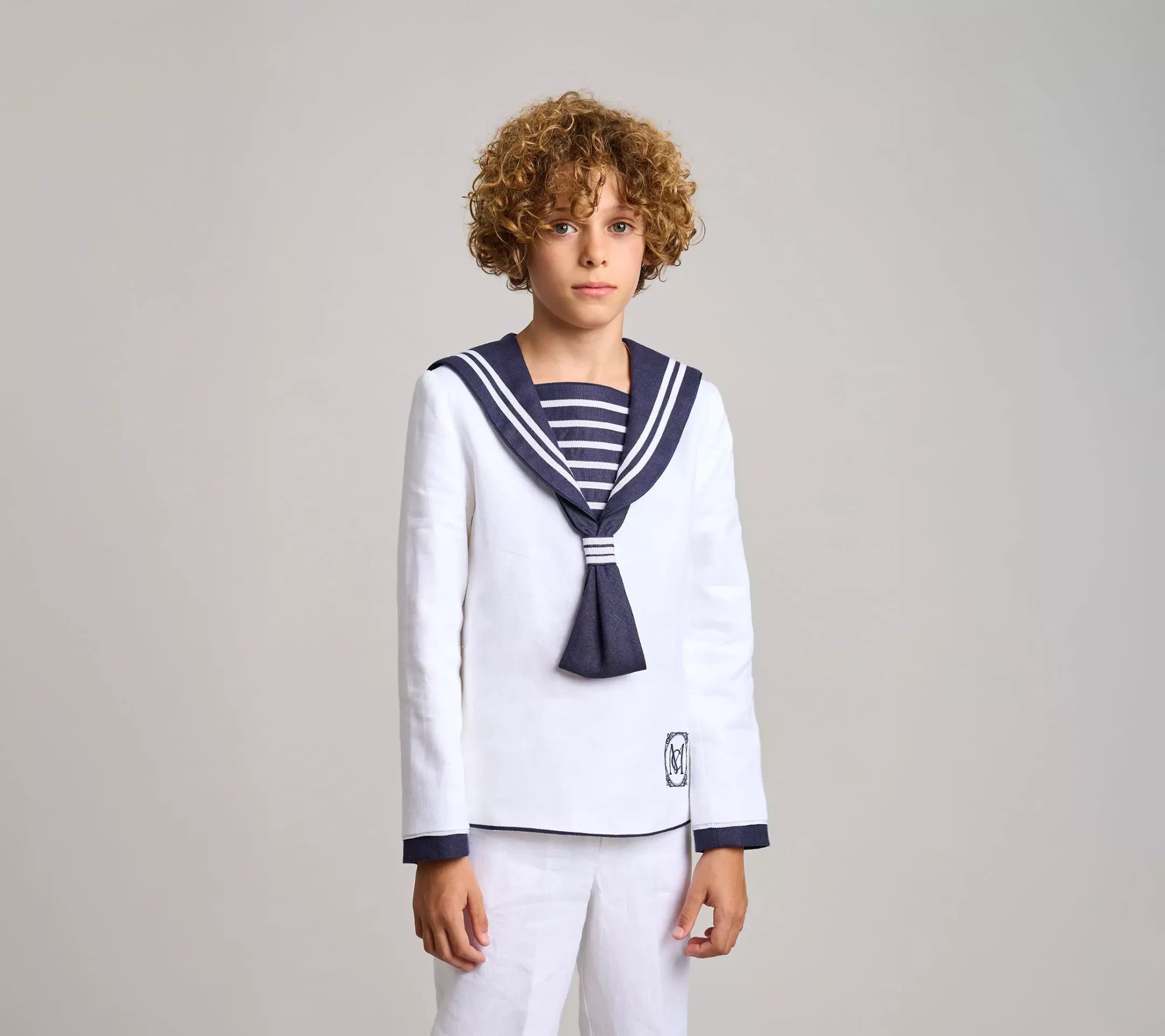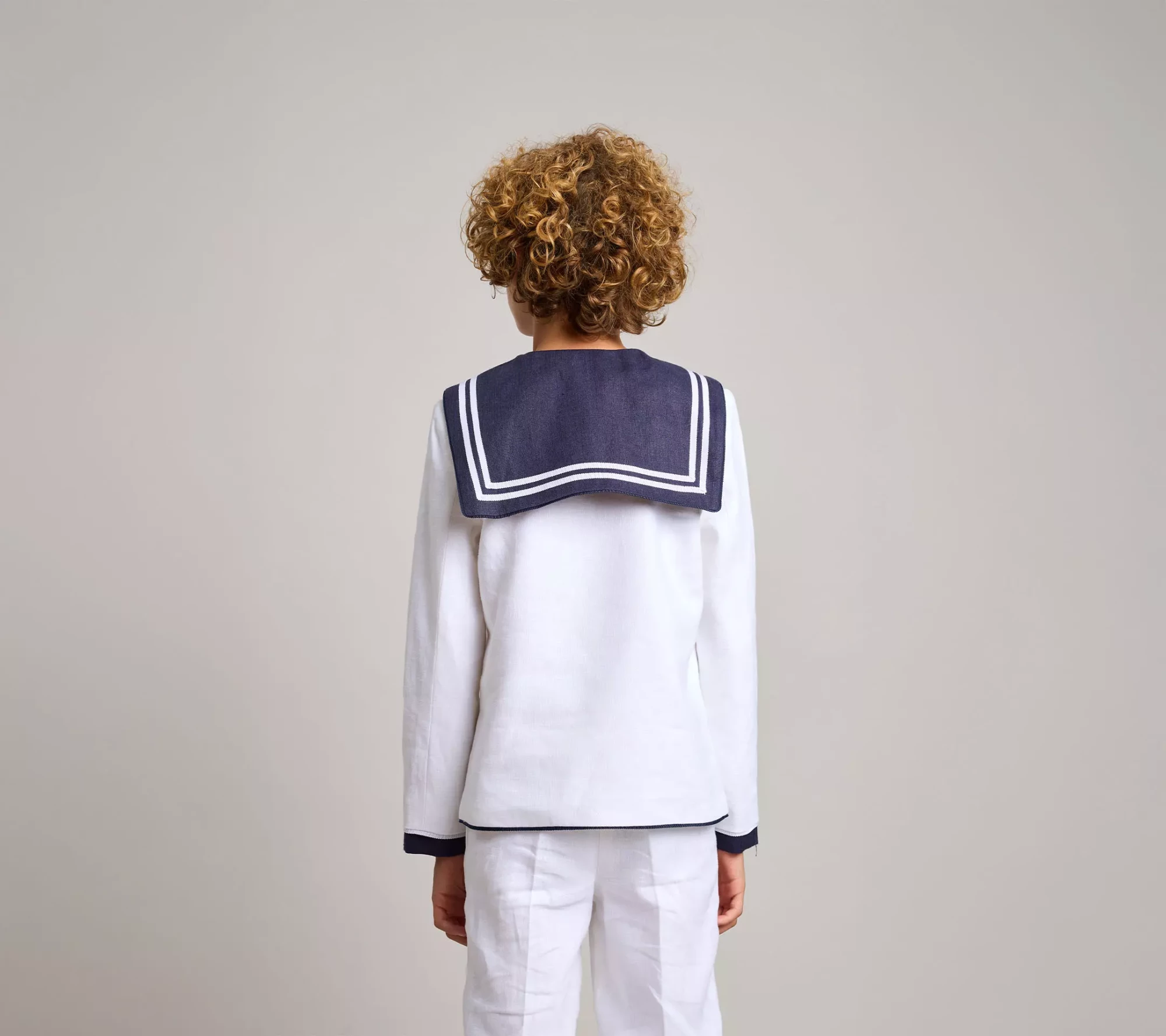 Traje de comunión clásico en lino blanco y azul marino 100%. cuello, pecherín, corbatín, trabilla de corbatín y bajo de mangas en azul marino. cintas de otomán blancas y azules adornan el traje. en el delantero, bordado de logo de la marca en color azul marino. pantalón largo de piernas ajustadas, con bolsillos laterales y goma elástica en la cintura espalda, para dar ajuste y comodidad.