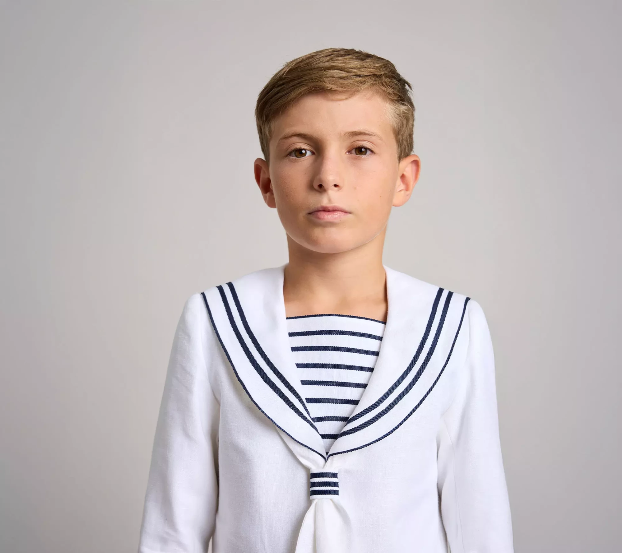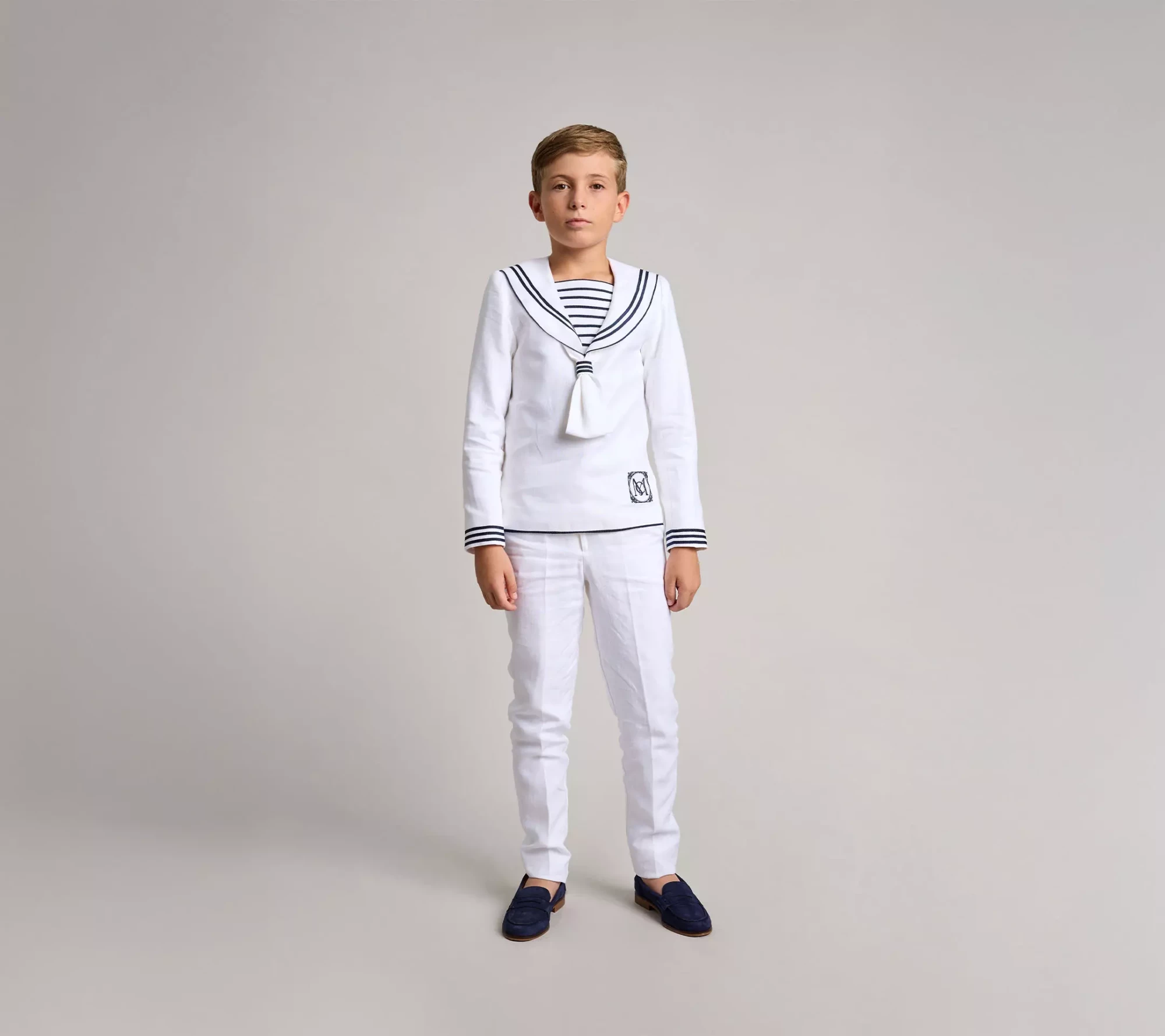 Traje de comunión clásico en lino 100% blanco y cintas azul marino Mario
