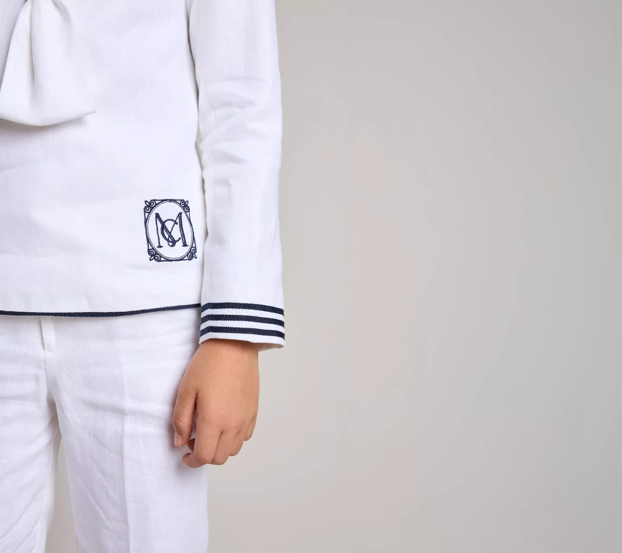 Traje de comunión clásico en lino blanco 100% y cintas de otomán en azul marino. en el delantero, bordado con logo de la marca en color azul marino. pantalón corto, con bolsillos laterales y goma elástica en la cintura espalda, para dar ajuste y comodidad.