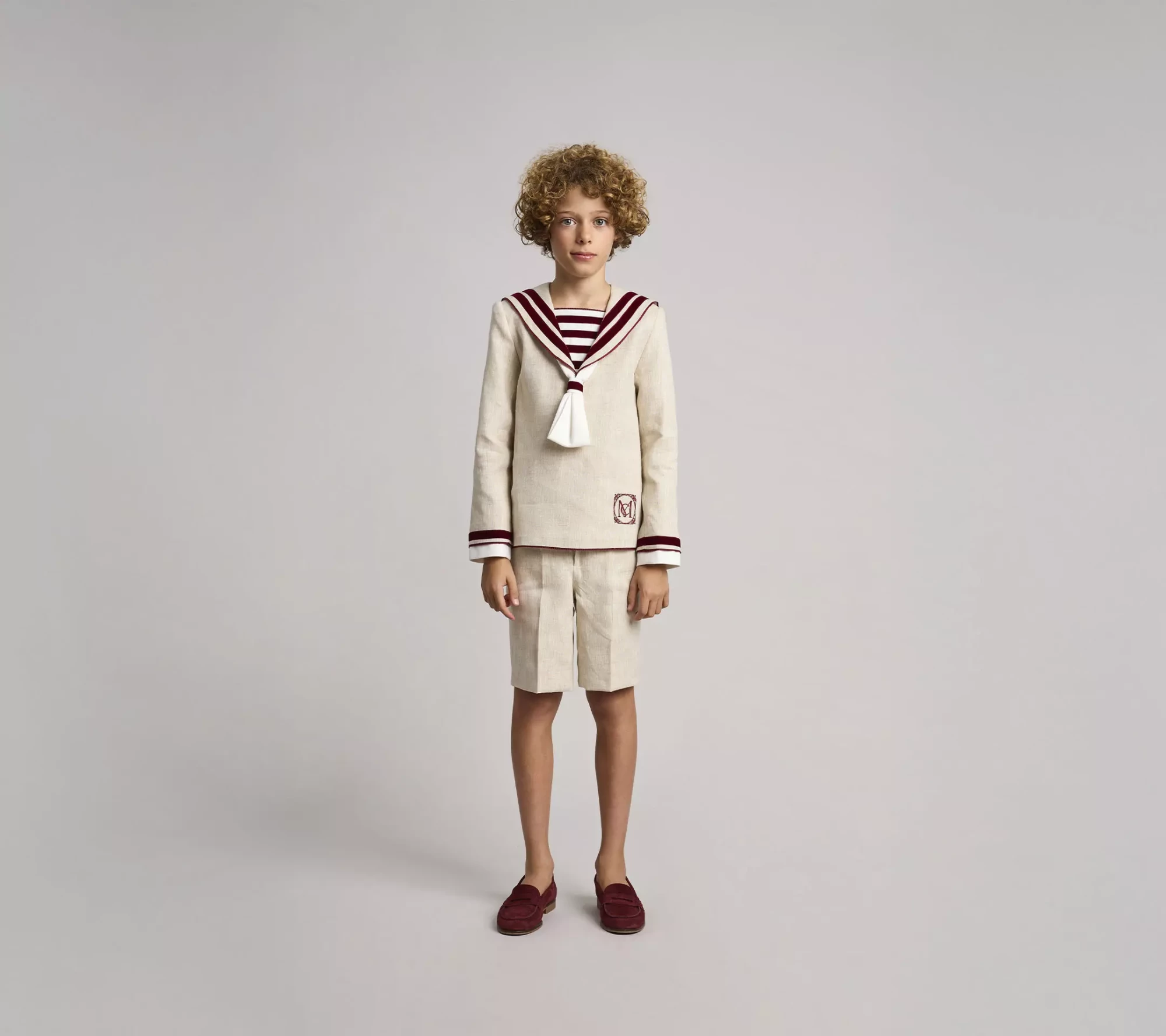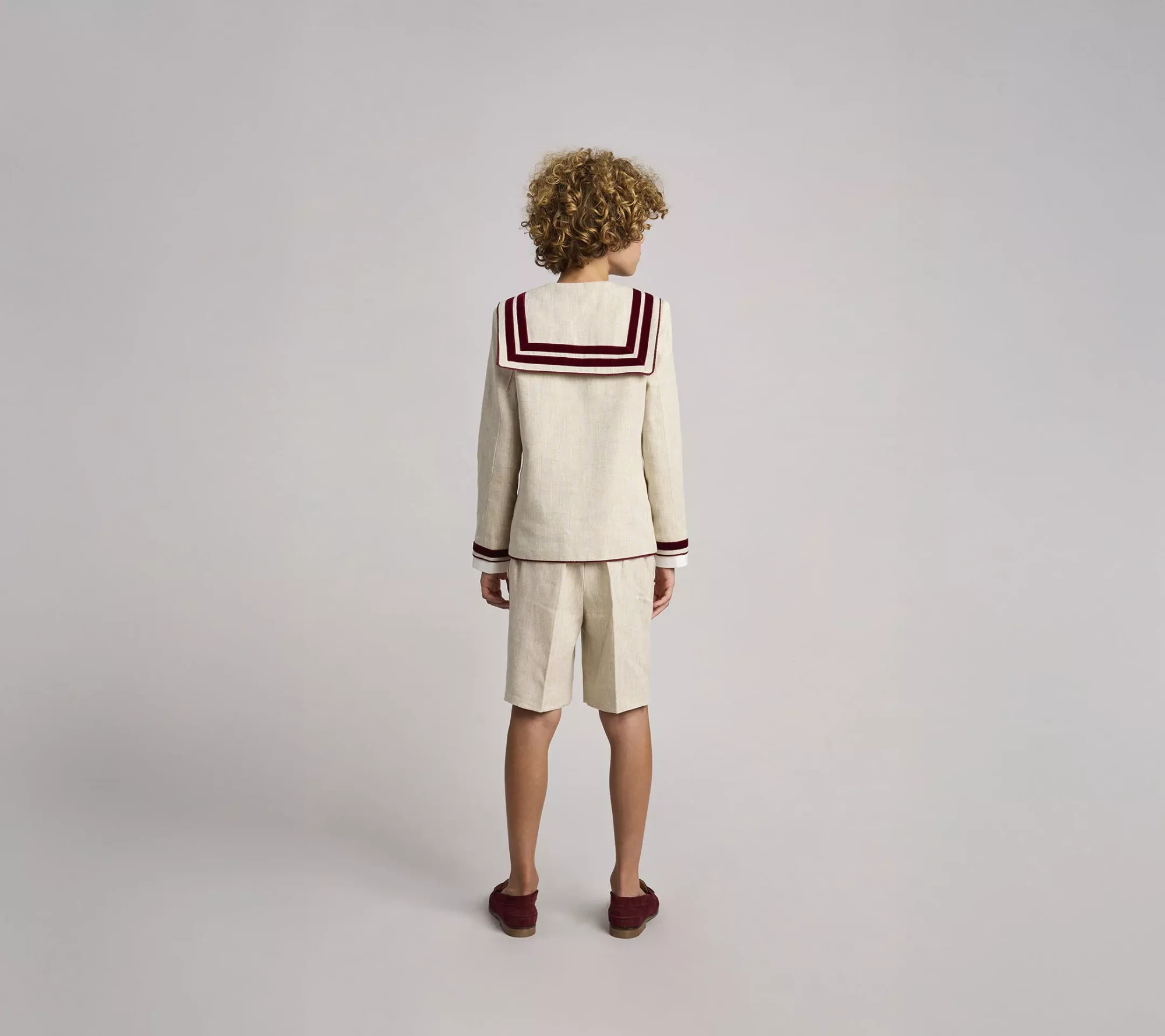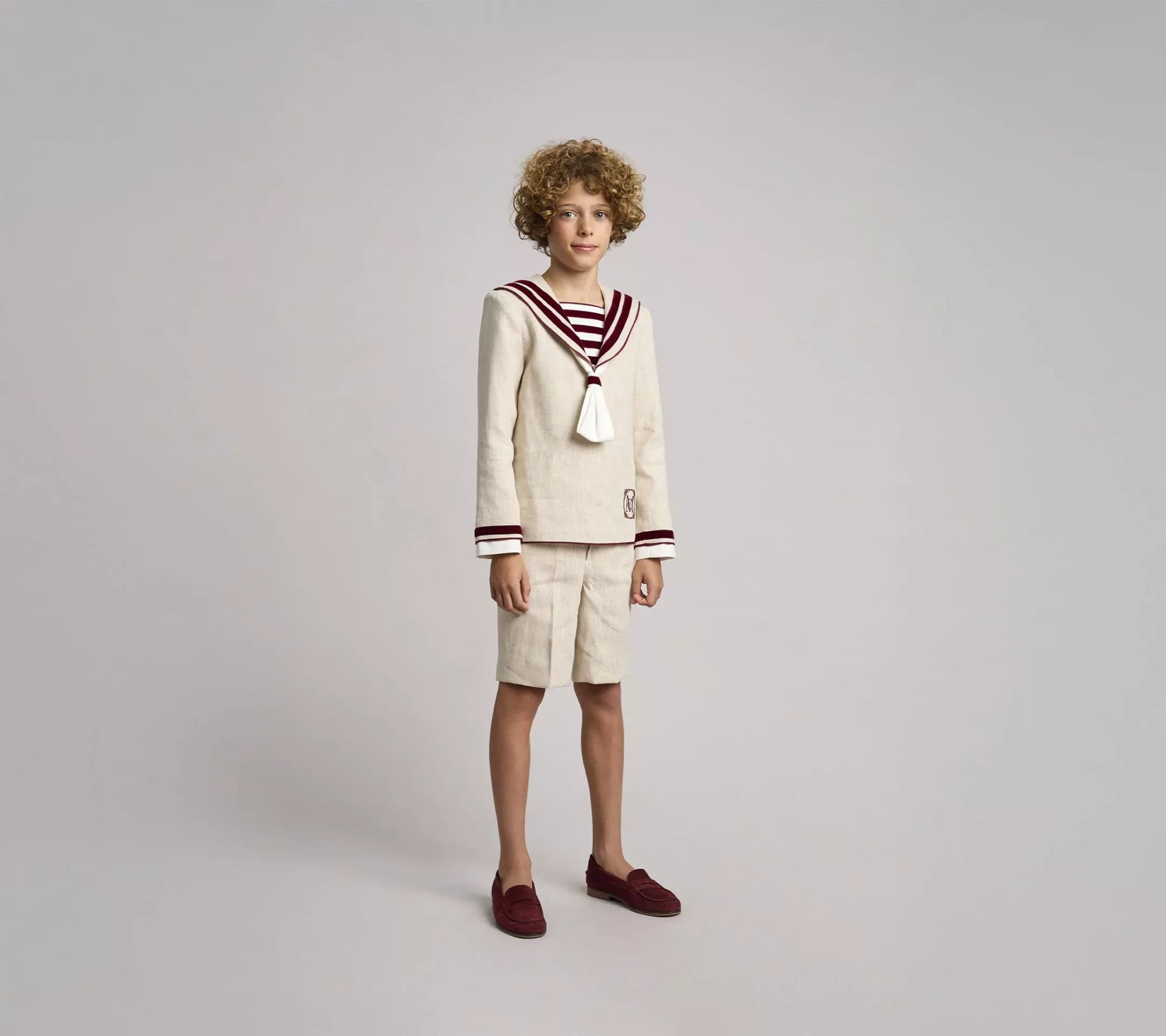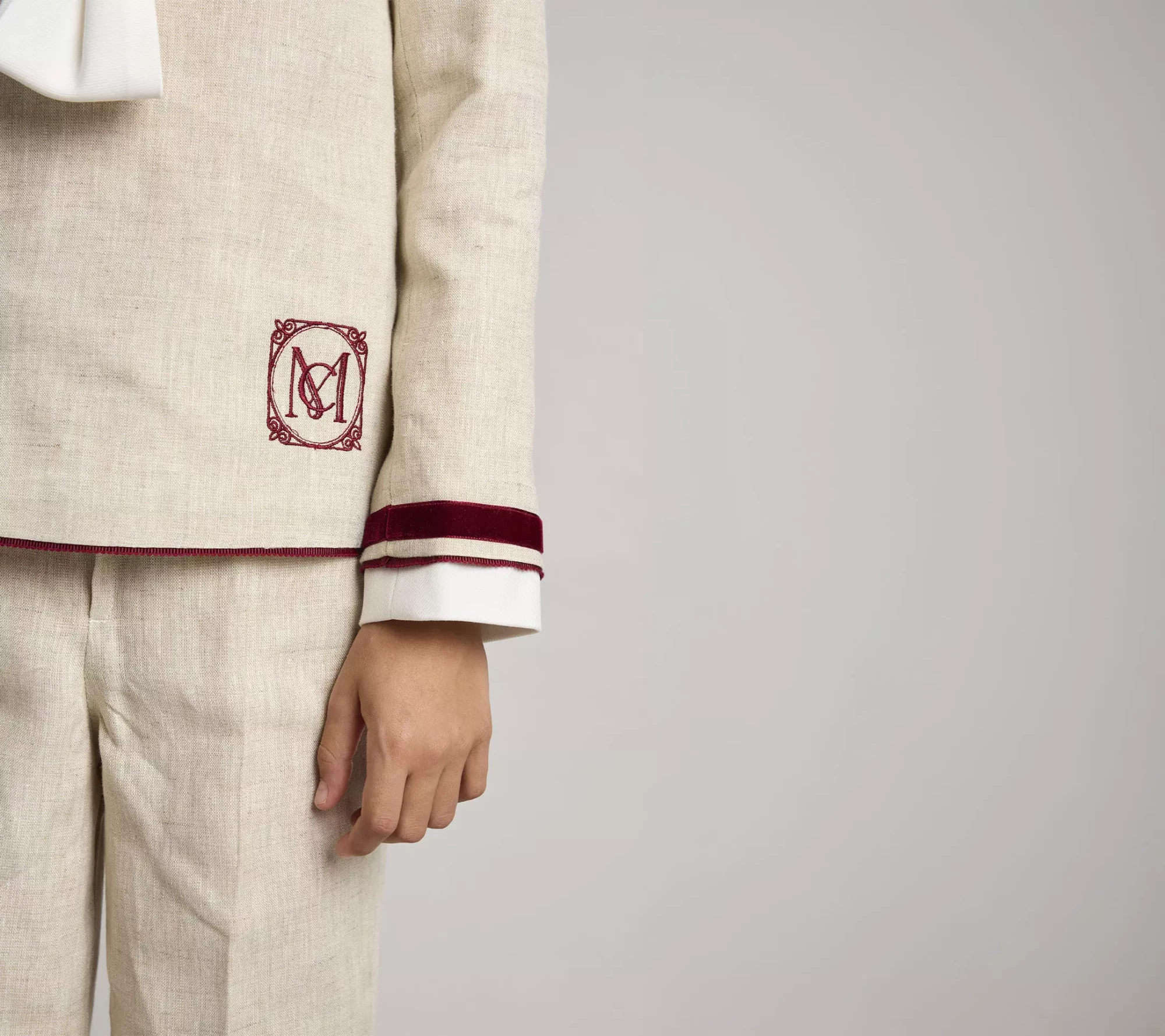 Traje de comunión clásico en lino color piedra, con bajo de mangas, pecherín y corbatín en sarga de color natural. Adornos de cintas de terciopelo burdeos en cuello, mangas, pecherín y lazo del corbatín. Logo de la marca en el delantero de la casaca, en color burdeos. Pantalón largo de piernas ajustadas, con bolsillos laterales y gomas en la cintura espalda para dar ajuste y comodidad a la prenda.