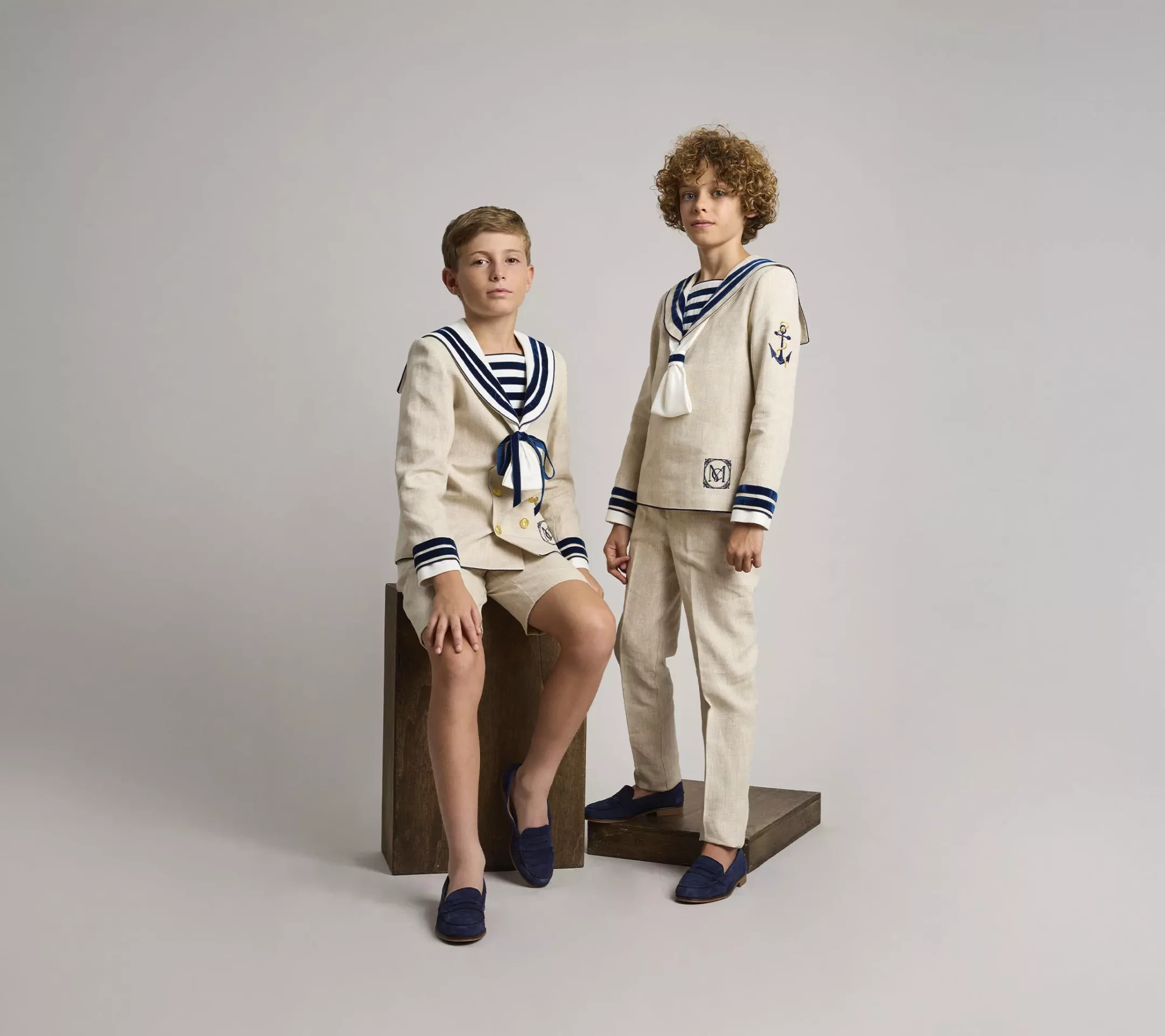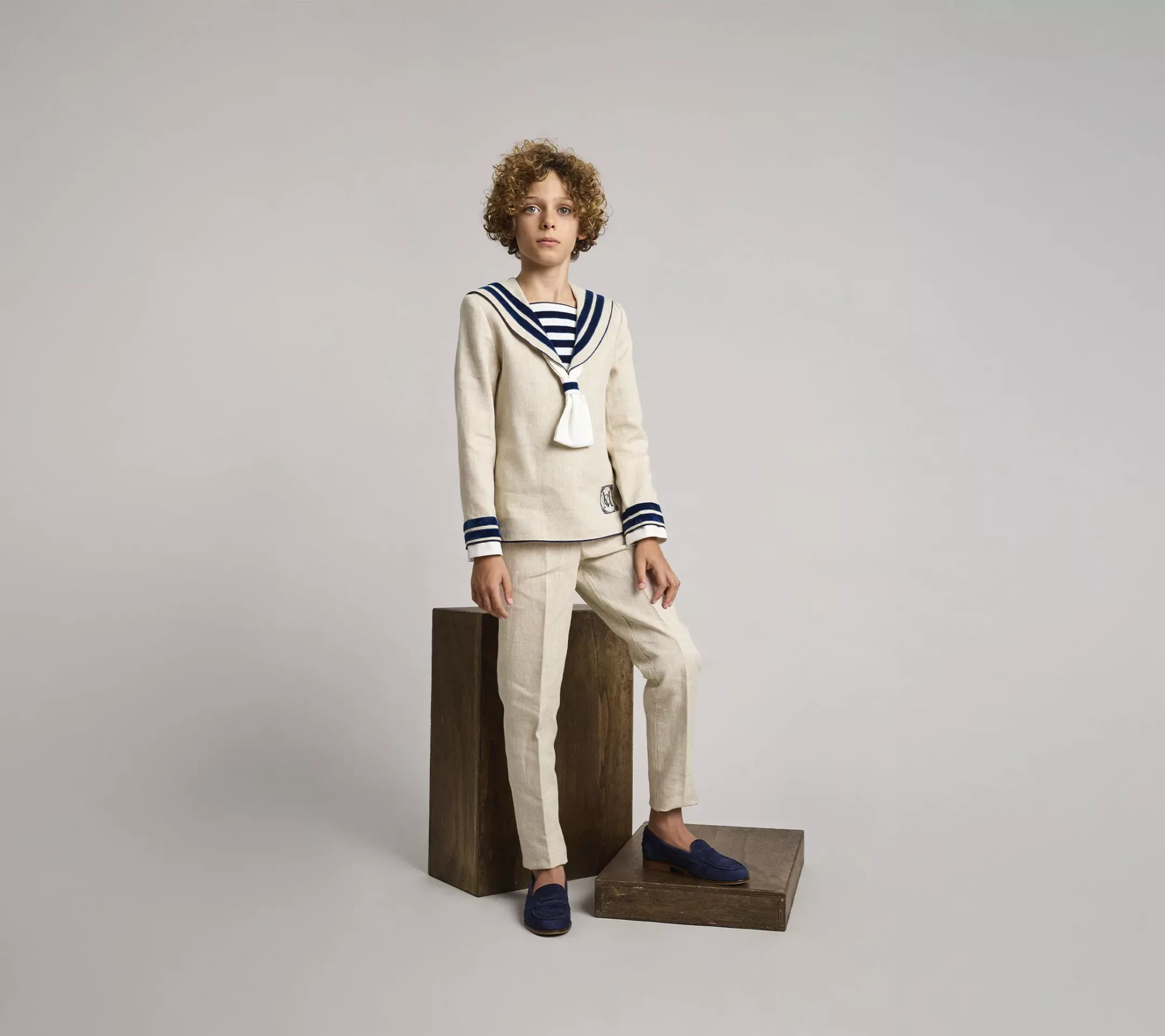 Traje de comunión clásico en sarga natural y adornos en lino Romeo