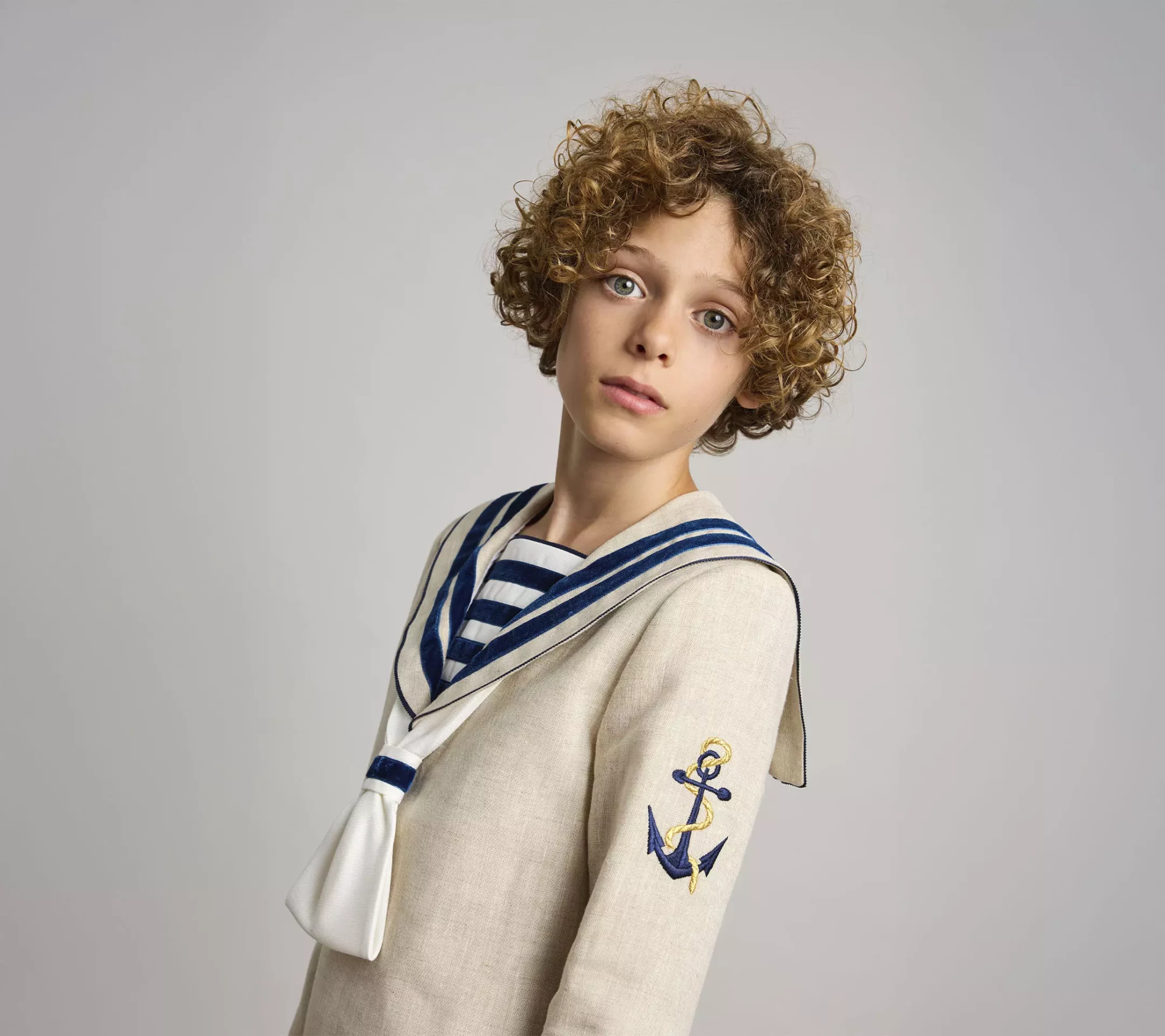 Traje de comunión clásico en tejido de sarga natural y lino de color piedra. Adornado con cintas de terciopelo azul marino en cuello, mangas y pecherín. En la manga izquierda lleva un ancla bordada en azul y dorado. El bajo de las mangas va en lino color piedra, a juego con el cuello y el corbatín. Pantalón corto en sarga natural, con goma en la cintura espalda para dar ajuste y comodidad. Bolsillos laterales.