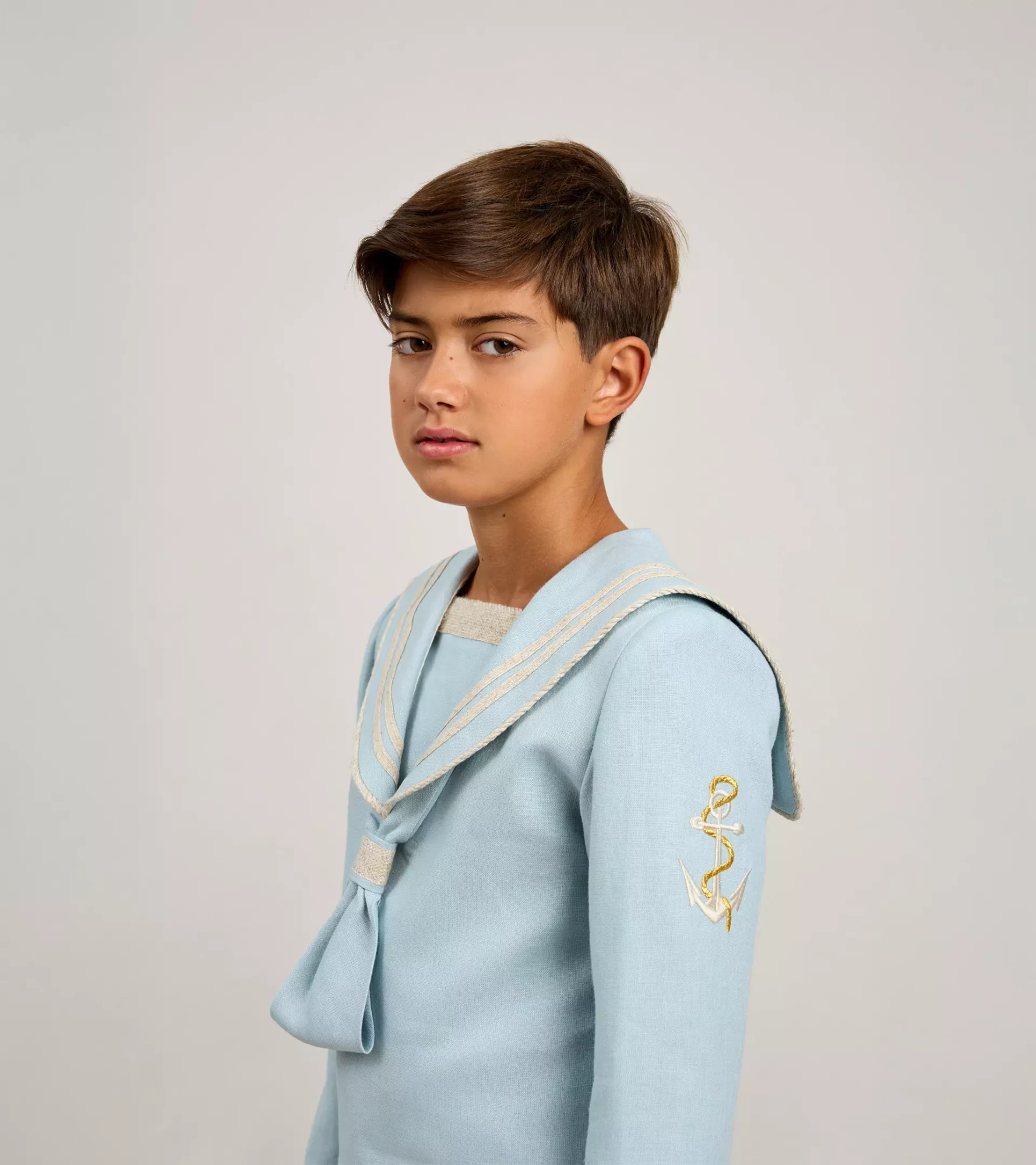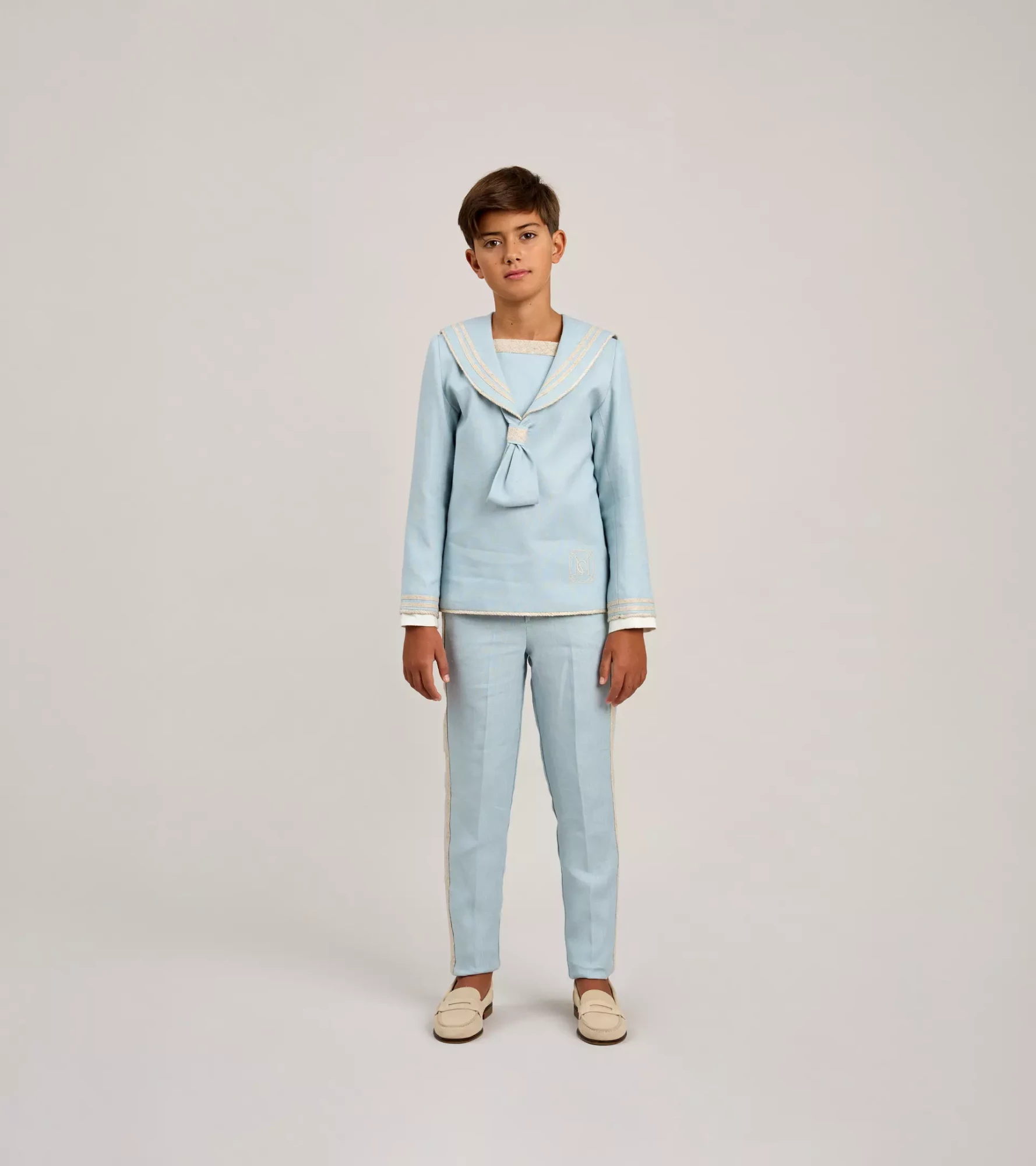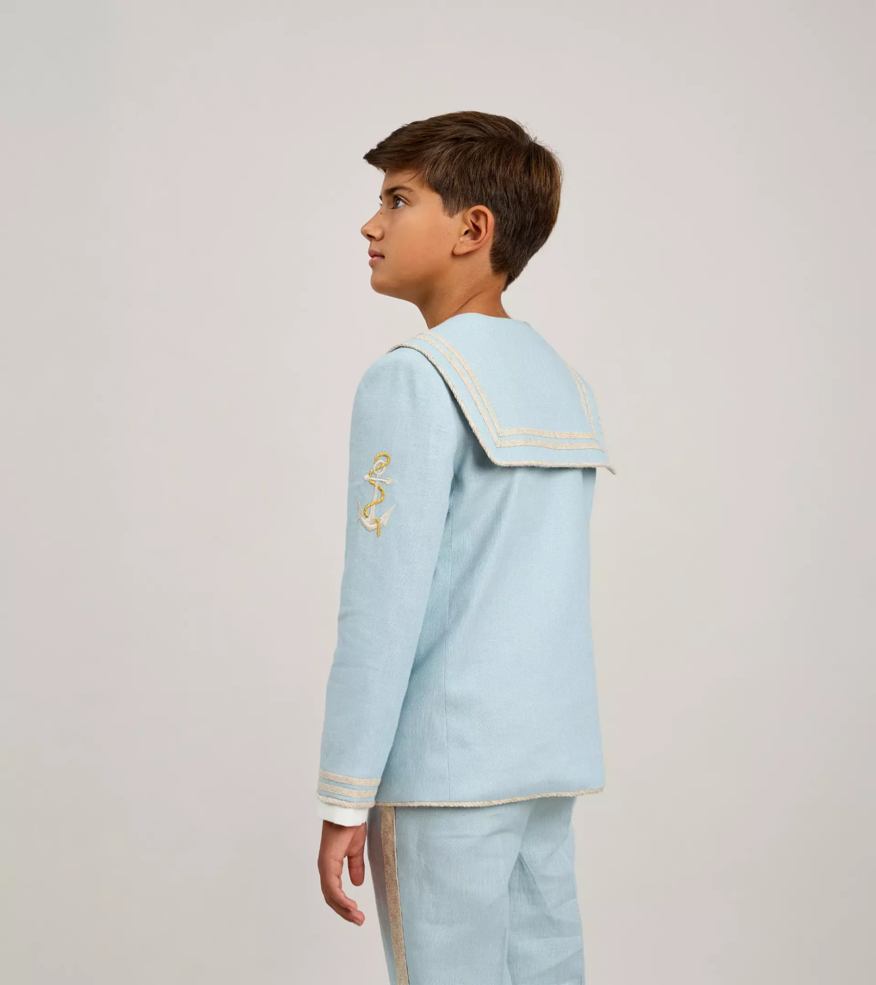 Traje de comunión de niño clasico, en tejido de lino 100% en color azul glacial. Casaca con adornos en cintas de saco en cuello, pecherin, mangas y trabilla de corbatín. En el delantero tiene un bordado con el logo de la marca al tono de las cintas y en la manga izquierda otro con un ancla en color saco y dorado. La manga remata con un bajo de mangas en lino de color natural. Pantalón de piernas ajustadas, con bolsillos laterales, cremallera delantera y gomas en la cintura espalda para dar mas ajuste y comodidad. En el lateral de las piernas tiene una cinta de saco ancha, para dar una imagen mas casual.