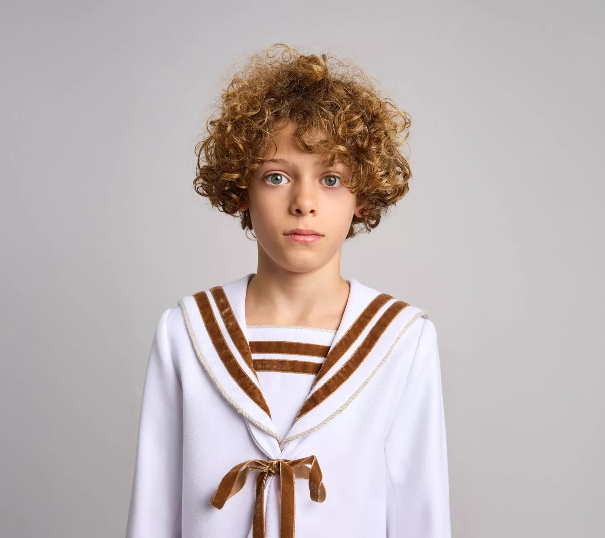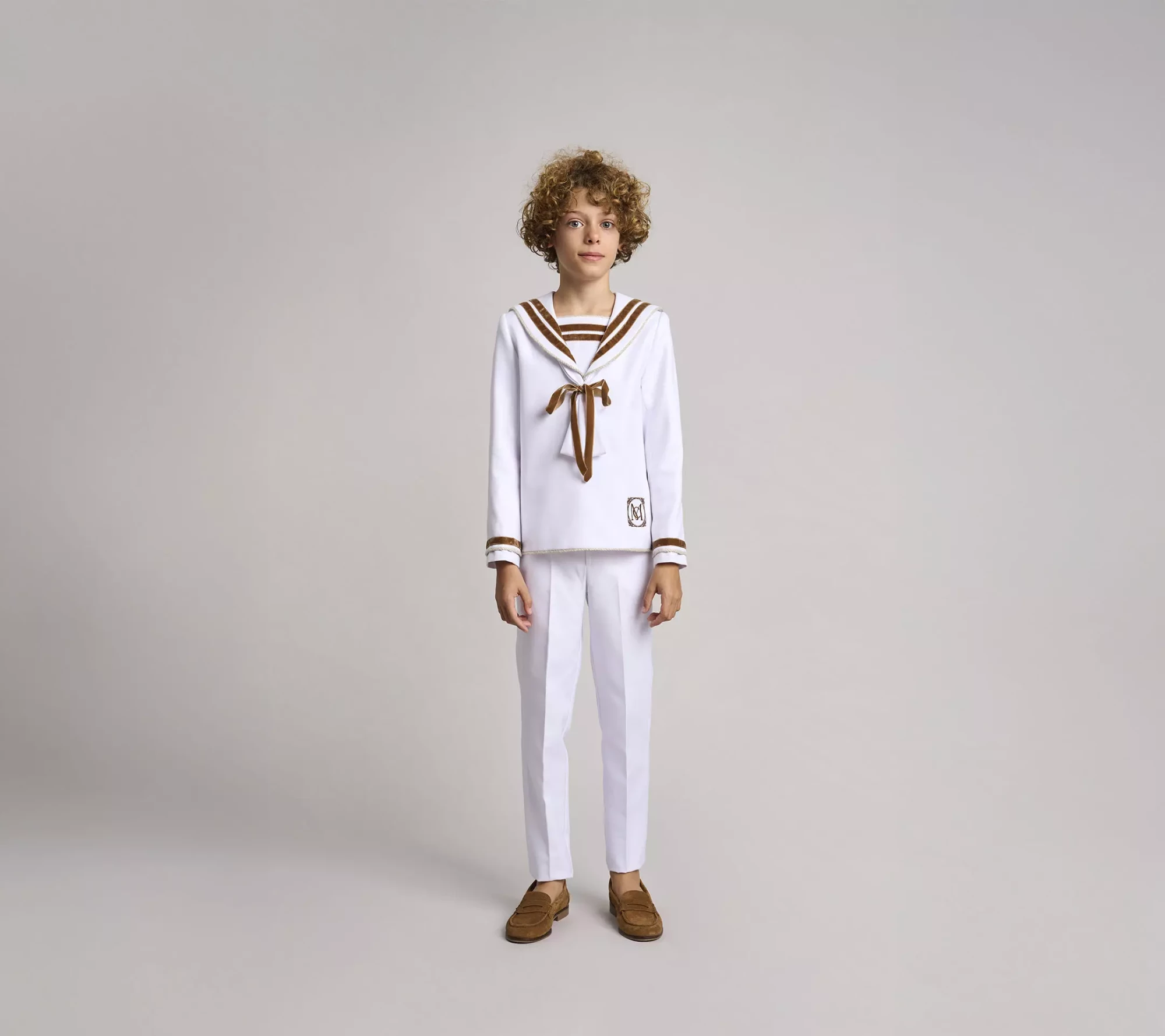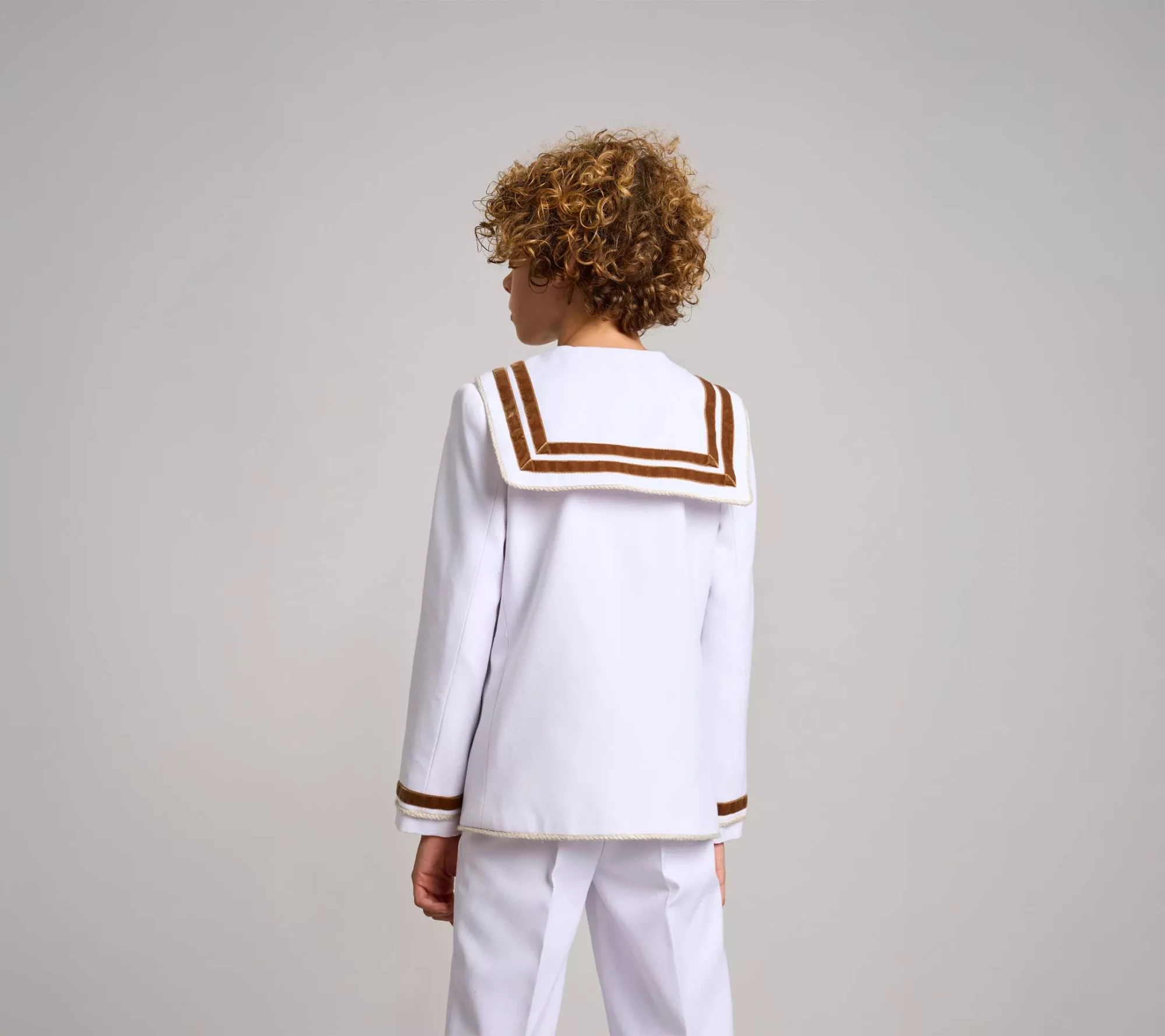 Traje de comunión clásico en sarga de color blanco y cintas de terciopelo en color marrón en cuello, mangas, pecherín y lazo del corbatín. cordón de saco para rematar y dar acabado a la prenda. logo de la marca en el delantero de la casaca. pantalón largo de piernas ajustadas, bolsillos laterales y goma elástica en la cintura espalda para dar ajuste y comodidad.