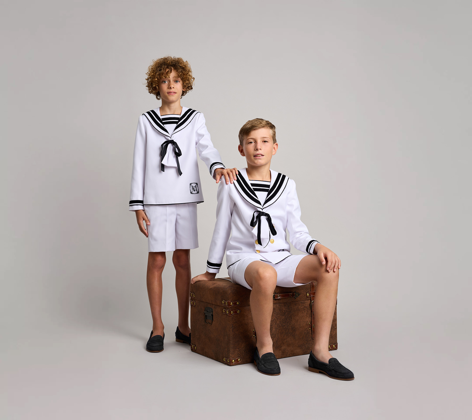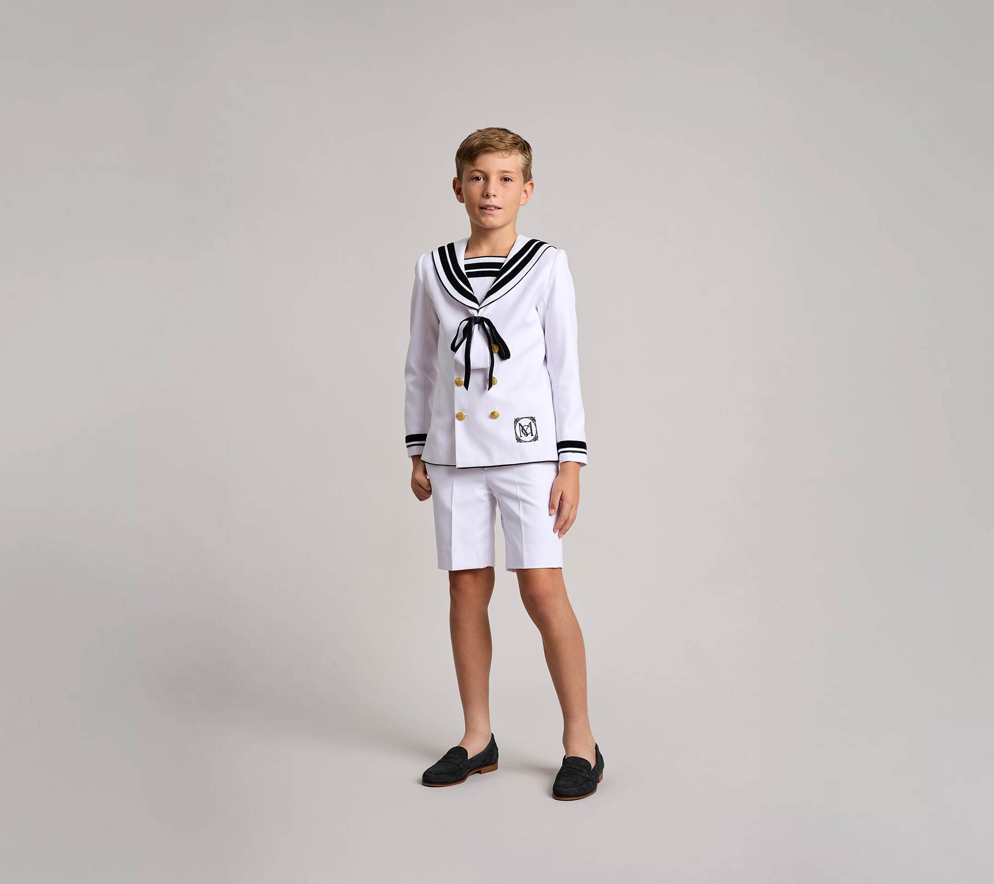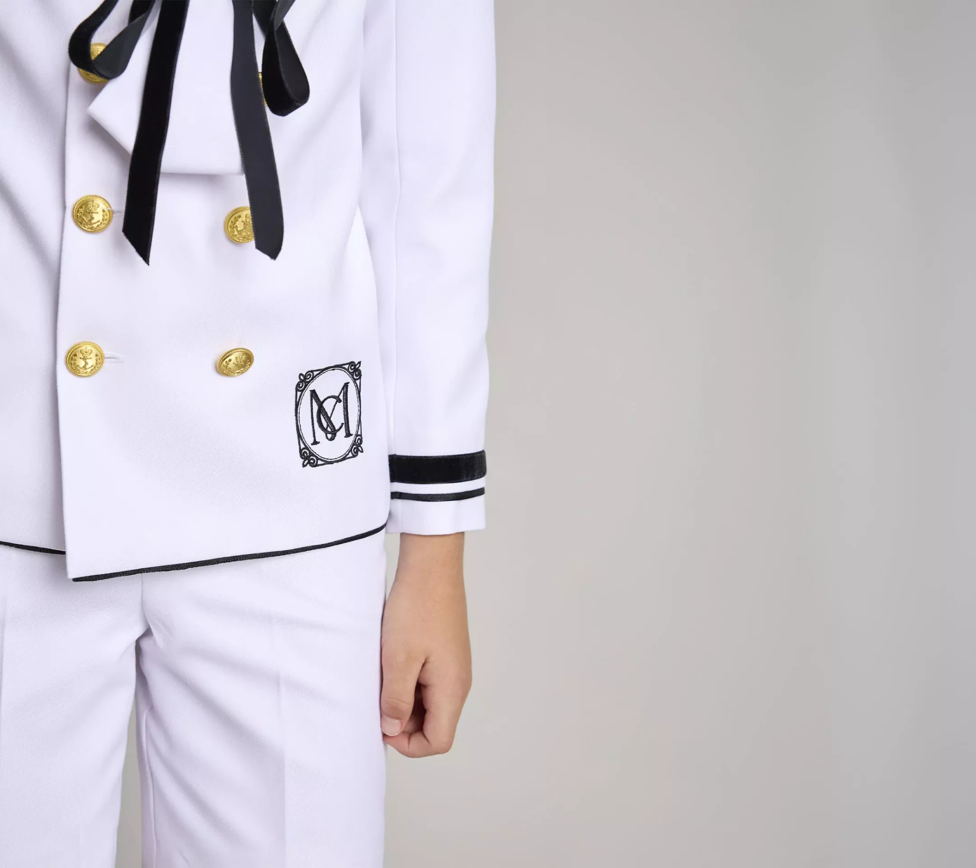 Traje de comunión de sarga blanca con doble botonadura en la casaca Nacho