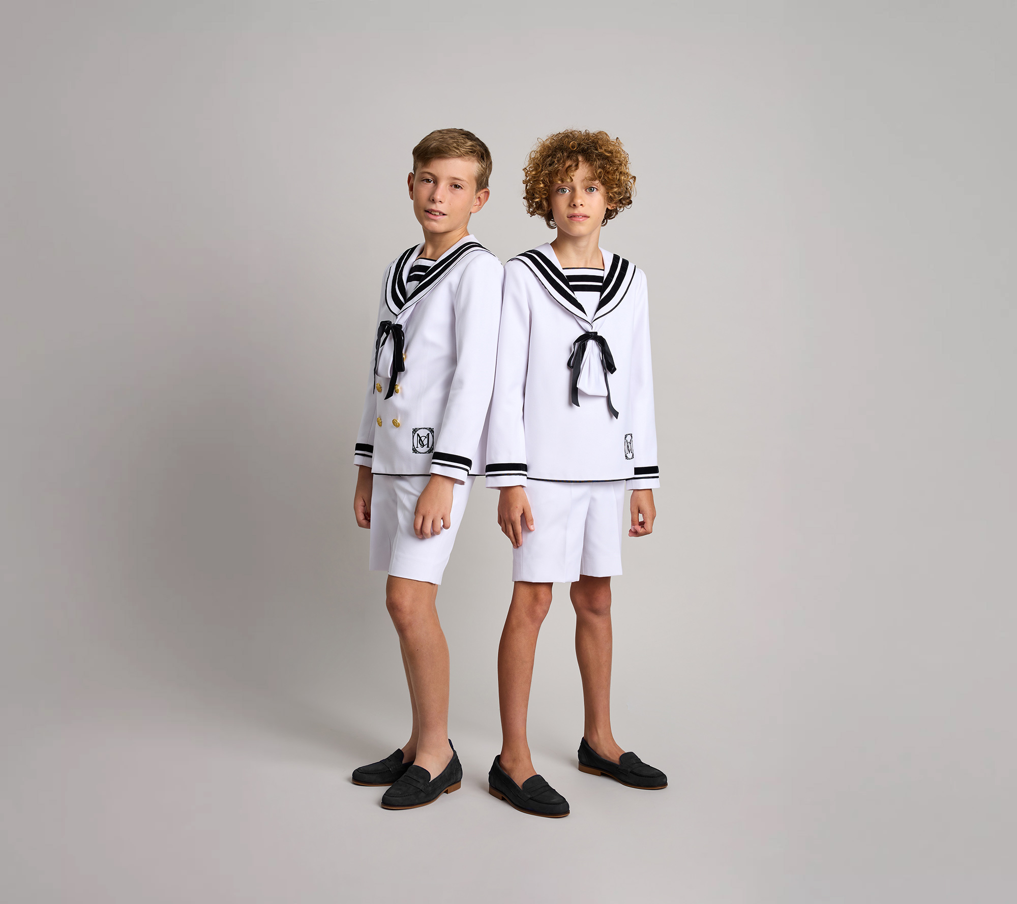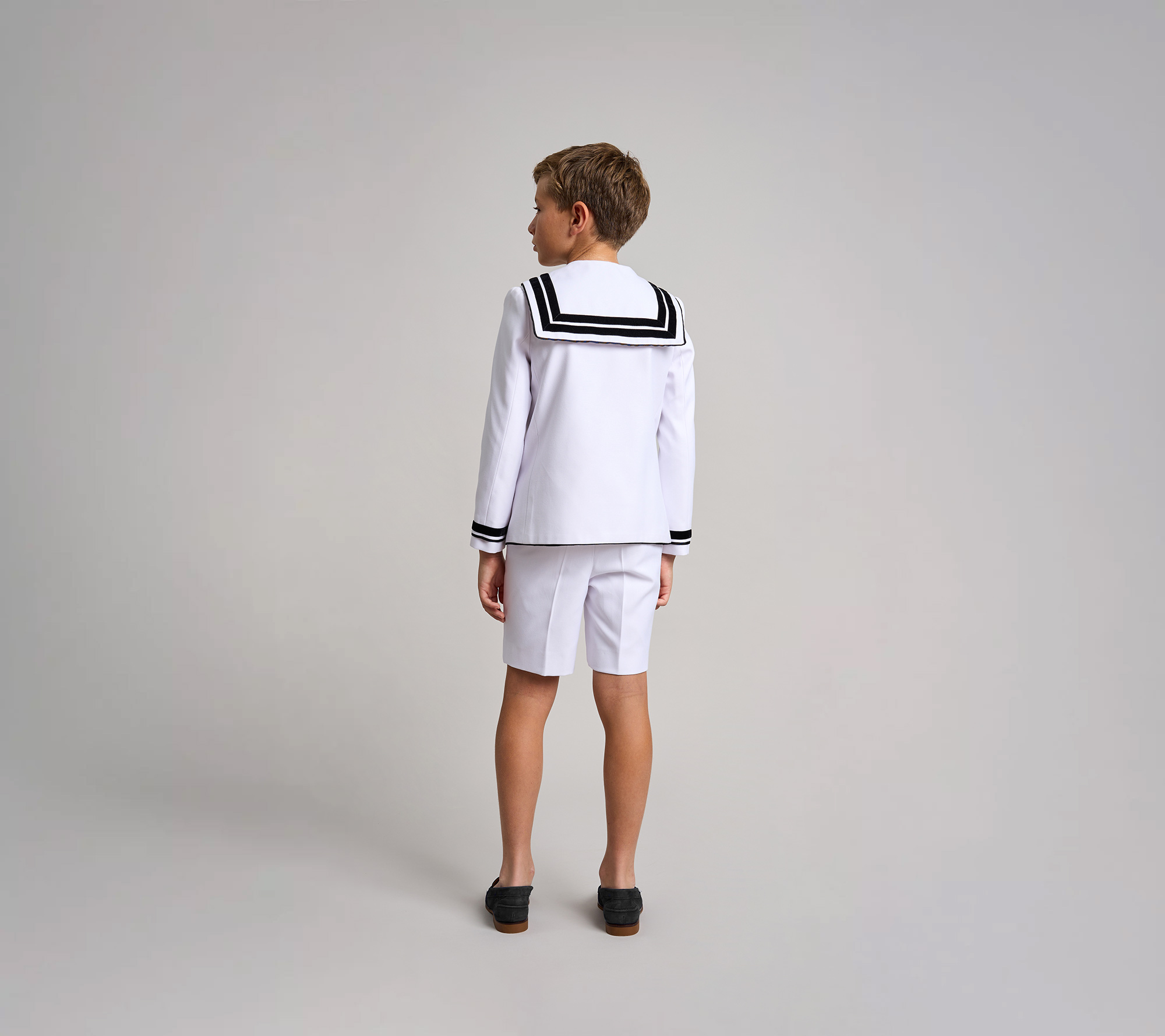 Traje de comunión de doble abotonadura en sarga color blanco. adornado con cintas de terciopelo en color negro, en cuello, mangas, pecherín y lazo del corbatín. logo de la marca bordado en el delantero de la casaca, al tono de las cintas. pantalón corto, con bolsillos laterales y goma elástica en la cintura espalda para dar ajuste y comodidad.