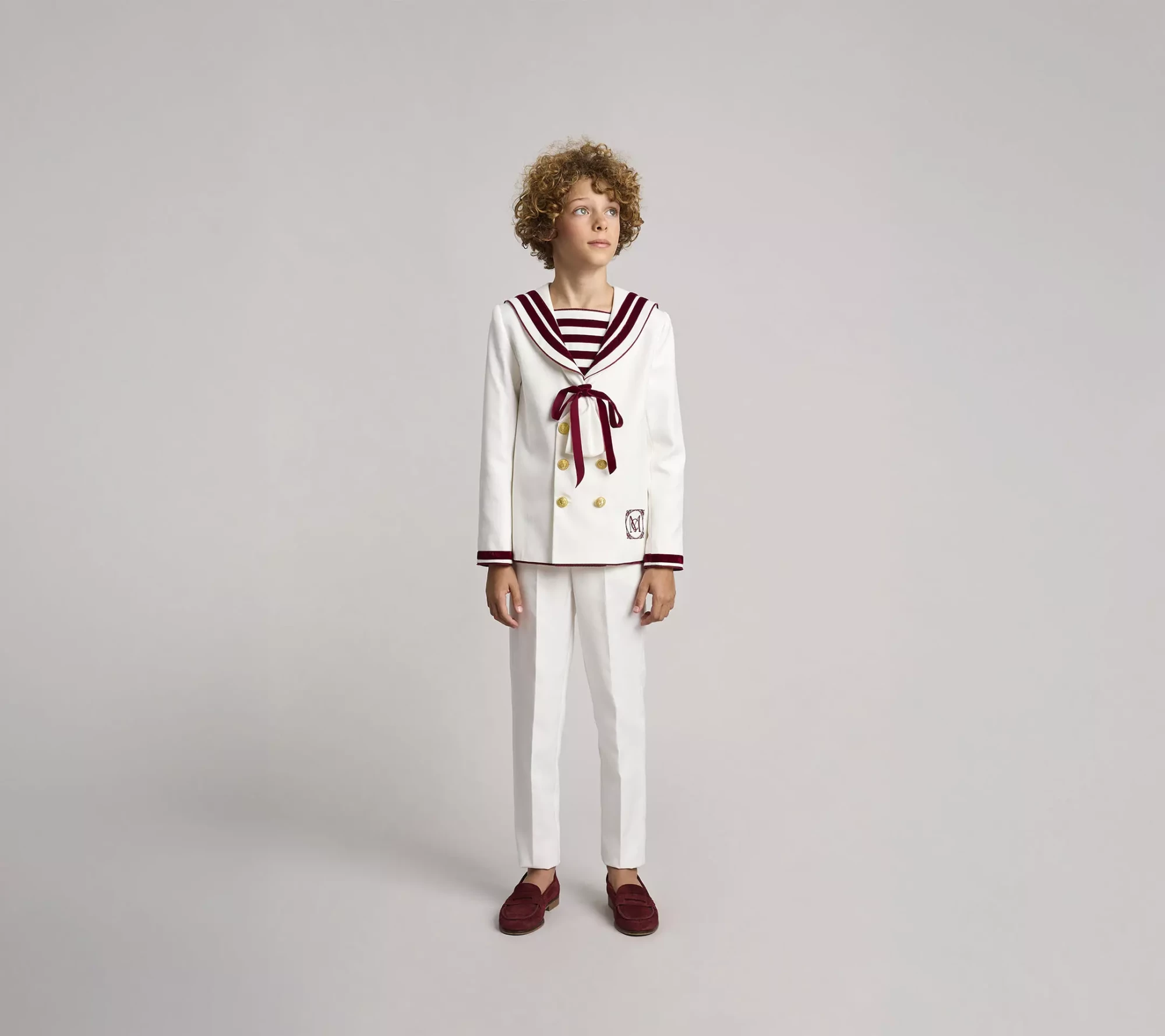 Traje de comunión de doble botonadura en color sarga natural, con adornos de cintas de terciopelo burdeos en cuello, mangas, pecherín y lazo del corbatín. Logo de la marca en el delantero de la casaca. Pantalones largos de piernas ajustadas, con bolsillo lateral y gomas en la cintura espalda para dar ajuste y comodidad a la prenda.
