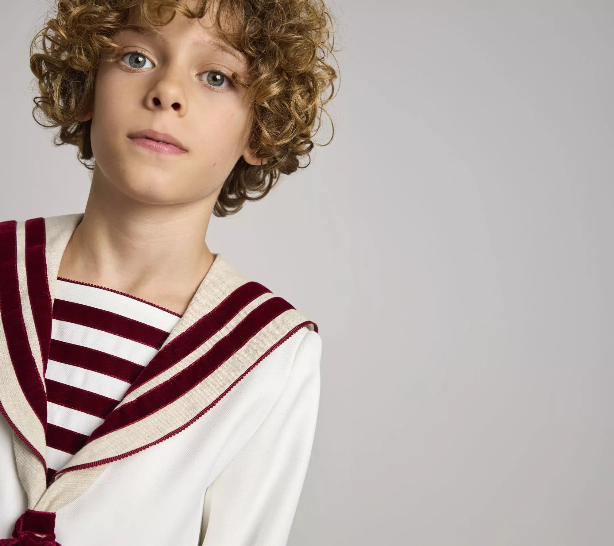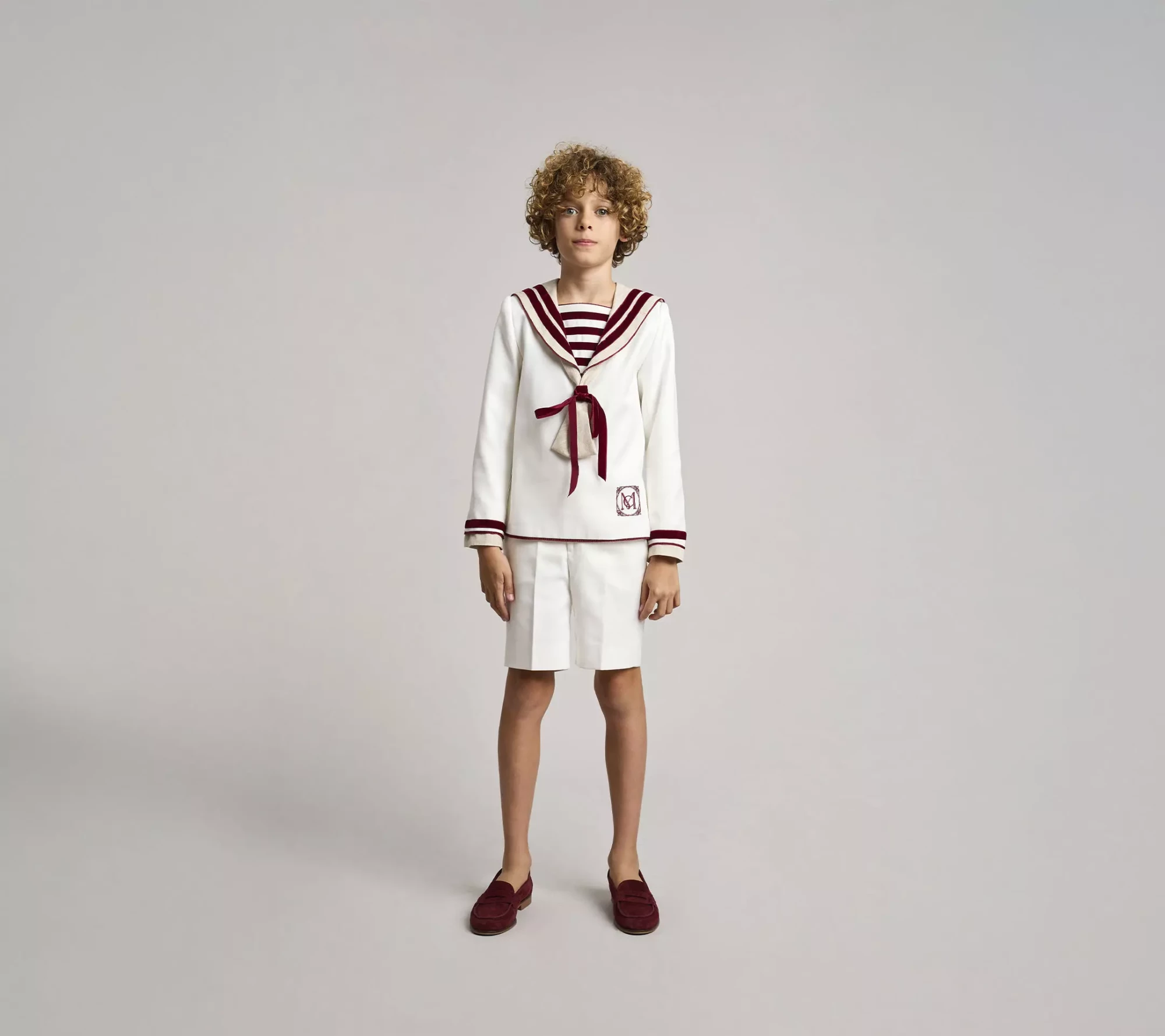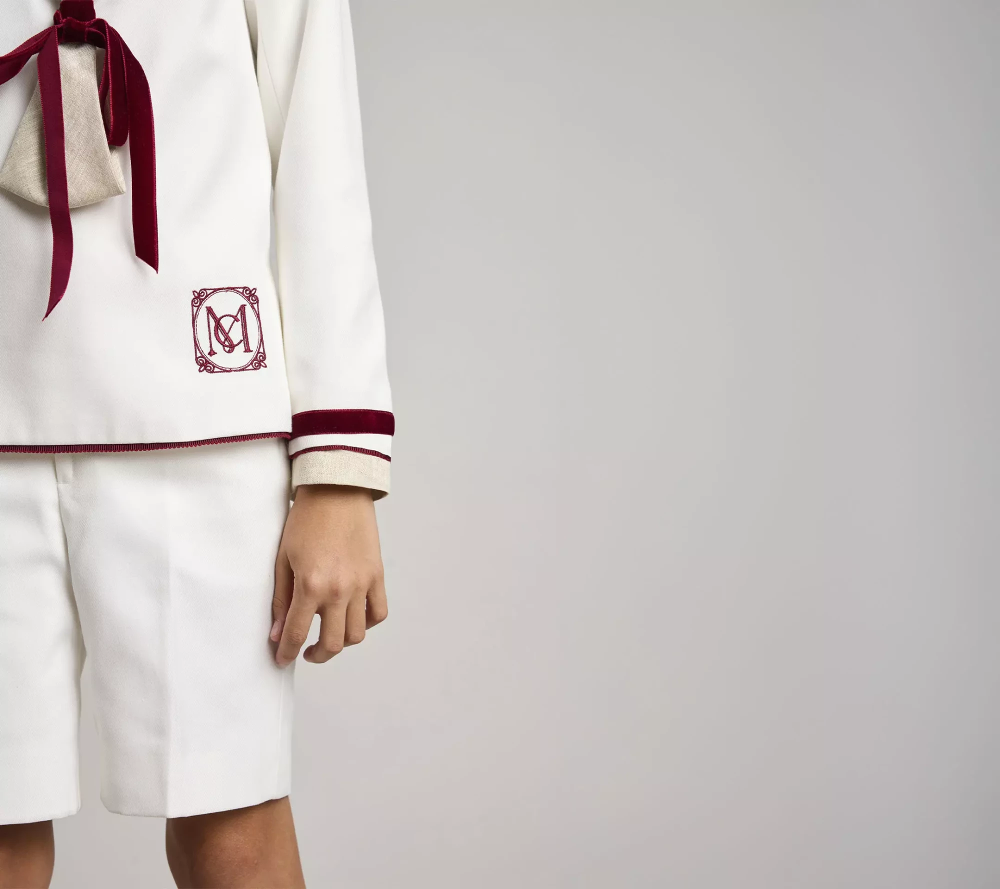 Traje de comunión clásico en sarga natural y lino color piedra en cuello y bajo de manga. Adornos de cintas de terciopelo burdeos en cuello, mangas, pecherín y lazo del corbatín. Pantalón corto, con bolsillos laterales y goma en la cintura espalda para dar ajuste y comodidad a la prenda.