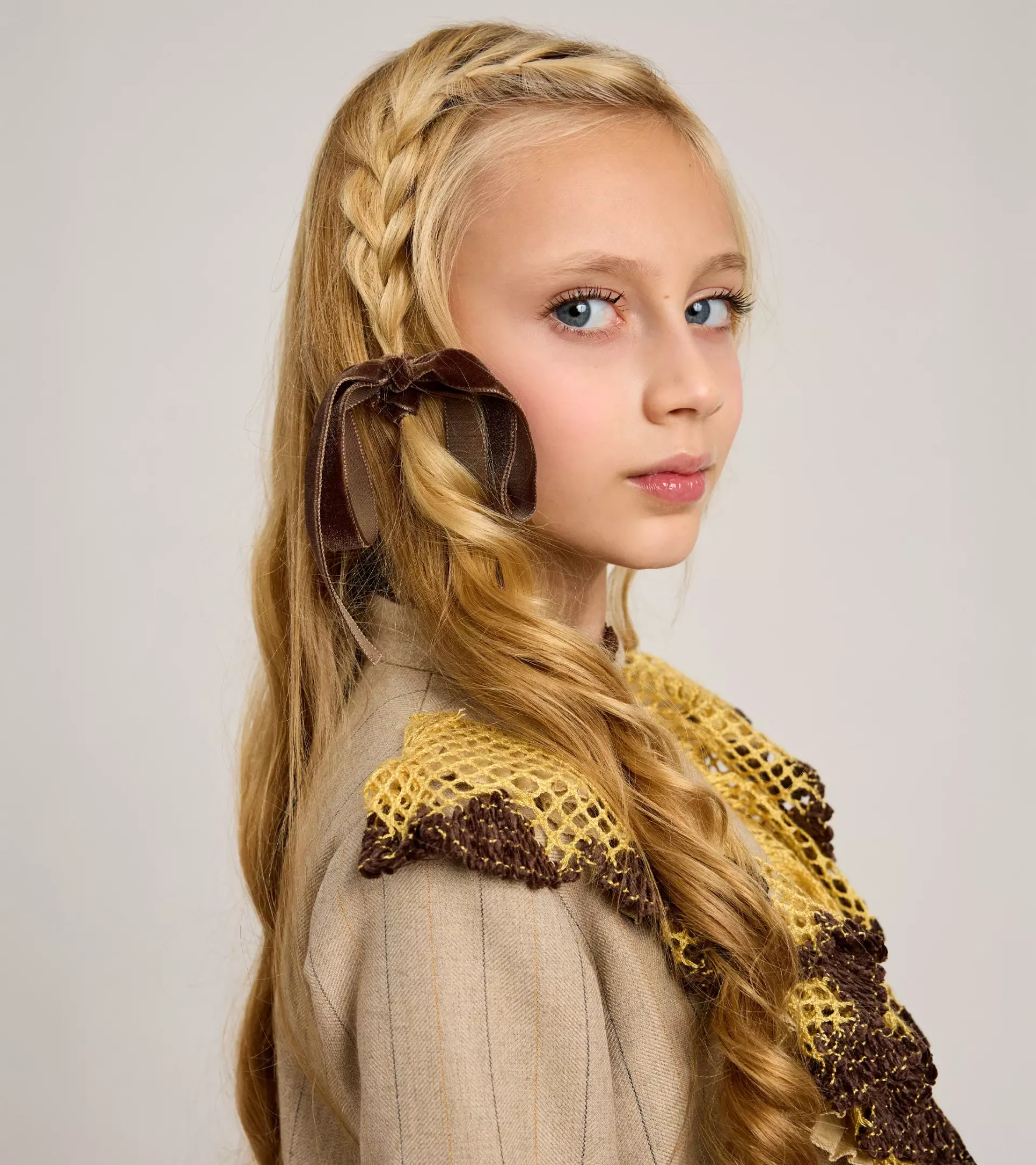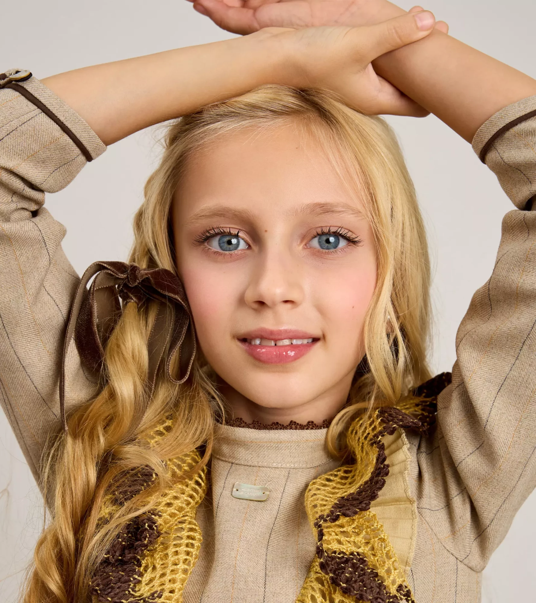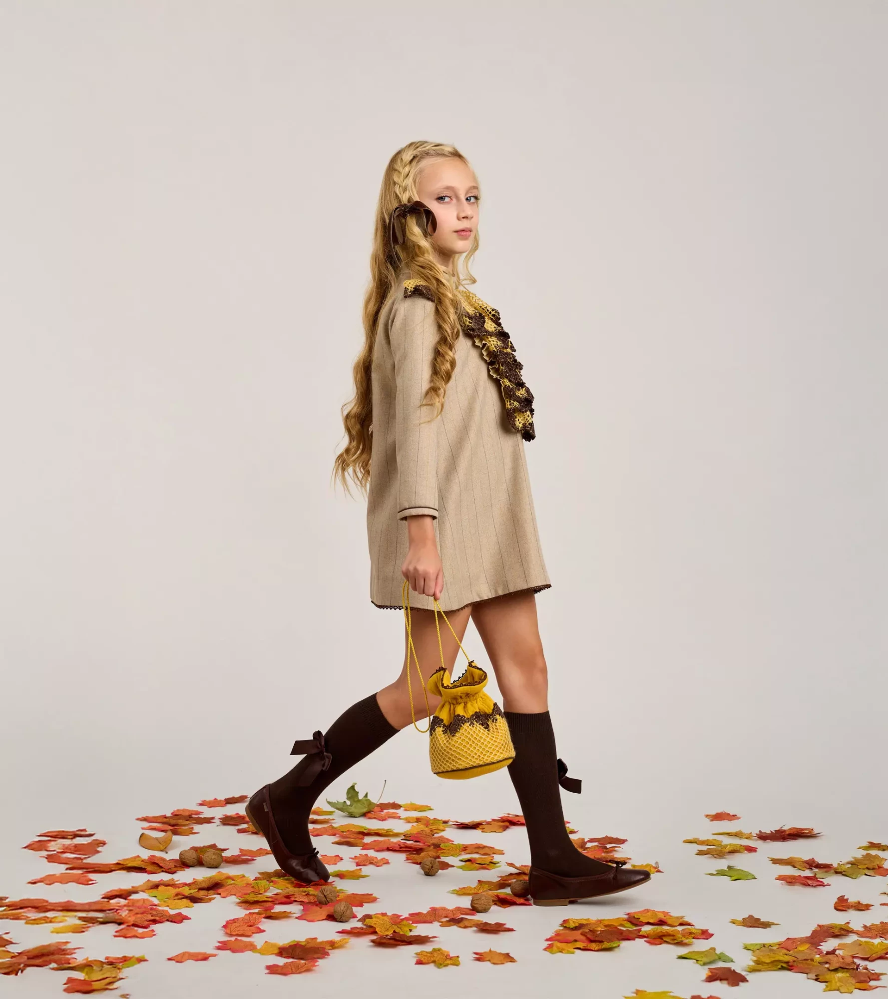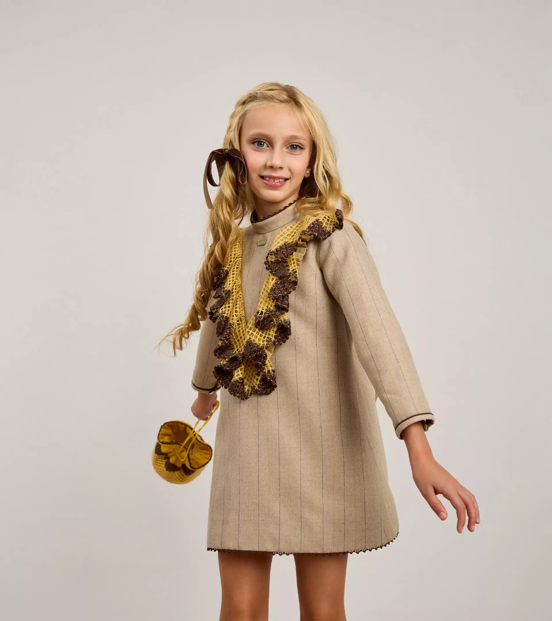 Vestido de niña acampanado, en tejido de espigas y rayas , muy suave, en color topo , adornado en el delantero con un volante de lana en color marrón en forma de pico. Mangas rectas con abertura en el bajo de la manga y rematada en un vivo, con un botón. Abierto en la espalda con cremallera. Cuello de tirilla, rematado en guipur marrón.