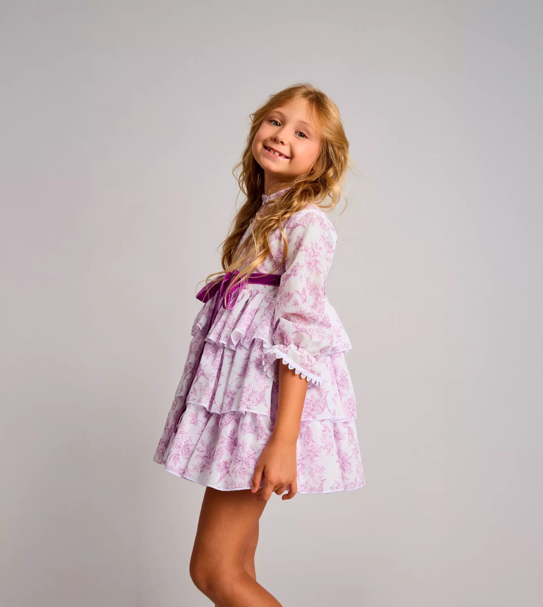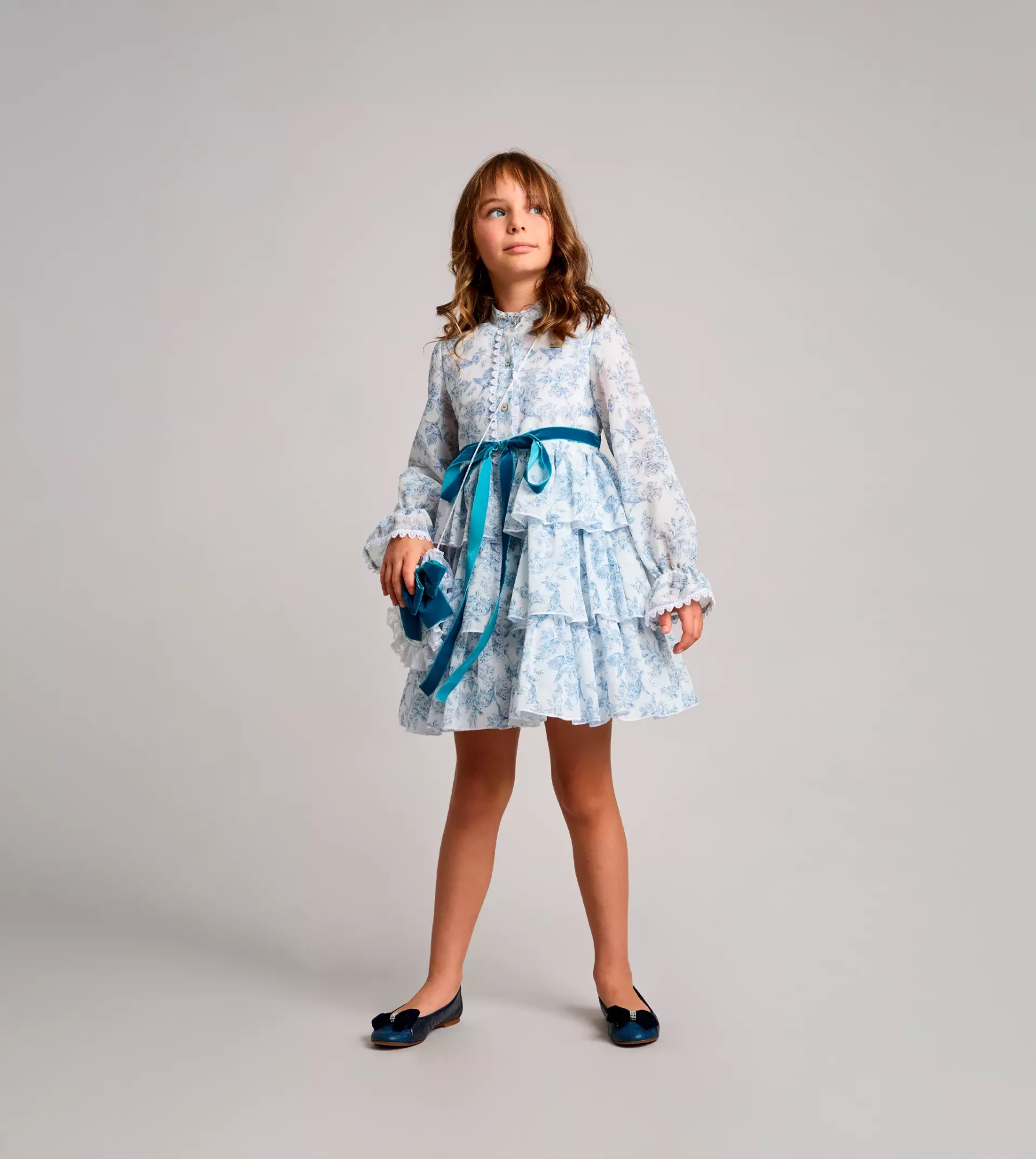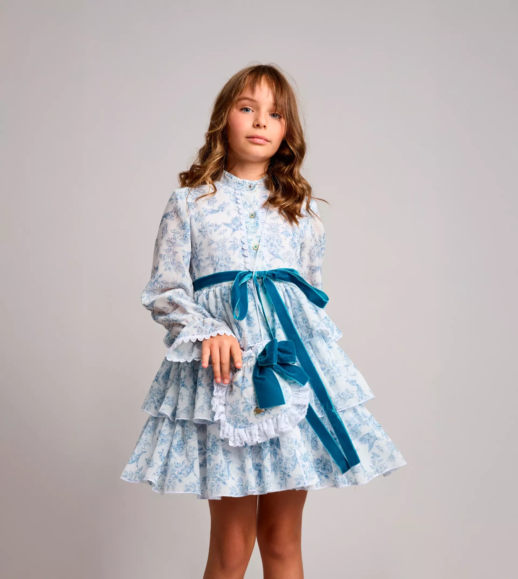 Vestido camisero con mucho vuelo y peso ligero, en tejido de hilo estampado, con falda de tres volantes, abierto en el delantero, mangas largas con goma en el puño acabado en volante y lazo de terciopelo.