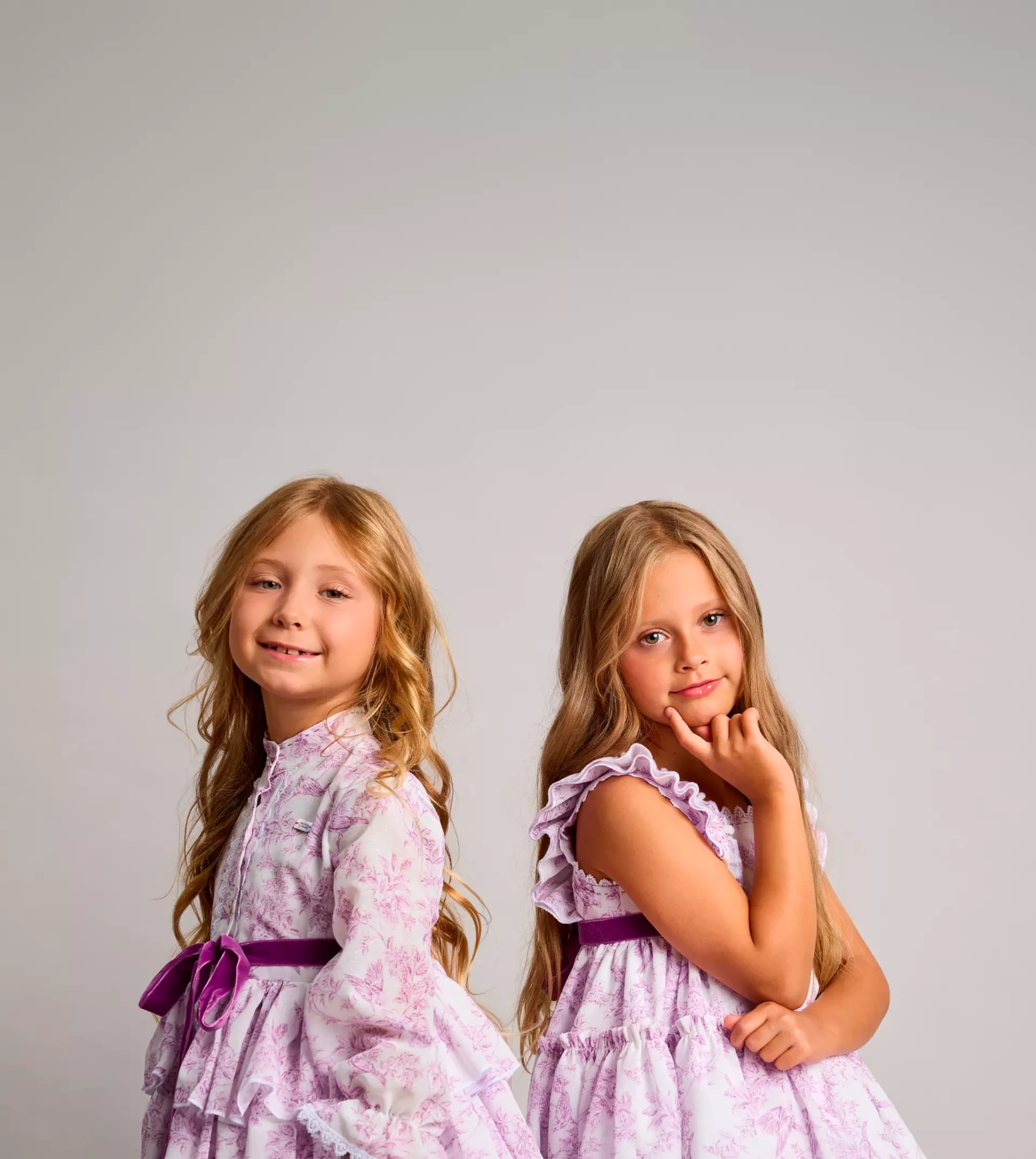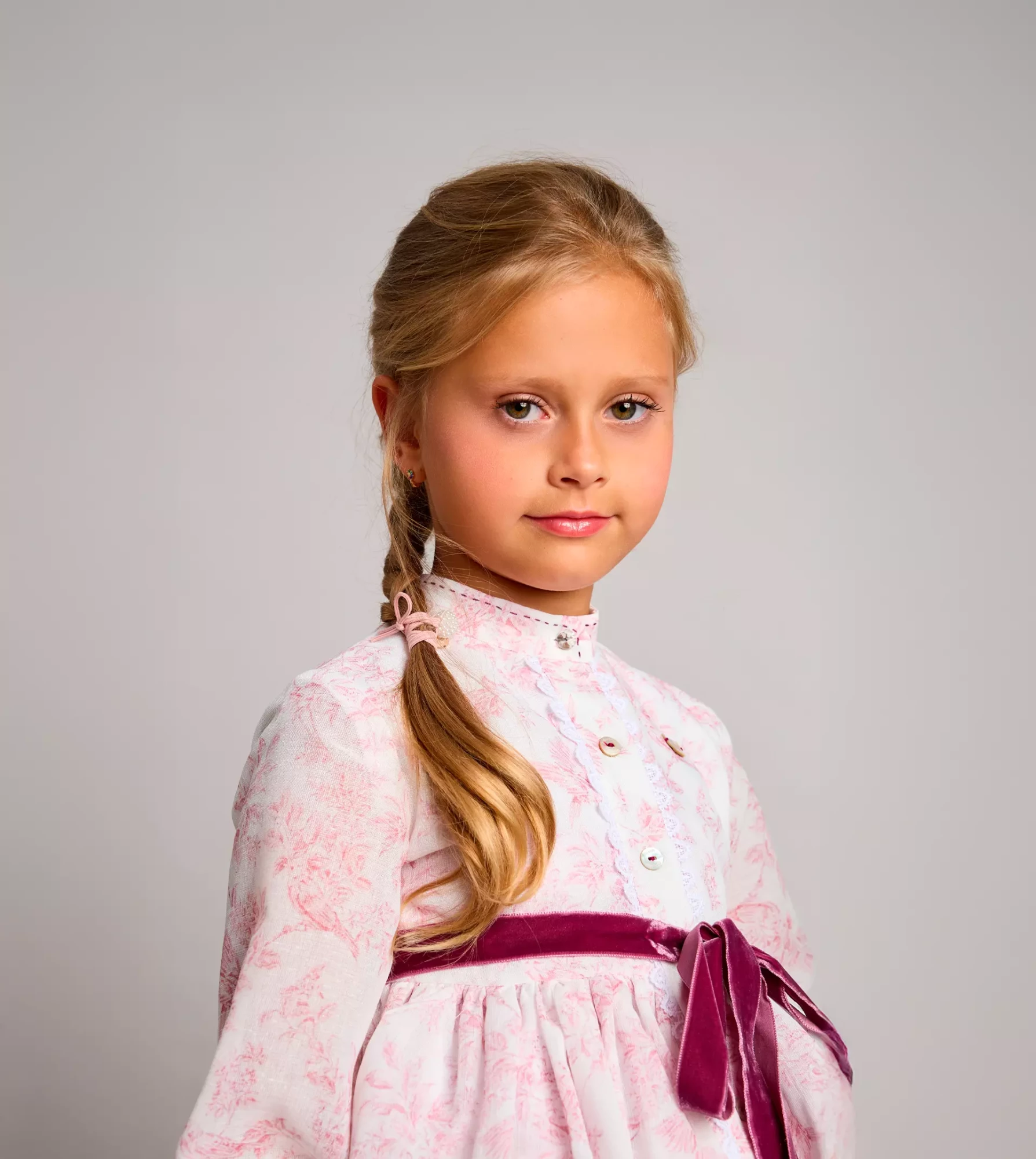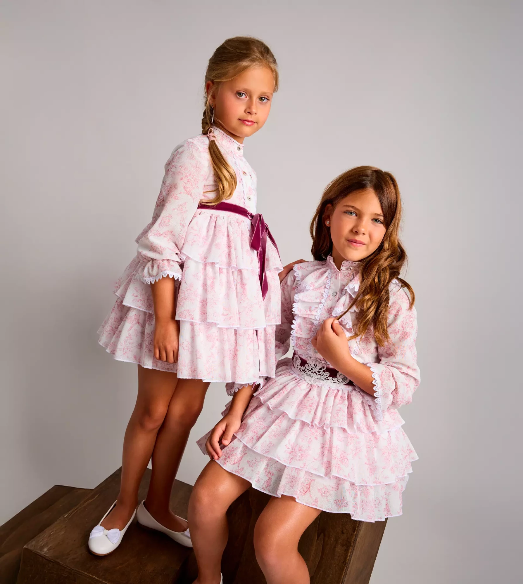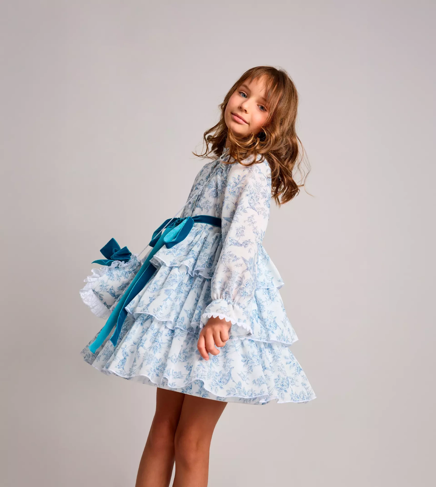 Vestido camisero con mucho vuelo y peso ligero, en tejido de hilo estampado, con falda de tres volantes, abierto en el delantero, mangas largas con goma en el puño acabado en volante y lazo de terciopelo.