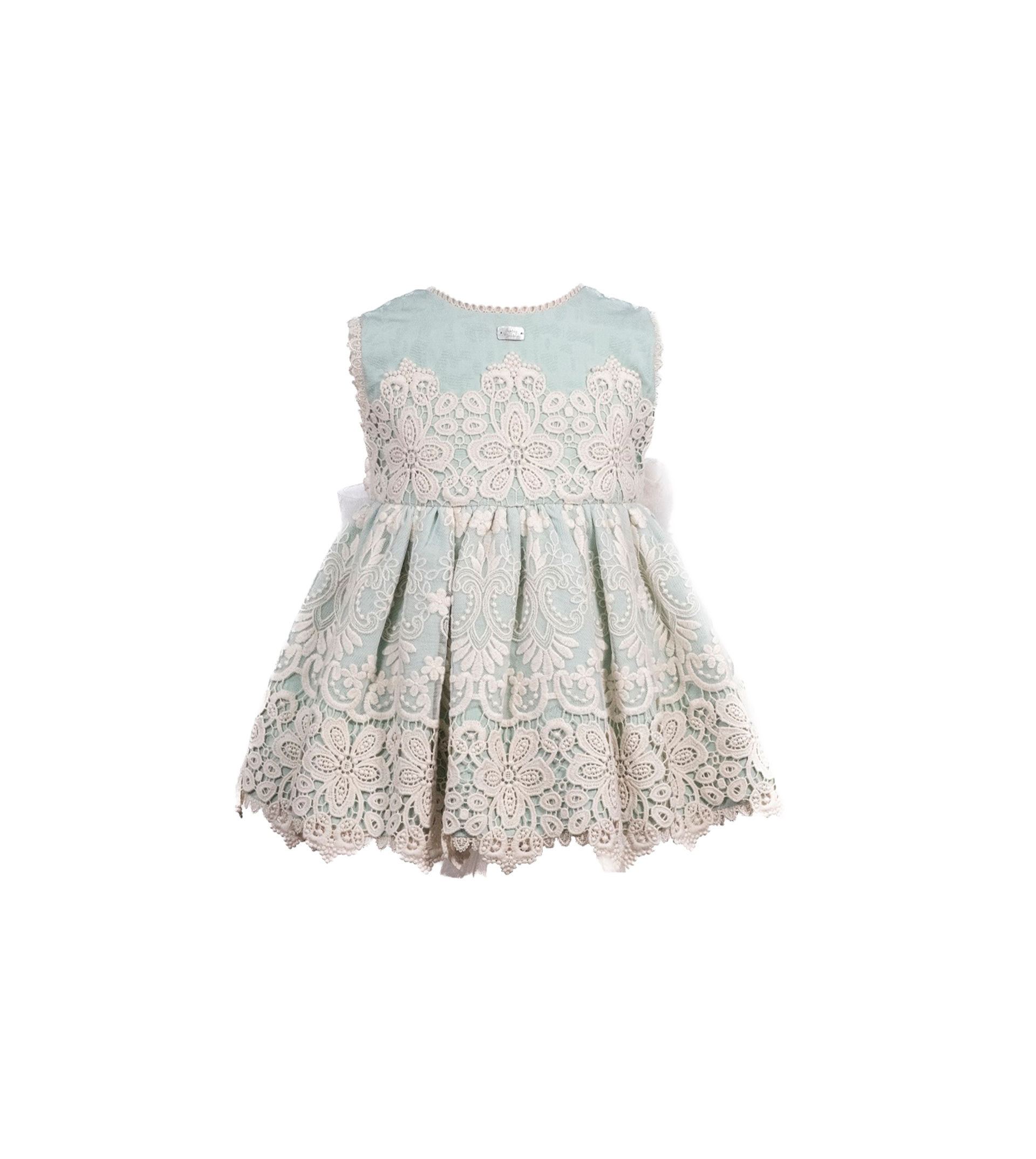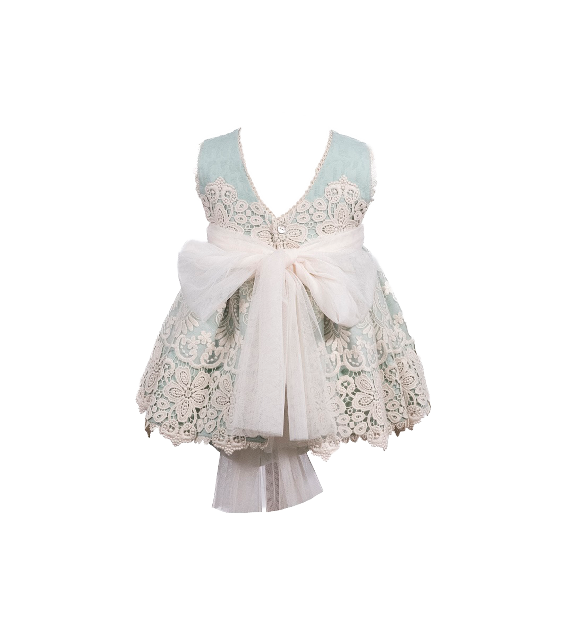 Vestido de talle alto en tejido jacquard y tul bordado con guipur, abierto en la espalda , mangas a la sisa y lazo de tul en espalda.