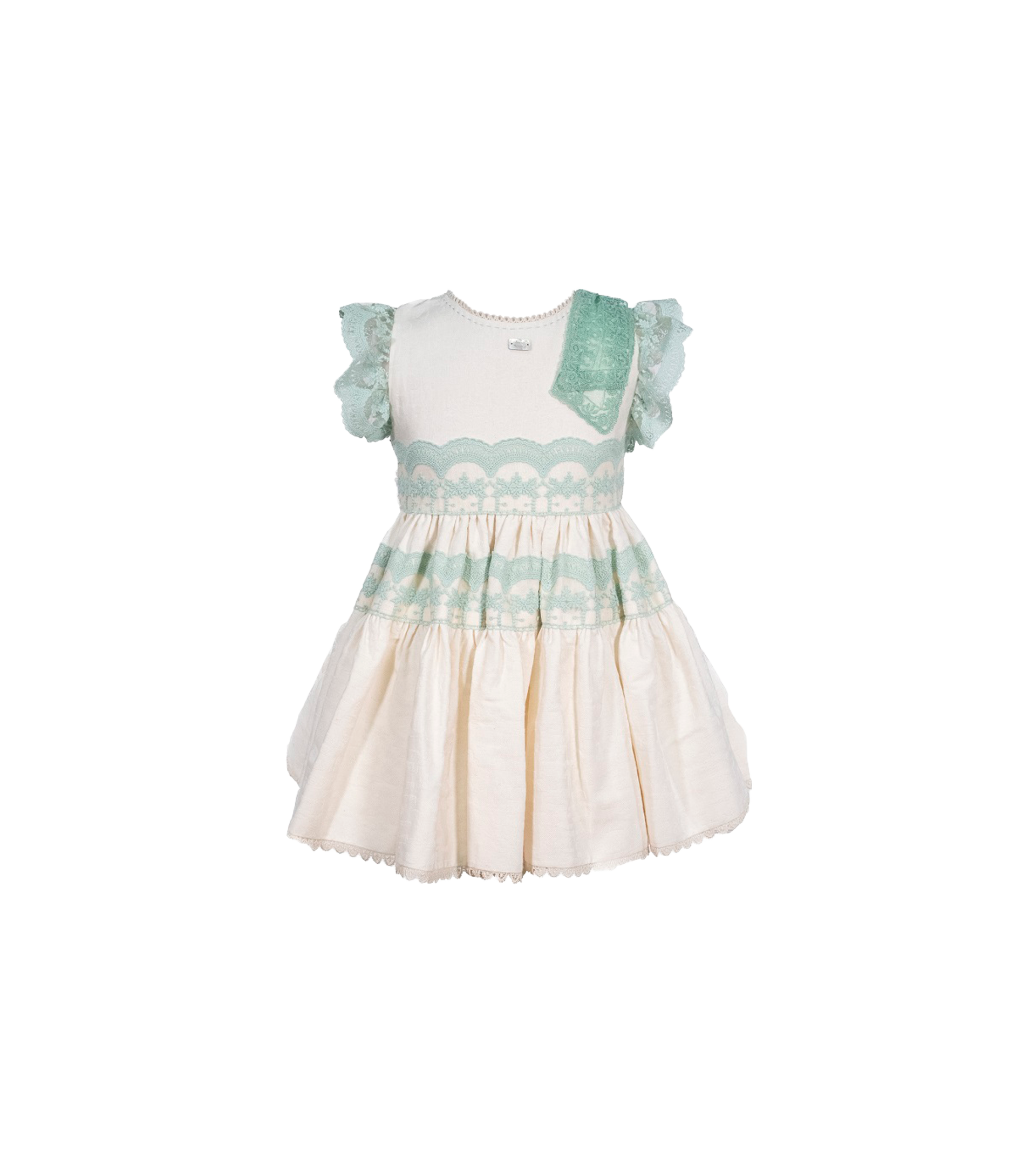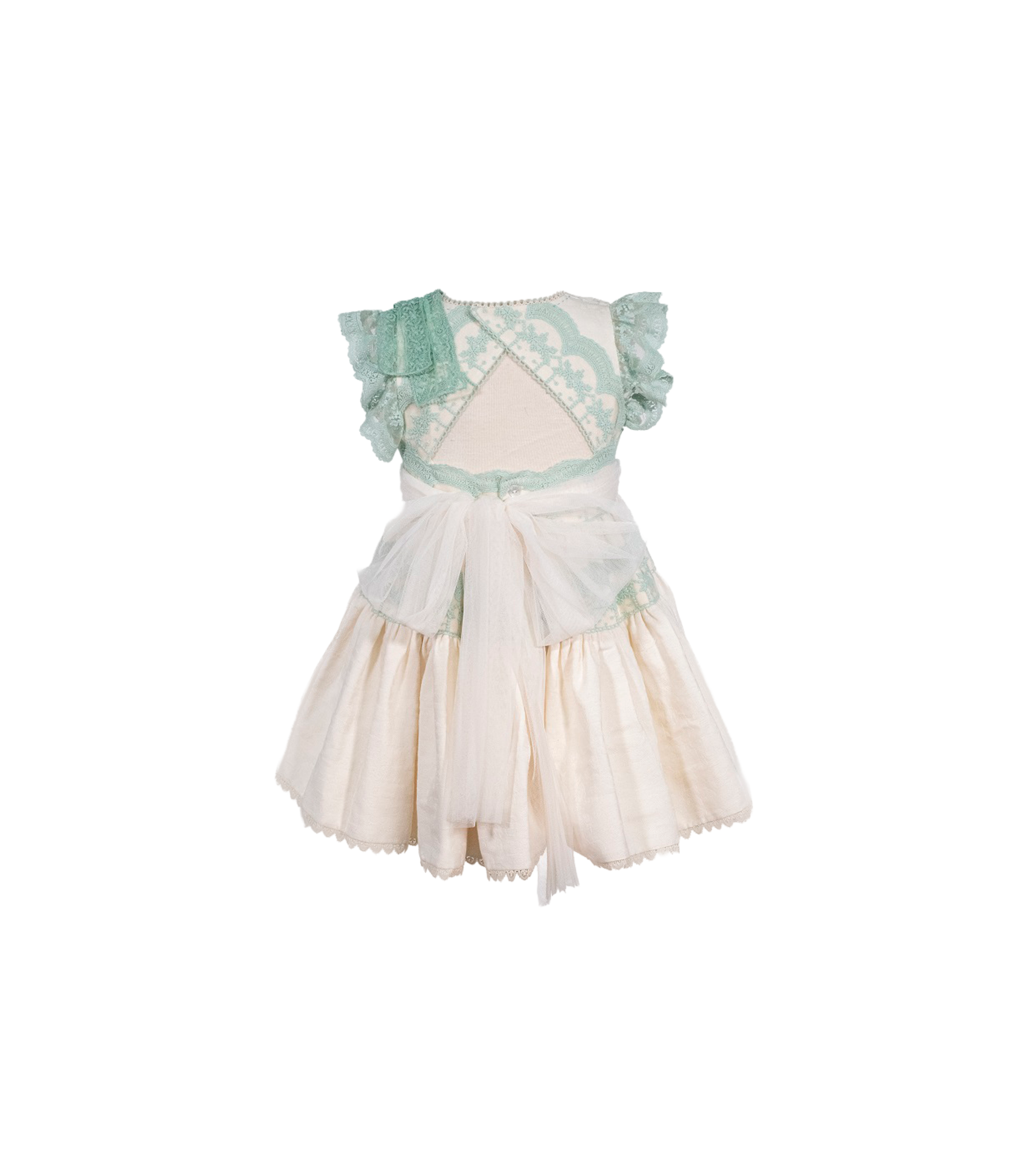 Vestido de talle alto, con escote en la espalda en forma de triángulo, en tejido jacquard con adornos en hombro izquierdo y falda con mucho vuelo.